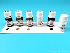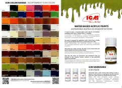 Auch ICM ist mittlerweile in das Farbgeschäft eingestiegen. Die Palette umfasst aktuell 77 Farbtöne mit jeweils 12ml Inhalt (Incl. 3 Klarlacke, Basisfarben etc.). Dazu kommt noch eine Reihe von Sets (Jeweils fünf Farben und ein Klarlack). Sechs Grundierungen mit 17ml runden das Angebot ab. Das vorliegende Set kommt mit fünf Farbtönen und einem Klarlack in 12ml Kartuschen zum Endverbraucher. Im Einzelnen: