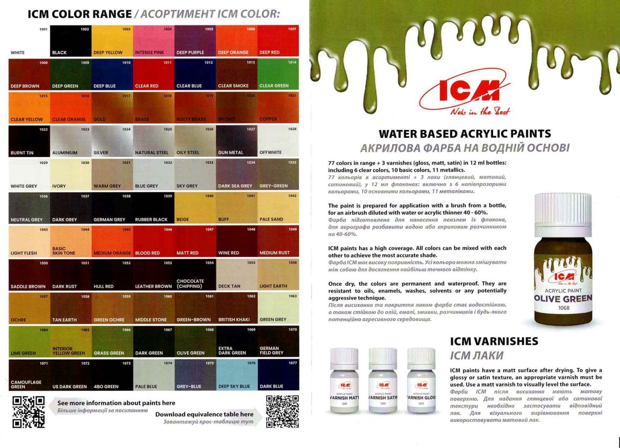 Die Farben machen auf den ersten Blick keinen schlechten Eindruck. Ausgelegt sind sie zur Verwendung mit dem Pinsel während bei gebrauch einer Airbrush laut Hersteller 40-60% Wasser oder Verdünner zugesetzt werden sollten. Eine Reinigung des Werkzeugs sollte ebenfalls mit Wasser erfolgen können… Die Konsistenz der Farben würde ich ungefähr mit der von einem Joghurt gleichsetzten, also recht zäh. Bei Verwendung mit einem Pinsel dürfte ein kleiner Zusatz von Wasser hilfreich sein. Die Deckkraft ist jedoch gut und ausreichend. Negativ fällt auf, das, nachdem der Deckel aufgeschraubt ist, das Fehlen eines Tropfenzählers oder etwas vergleichbarem. Entnahme also nur durch Schrägstellung/Kippen des Gebindes oder mit Hilfe einer Pipette. Zum Aufmischen der Farbe sollte auf jeden Fall eine kleine Stahlkugel eingebracht werden. Was mir ebenfalls nicht gefällt ist die Füllmenge der Gebinde, die meines Erachtens viel zu gering ist. Ebenfalls nicht schön ist die Tatsache, das bei den Farben keine RAL, RLM oder FS Nummern angegeben sind. Farbsets liegen im Verkauf bei rund EUR 10,00 und einzelne Kartuschen bei circa EUR 2,00. Leider kann mich die Farbpalette von ICM nicht überzeugen. Das soll aber nicht als Credo verstanden werden. Hier darf und soll jeder seine Wahl treffen.