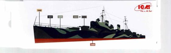 Die Palette der von ICM angebotenen Farben umfasst aktuell 77 Farbtöne mit jeweils 12ml Inhalt (Incl. 3 Klarlacke, Basisfarben etc.). Dazu kommen laufend neue Sets heraus die auf die jeweiligen Bausätze von ICM abgestimmt sind. Sechs Grundierungen mit 17ml runden das Angebot ab. Das vorliegende Set kommt mit fünf Farbtönen (Grundfarben) und einem Primer (17ml) in 12ml Kartuschen zum Endverbraucher. Im Einzelnen: 1034 Dark Sea Grey Die Farben machen auf den ersten Blick keinen schlechten Eindruck. Ausgelegt sind sie zur Verwendung mit dem Pinsel während bei Gebrauch einer Airbrush laut Hersteller 40-60% Wasser oder Verdünner zugesetzt werden soll. Eine Reinigung des Werkzeugs sollte ebenfalls mit Wasser erfolgen… Die Konsistenz der Farben würde ich ungefähr mit der von Joghurt gleichsetzten, also recht zäh. Bei Verwendung mit einem Pinsel dürfte ein kleiner Zusatz von Wasser hilfreich sein. Die Deckkraft ist jedoch gut und ausreichend. Negativ fällt auf, das nachdem der Deckel aufgeschraubt ist, das Fehlen eines Tropfenzählers oder etwas Vergleichbarem. Entnahme also nur durch Schrägstellung/Kippen des Gebindes oder mit Hilfe einer Pipette. Zum Aufmischen der Farbe sollte auf jeden Fall eine kleine Stahlkugel eingebracht werden. Was mir ebenfalls nicht gefällt ist die geringe Füllmenge der Gebinde, die meines Erachtens mit 12ml viel zu gering ist. Ebenfalls nicht schön ist die Tatsache, das bei den Farben keine RAL, RLM oder FS Nummern angegeben sind. Farbsets liegen im Verkauf bei rund EUR 10,00 und einzelne Kartuschen bei circa EUR 2,00. Leider kann mich die Farbpalette von ICM nicht so ganz überzeugen. Mir persönlich ist das Händling zu aufwändig. Zudem dürften sich durch die relativ geringe Anzahl an Farben u.U. Mischorgien ergeben. Die in den Sets angebotenen Farben stimmen auch nicht immer mit den Originalfarben überein. Das soll aber nicht als Credo verstanden werden. Jeder darf und soll seine Wahl treffen.