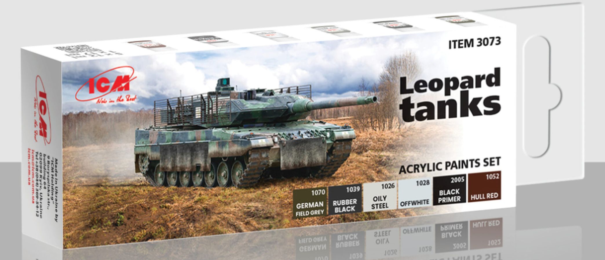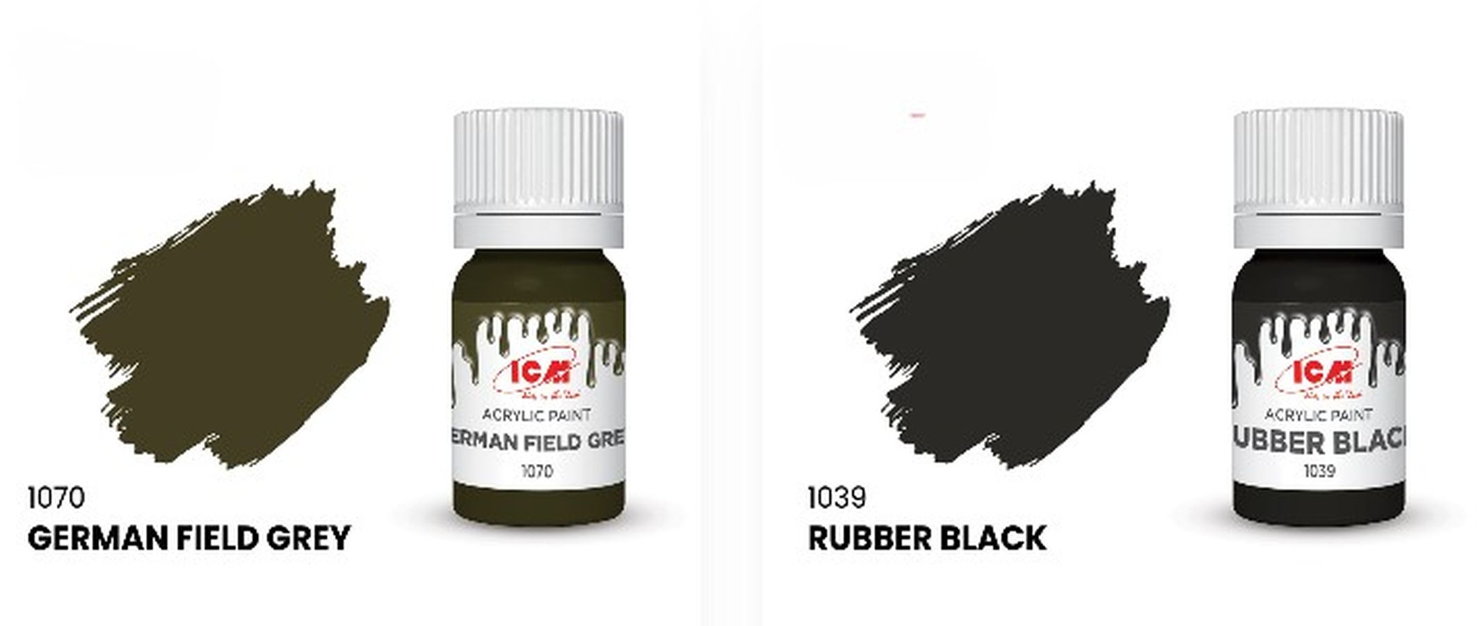 Die Palette der von ICM angebotenen Farben umfasst aktuell 77 Farbtöne mit jeweils 12ml Inhalt (Incl. 3 Klarlacke, Basisfarben etc.). Dazu kommen laufend neue Sets heraus die auf die jeweiligen Bausätze von ICM abgestimmt sind. Sechs Grundierungen mit 17ml runden das Angebot ab. Das vorliegende Set kommt mit fünf Farbtönen (Grundfarben) und einem Primer (17ml) in 12ml Kartuschen zum Endverbraucher.