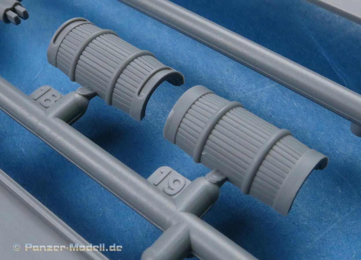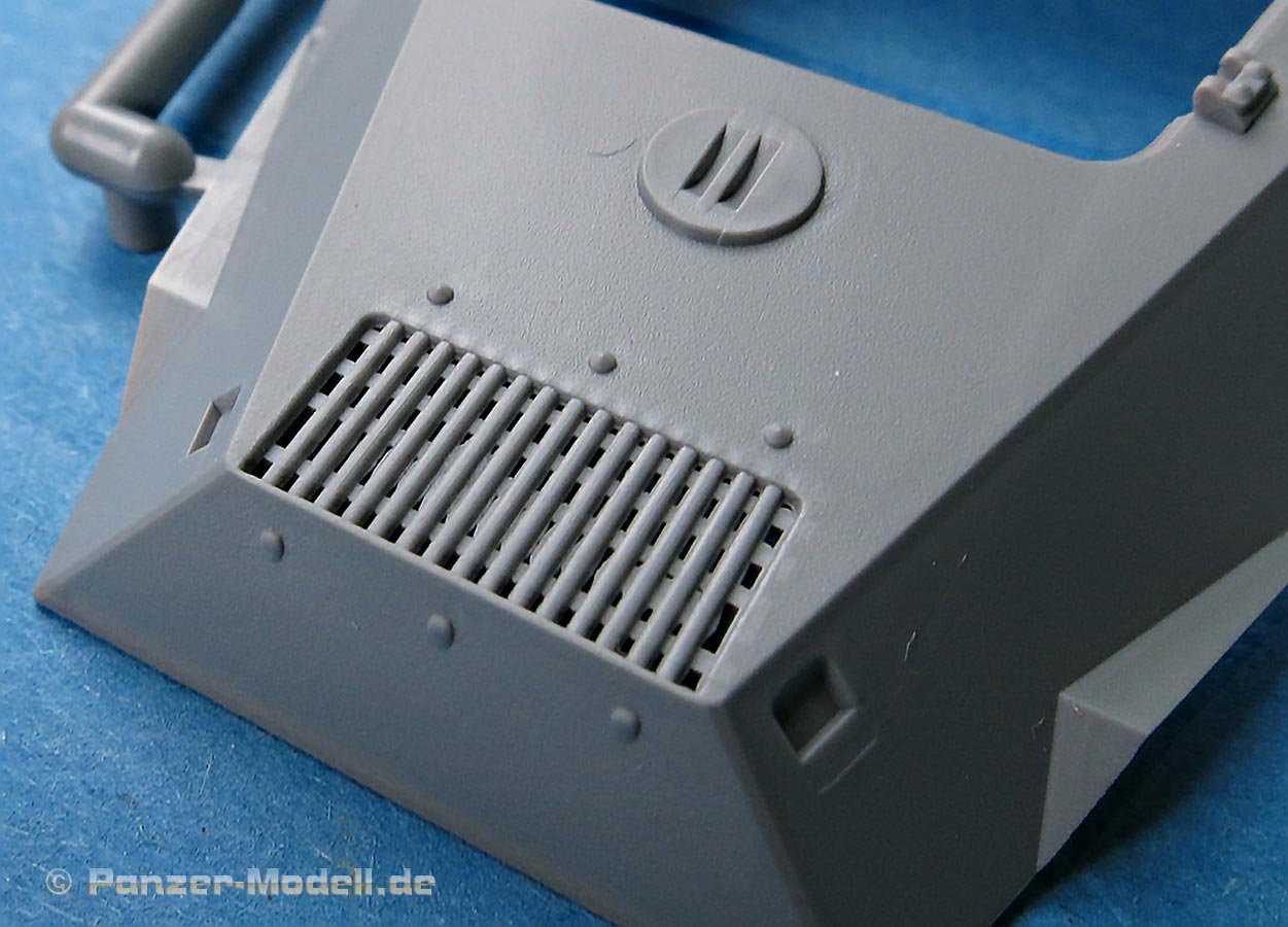 Für den Motorraum liegt ein kompletter und recht schön detaillierter Motor inklusive Kühler und Lüfter bei. Da die Oberwanne die Motorluke mit einzelnen Klappen bereithält, kann man diese auch offen darstellen, was eine schöne Gestaltungsoption ist. Der Lufteinlass vorn auf der Motordeckplatte ist dargestellt, wie es bei der Ausf.A korrekt ist - allerdings ein wenig grob.