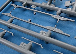 Im Bausatzkarton finden wir 6 graue und einen transparenten Spritzling, zwei Vinylketten, zwei Vinylreifen und ein Decalbogen.