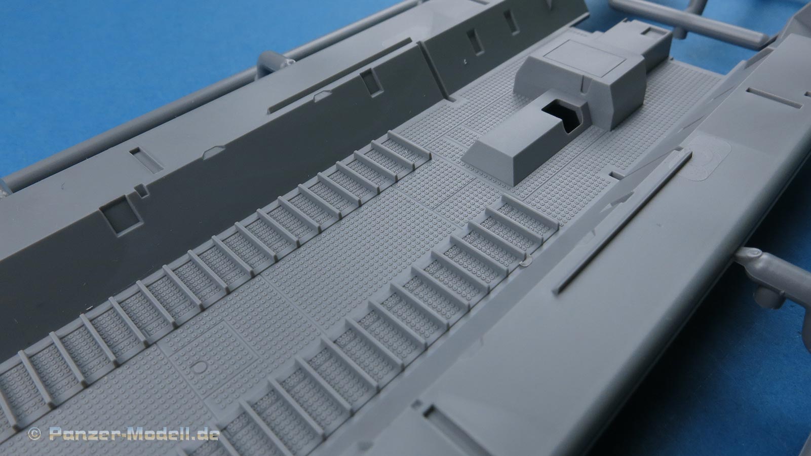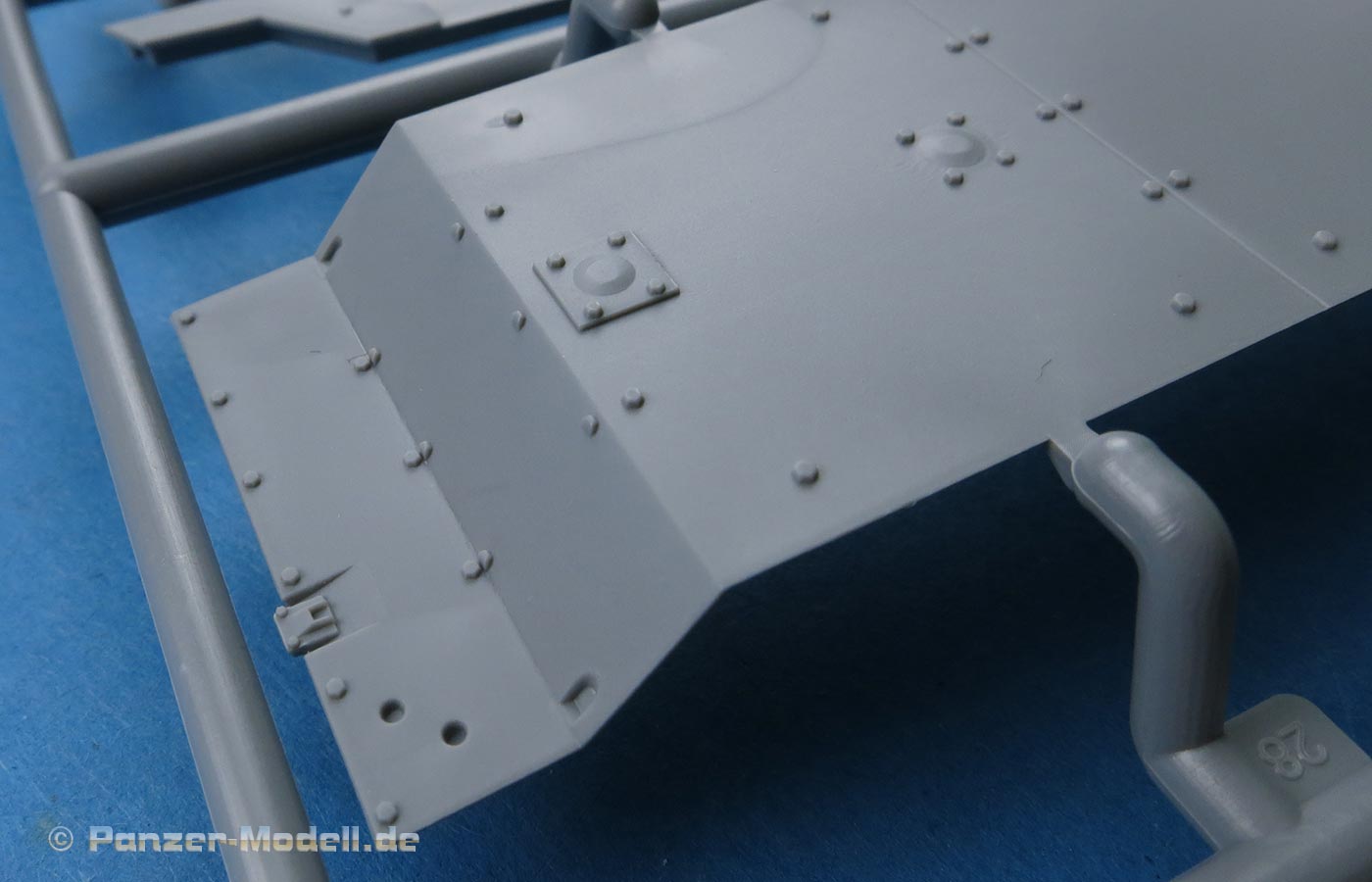 Die Bodenplatte weist ein schönes raues Riffelblechmuster auf und natürlich die Ausbuchtungen für Getriebe und Blechstöße der einzelnen Platten und Zugangsklappen.