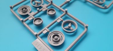 Die Räder sind aus Plastikteilen für die Felgen und Reifen aus weichem Vinyl.