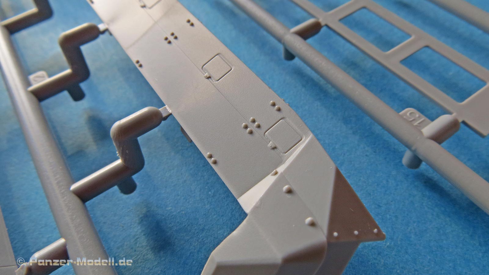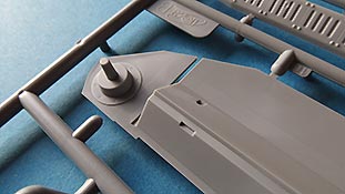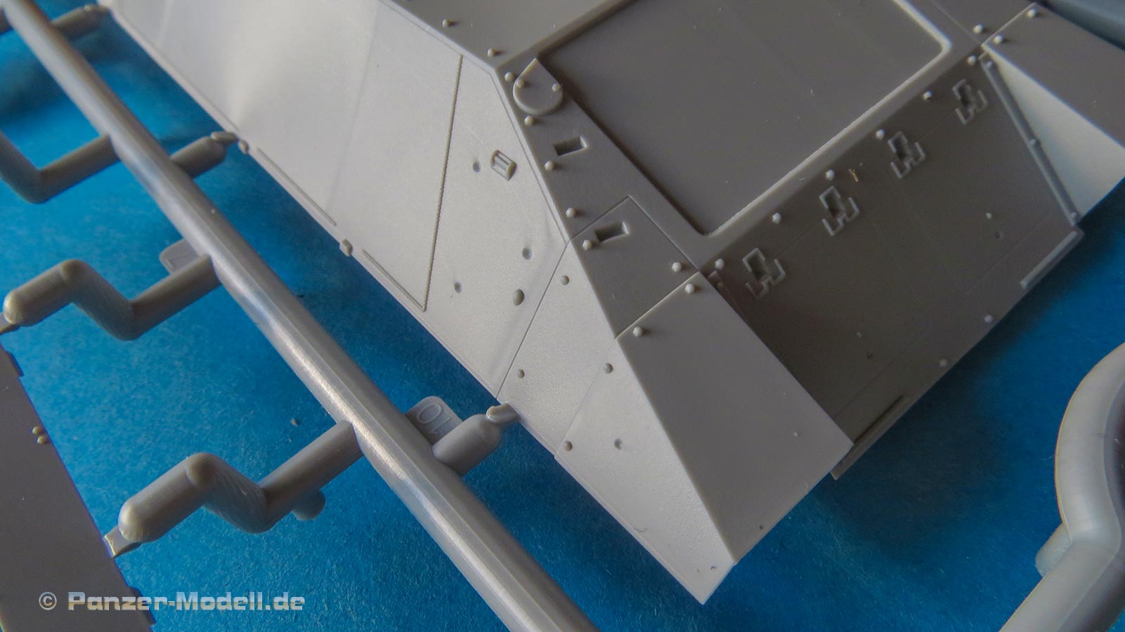 Die gekeilten Seitenstücke im Laufwerk zwischen den Kettenumläufen sind ebenfalls einteilig und auch schon mit schönen Oberflächengravuren und Details versehen.