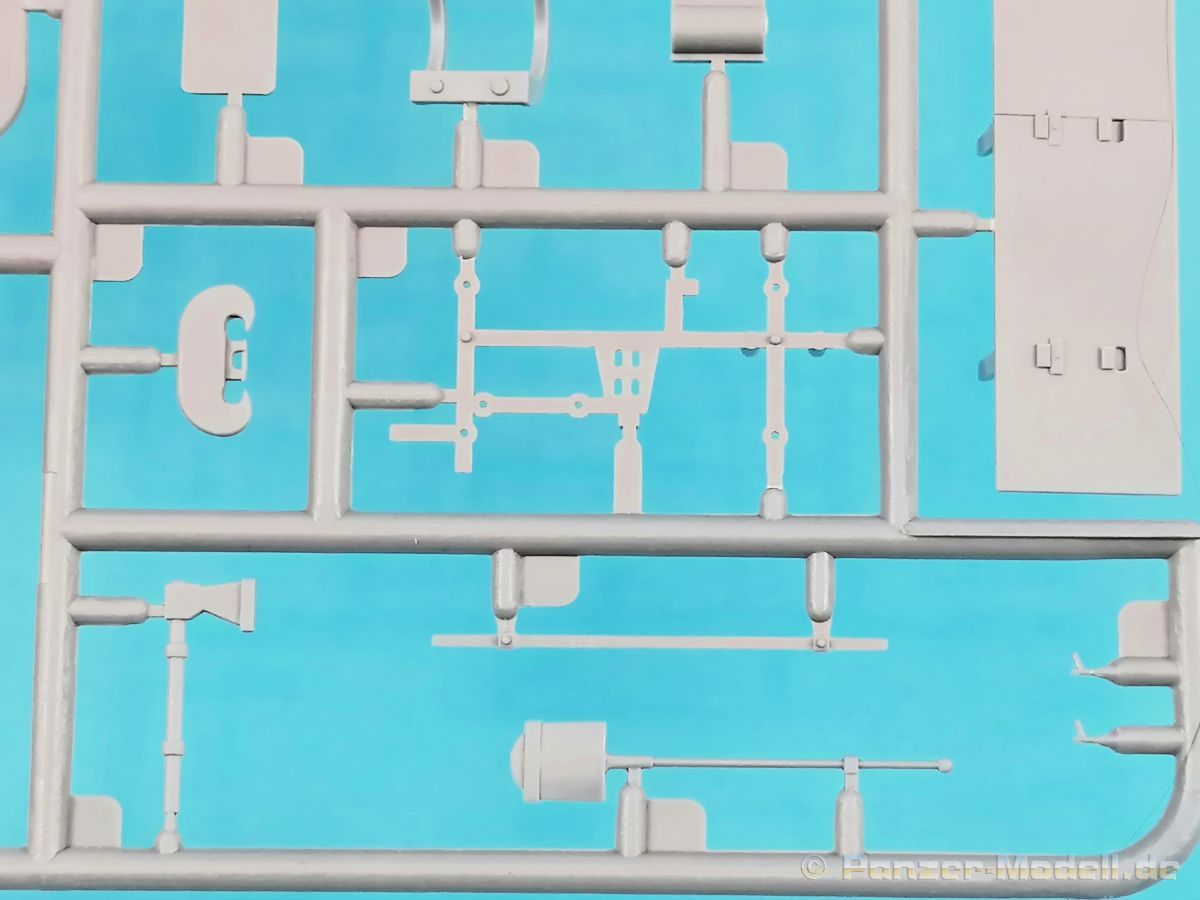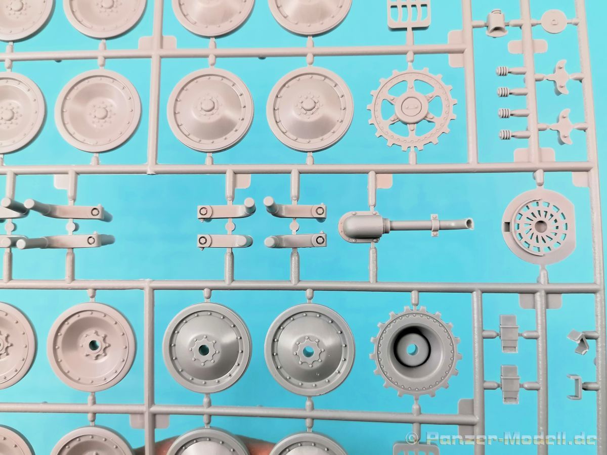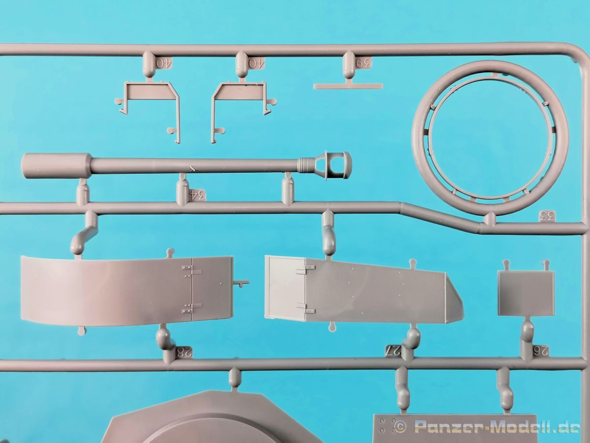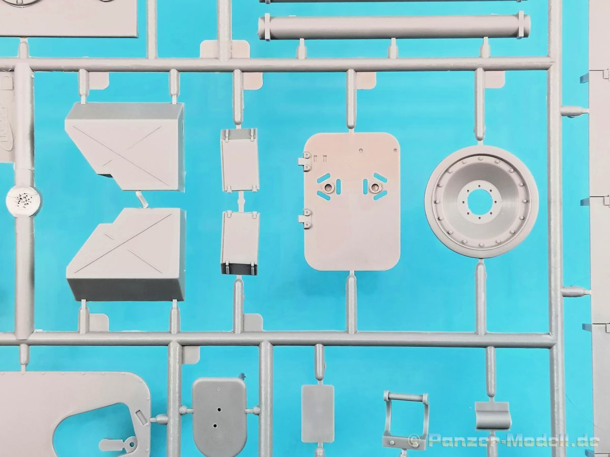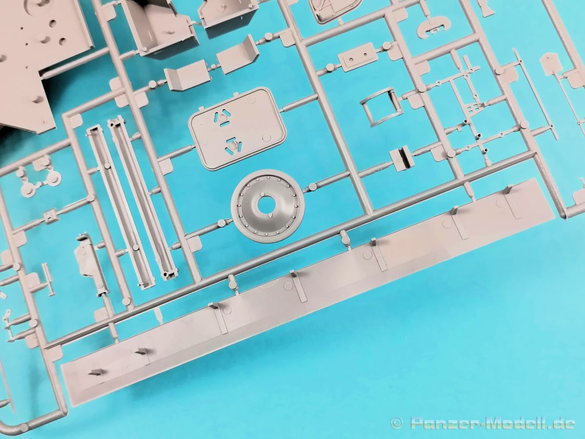 Im Bestand der Schweren Panzerjäger Abteilung 653 fanden sich einige Unikate bzw. vereinzelte interessante Feldumbauten. So auch der genannte Panzer. Grundlage war ein Bergepanther der mit dem Turm eines Pz- IV versehen wurde. Dieser war auf der Wanne fest montiert und nicht drehbar. Das Geschütz war als Attrappe ausgelegt. Dadurch bot sich im Innenraum des Turms unter anderem durch Wegfall des Verschlusses und weiterer Komponenten für die Bedienung der Kanone entsprechend mehr Platz für Kommunikationsgeräte. Der Kit kommt in der bei ICM üblichen stabilen Klappbox mit Stülpkarton daher. Vier graue Rahmen mit Bauteilen für den Panzer, vier schwarze Rahmen zum Bau der Kettentrümmer aus Einzelgliedern, eine Ober- und Unterwanne plus der Bauanleitung und einem kleinen Decalbogen vervollständigen alles. Aktuell m.W. der einzige zur Zeit verfügbare Bausatz. Bei der ersten Durchsicht fällt auf das die Formen der Rahmen A, B, C und die Wannenteile bereits 2005 erstellt wurden. Lediglich der Rahmen D mit den Bauteilen für den Turm wurde neu entwickelt. Sehen wir uns zuerst die älteren Rahmen an. Obwohl die Formen vor mehr als zwei Dekaden erstellt wurden können diese in ihrer Gesamtheit immer noch als gut befunden werden. Formenversatz und Auswerfermarken in sichtbaren Bereichen konnten keine festgestellt werden. (Ausnahme: Die Ketten. Dazu aber später.) Leichte Fischhäute zeigten sich nur an den Auspuffrohren. Etwas merkwürdig sind die fehlenden Nummern der Bauteile auf den Rahmen. Suche anhand der Teileübersicht ist somit angesagt. Nicht schlimm, aber nervig. Alles soweit im grünen Bereich, auch wenn an manchen Stellen die Detaillierung nicht unbedingt mit den heutigen Kits mithalten kann. Tatsächlich können die Räder und Anbauteile immer noch gefallen. Hervorzuheben sind gut umgesetzte kleine Flügelmuttern die ihren Platz auf den vorderen Kettenabdeckungen finden. Ober- und Unterwanne zeugen bei einer Paßprobe von einer sehr guten Passung. Recht gut gemacht kann die Oberflächenstruktur noch überarbeitet werden. Lediglich die Stockwinde und die Auspuffanlage, wenn möglich, würde ich ersetzen. Notwendig ist der Zukauf der Lüftergitter da ICM erneut keine PEs beilegt. Und damit kommen wir zu den Ketten, die als Einzelglieder vorliegen. An zwei Punkten sind diese jeweils mit dem Rahmen verbunden. Nett gemacht, allerdings weisen diese an den Außenseiten zwei unschöne Auswerfermarken auf die sich schwer versäubern lassen dürften. Wer sich diese Arbeit ersparen will dürfte ebenfalls Ersatz im Aftermarketbereichfinden… Der Turm ist aus neuen Formen und mehrteilig aufgebaut. Hier finden sich nette Details die gefallen. Leider sind alle Luken und Öffnungen nur im geschlossenen Zustand vorhanden. Schade! Vorsicht bei dem Bau dieses Konstrukts sollte obligatorisch sein. Das Rohr der Kanonenattrappe ist zweiteilig mit den üblichen Nachteilen beim Zusammenbau. Die Bauanleitung, 12-seitig in der für ICM typischen Ausführung führt in 43 Schritten zum Ziel. Auf der ersten Seite gibt es einen kleinen Abriß zum Panzer sowie die Farblegende aus der hauseigenen Produktion. Wie üblich belegen Seite zwei und drei die Bauteileübersicht bevor der Bau startet. Alle Bauschritte sind wie gewohnt übersichtlich und mit wenigen Bauteilen versehen. Begonne wird klassisch mit der Unterwanne, dem Heck, dem Laufwerk und weiteren Anbauteilen. Nachdem auch die Oberwanne vervollständigt wurde ist dieses Konstrukt mit der Stufe 25 beendet. Das Behältnis für das Rohrreinigungsgerät (Nr. 20 in Abschnitt 23 ist nicht zu verwenden. Die restlichen Abschnitte zeigen den Bau des Turms mit Schürzen bis hin zur Montage (fix!) auf der Oberwanne. Da es sich bei diesem Einzelstück um einen Feldumbau handelte ist nur ein Bemalungsvorschlag für die PzJg. Atlg. 653 vorhanden. Einsatzzeit 1944 in der Ukraine. Die beiliegenden Decals sind von ICM selbst hergestellt machen einen sehr guten Eindruck. Im Register und randscharf auf einem dünnen Trägermaterial. Sehr schön. Was bleibt? Unter dem Strich haben wir es mit einem recht soliden Bausatz zu tun bei dem es Licht und Schatten gibt. Da ist einmal der leichte Mangel an mehr Details an den alten Formen wie sie dem heutigen Detaillierungsgrad entsprechen. Weiter ist eine Kette wie die vorliegende qualitativ so nicht mehr zeitgemäß, ebenso ein Turm bei dem nicht einmal das Turmluk geöffnet darstellbar ist. Auf der anderen Seite dürfte dieser Bausatz gerade auch bei Anfängern geeignet sein. Versierte Modellbauer dürften aber auch Freude an dem Kit haben, kann dieser Panzer sicherlich durch Eigeninitative noch weiter aufgewertet werden. Lediglich den Preis finde ich für das Gebotene etwas zu hoch, vor allem, wenn man den Zukauf weiterer Produkte wie Ketten etc. in’s Kalkül zieht. Das ist aber Ansichtssache.