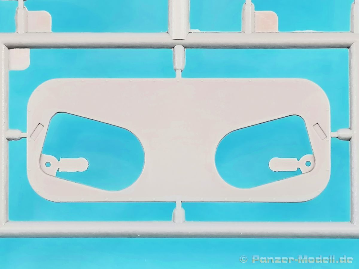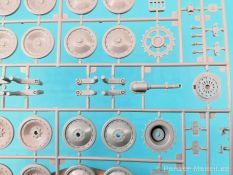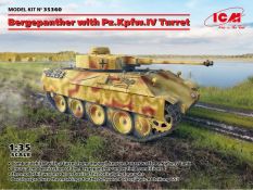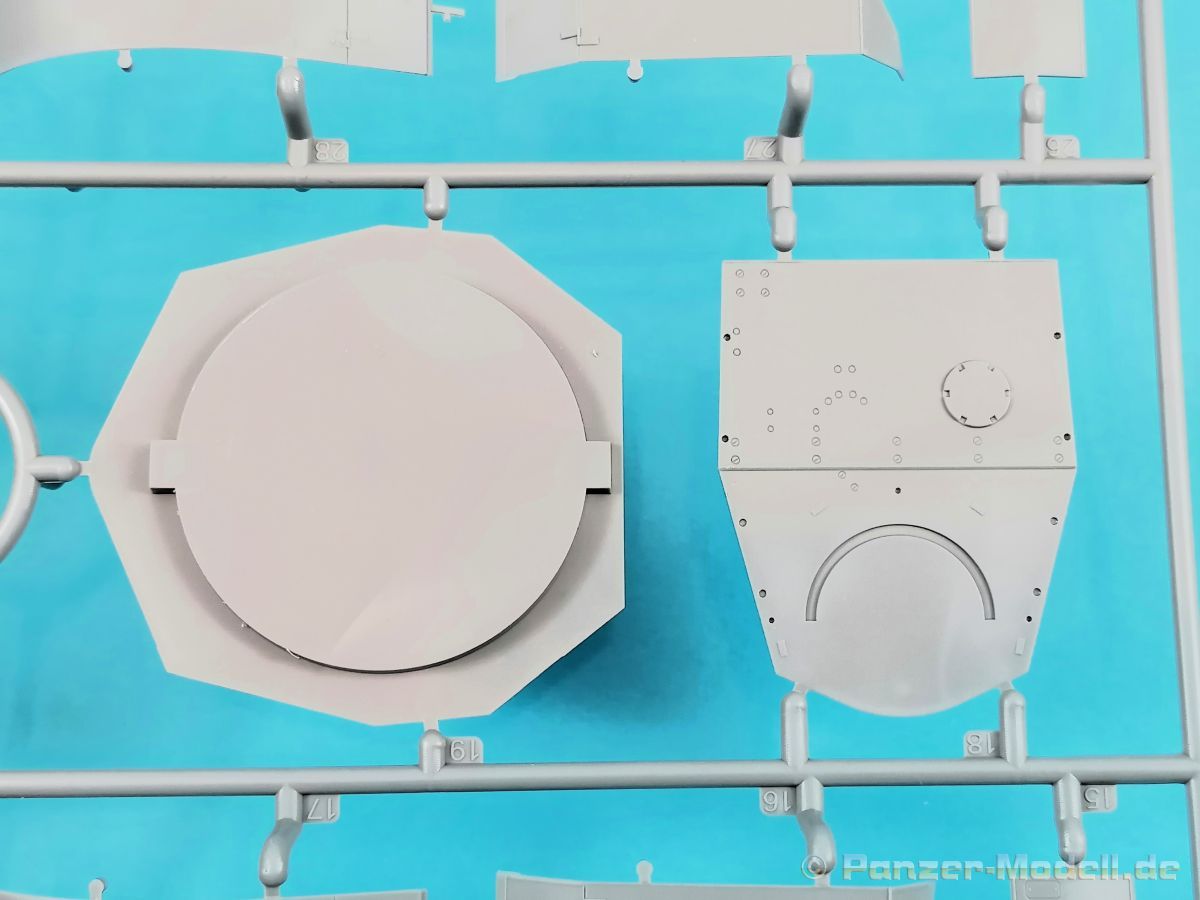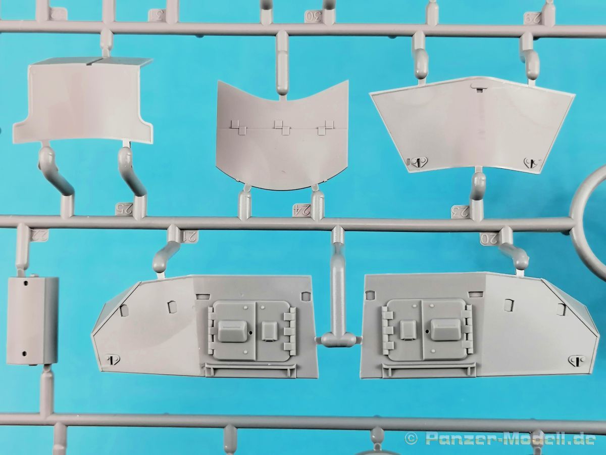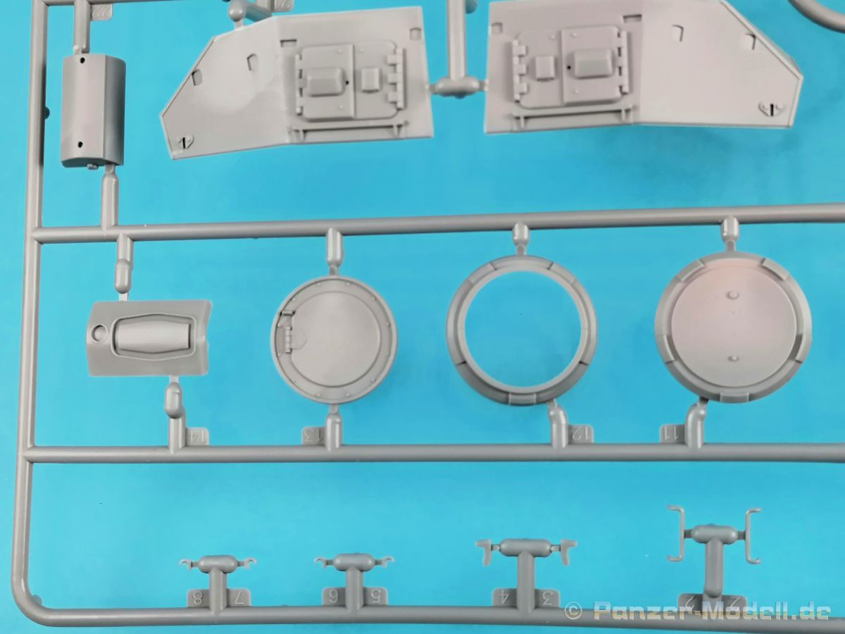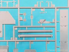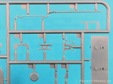 Im Bestand der Schweren Panzerjäger Abteilung 653 fanden sich einige Unikate bzw. vereinzelte interessante Feldumbauten. So auch der genannte Panzer. Grundlage war ein Bergepanther der mit dem Turm eines Pz- IV versehen wurde. Dieser war auf der Wanne fest montiert und nicht drehbar. Das Geschütz war als Attrappe ausgelegt. Dadurch bot sich im Innenraum des Turms unter anderem durch Wegfall des Verschlusses und weiterer Komponenten für die Bedienung der Kanone entsprechend mehr Platz für Kommunikationsgeräte. Der Kit kommt in der bei ICM üblichen stabilen Klappbox mit Stülpkarton daher. Vier graue Rahmen mit Bauteilen für den Panzer, vier schwarze Rahmen zum Bau der Kettentrümmer aus Einzelgliedern, eine Ober- und Unterwanne plus der Bauanleitung und einem kleinen Decalbogen vervollständigen alles. Aktuell m.W. der einzige zur Zeit verfügbare Bausatz. Bei der ersten Durchsicht fällt auf das die Formen der Rahmen A, B, C und die Wannenteile bereits 2005 erstellt wurden. Lediglich der Rahmen D mit den Bauteilen für den Turm wurde neu entwickelt. Sehen wir uns zuerst die älteren Rahmen an. Obwohl die Formen vor mehr als zwei Dekaden erstellt wurden können diese in ihrer Gesamtheit immer noch als gut befunden werden. Formenversatz und Auswerfermarken in sichtbaren Bereichen konnten keine festgestellt werden. (Ausnahme: Die Ketten. Dazu aber später.) Leichte Fischhäute zeigten sich nur an den Auspuffrohren. Etwas merkwürdig sind die fehlenden Nummern der Bauteile auf den Rahmen. Suche anhand der Teileübersicht ist somit angesagt. Nicht schlimm, aber nervig. Alles soweit im grünen Bereich, auch wenn an manchen Stellen die Detaillierung nicht unbedingt mit den heutigen Kits mithalten kann. Tatsächlich können die Räder und Anbauteile immer noch gefallen. Hervorzuheben sind gut umgesetzte kleine Flügelmuttern die ihren Platz auf den vorderen Kettenabdeckungen finden. Ober- und Unterwanne zeugen bei einer Paßprobe von einer sehr guten Passung. Recht gut gemacht kann die Oberflächenstruktur noch überarbeitet werden. Lediglich die Stockwinde und die Auspuffanlage, wenn möglich, würde ich ersetzen. Notwendig ist der Zukauf der Lüftergitter da ICM erneut keine PEs beilegt. Und damit kommen wir zu den Ketten, die als Einzelglieder vorliegen. An zwei Punkten sind diese jeweils mit dem Rahmen verbunden. Nett gemacht, allerdings weisen diese an den Außenseiten zwei unschöne Auswerfermarken auf die sich schwer versäubern lassen dürften. Wer sich diese Arbeit ersparen will dürfte ebenfalls Ersatz im Aftermarketbereichfinden… Der Turm ist aus neuen Formen und mehrteilig aufgebaut. Hier finden sich nette Details die gefallen. Leider sind alle Luken und Öffnungen nur im geschlossenen Zustand vorhanden. Schade! Vorsicht bei dem Bau dieses Konstrukts sollte obligatorisch sein. Das Rohr der Kanonenattrappe ist zweiteilig mit den üblichen Nachteilen beim Zusammenbau. Die Bauanleitung, 12-seitig in der für ICM typischen Ausführung führt in 43 Schritten zum Ziel. Auf der ersten Seite gibt es einen kleinen Abriß zum Panzer sowie die Farblegende aus der hauseigenen Produktion. Wie üblich belegen Seite zwei und drei die Bauteileübersicht bevor der Bau startet. Alle Bauschritte sind wie gewohnt übersichtlich und mit wenigen Bauteilen versehen. Begonne wird klassisch mit der Unterwanne, dem Heck, dem Laufwerk und weiteren Anbauteilen. Nachdem auch die Oberwanne vervollständigt wurde ist dieses Konstrukt mit der Stufe 25 beendet. Das Behältnis für das Rohrreinigungsgerät (Nr. 20 in Abschnitt 23 ist nicht zu verwenden. Die restlichen Abschnitte zeigen den Bau des Turms mit Schürzen bis hin zur Montage (fix!) auf der Oberwanne. Da es sich bei diesem Einzelstück um einen Feldumbau handelte ist nur ein Bemalungsvorschlag für die PzJg. Atlg. 653 vorhanden. Einsatzzeit 1944 in der Ukraine. Die beiliegenden Decals sind von ICM selbst hergestellt machen einen sehr guten Eindruck. Im Register und randscharf auf einem dünnen Trägermaterial. Sehr schön. Was bleibt? Unter dem Strich haben wir es mit einem recht soliden Bausatz zu tun bei dem es Licht und Schatten gibt. Da ist einmal der leichte Mangel an mehr Details an den alten Formen wie sie dem heutigen Detaillierungsgrad entsprechen. Weiter ist eine Kette wie die vorliegende qualitativ so nicht mehr zeitgemäß, ebenso ein Turm bei dem nicht einmal das Turmluk geöffnet darstellbar ist. Auf der anderen Seite dürfte dieser Bausatz gerade auch bei Anfängern geeignet sein. Versierte Modellbauer dürften aber auch Freude an dem Kit haben, kann dieser Panzer sicherlich durch Eigeninitative noch weiter aufgewertet werden. Lediglich den Preis finde ich für das Gebotene etwas zu hoch, vor allem, wenn man den Zukauf weiterer Produkte wie Ketten etc. in’s Kalkül zieht. Das ist aber Ansichtssache.
