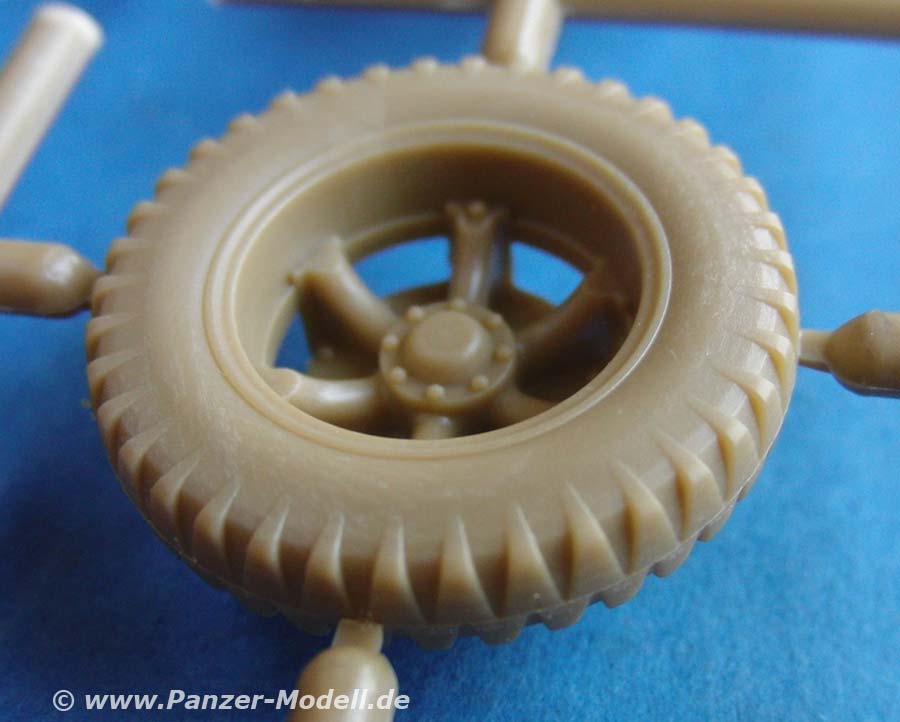 Die Räder fügen sich in das Bild der gut detaillierten Teile ein - das Profil sieht nach echten WW2 Profil aus und auch die Speichenfelgen sind schön dargestellt. Allerdings weisen die Reifen keine Herstellerangaben auf den Flanken auf - das ist recht bedauerlich.