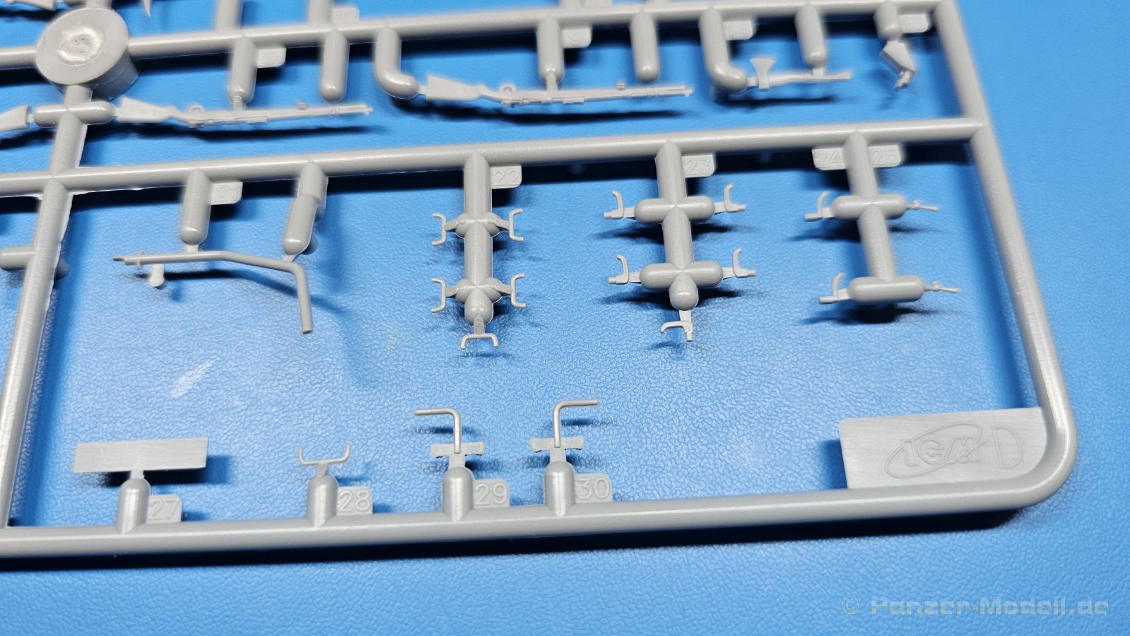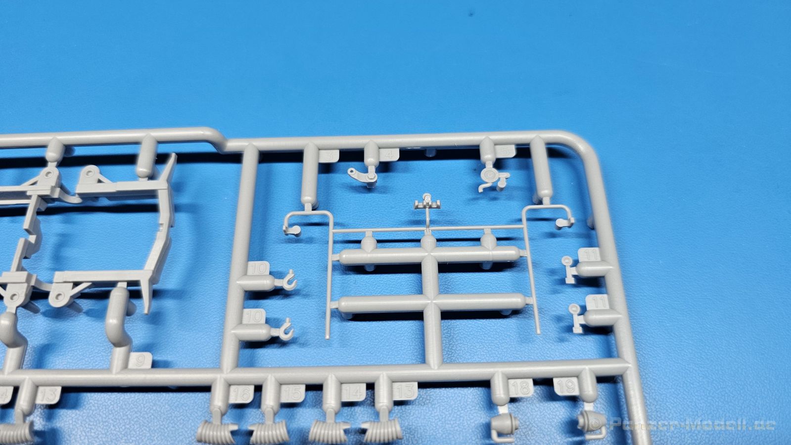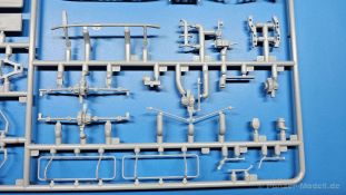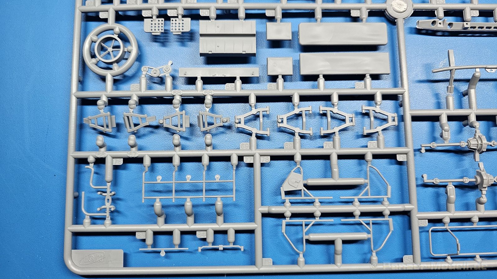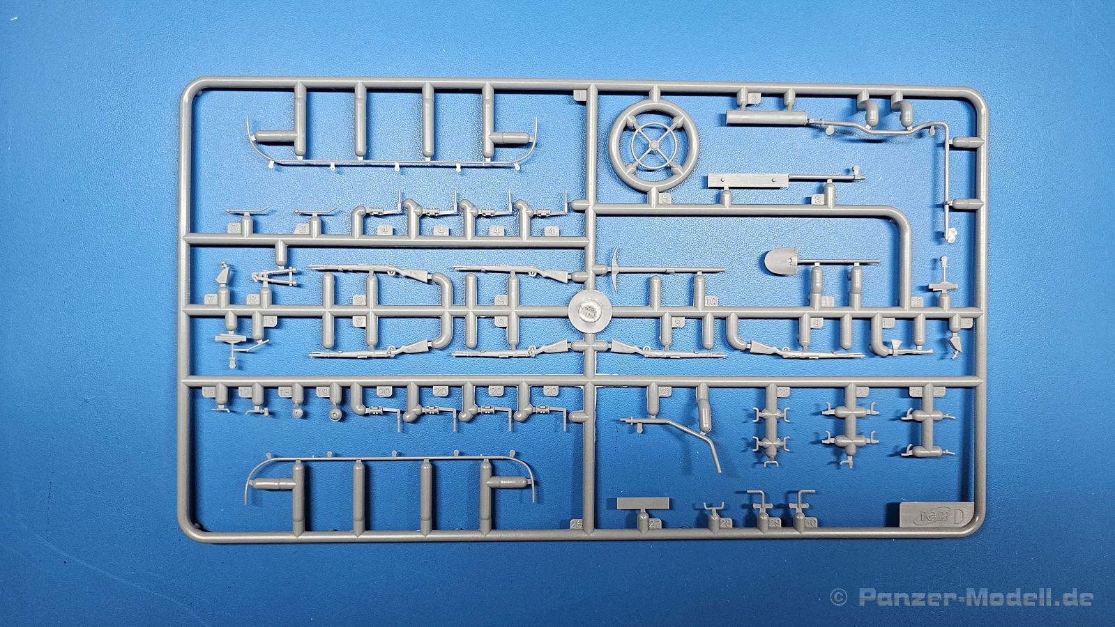 Das Original: Der schwere Einheits-Pkw Kfz.70 war eine der Varianten des Armeefahrzeugs Horch 108 Typ 40. Es wurde ursprünglich von der deutschen Ford-Niederlassung als multifunktionaler militärischer Geländewagen produziert. Der Bausatz: Das Kfz. 70 mit MG 34 ist Nr. 6 in der Reihe der Bausätze/Fahrzeug-Sets des schweren Einheits-Pkws von ICM. Der Karton mit Klappdeckel und darüber gestülptem Farbdeckel ist 310 x 230 x 40 mm groß und recht stabil. Es befinden sich 7 graue Spritzlinge, 1 Klarsicht- und ein Vinylspritzling darin. Dazu kommen die Bauanleitung und der Naßschiebebilderbogen. Die Teile aus hellgrauem Plastik sind sauber ausgespritzt, hier und da mit feinem Grat, aber ohne Versatz. Angüsse sind so gesetzt, dass Details nicht beeinträchtigt werden. Auswerferspuren sind zwar vorhanden, sollten aber auch ohne Nacharbeit nicht stören. Leider weisen die Vinylreifen eine Formtrennnaht auf, die sich aufgrund des elastischen Materials nur mühsam entfernen lässt. Es gibt einige sehr filigrane Teile, die beim Abtrennen vom Spritzling zwar entsprechende Vorsicht verlangen werden, am Modell aber sehr gut aussehen werden. ICM spendiert dem Horch einen Leiterrahmen aus einem Stück, der nur noch durch zusätzliche Querträger, Verstärkungen und Außenträger für den Aufbau ergänzt wird. Lochungen in den Trägern sind sauber ausgeführt. Statt Starrachsen gibt es Einzelradaufhängungen mit je zwei Schraubenfedern, letztere leider zweigeteilt, so dass es eine Klebenaht geben wird, die aber durch die Form der Federn schwierig zu bearbeiten ist. Die Antriebswellen für Vorder- und Hinterachse bestehen aus je einem Stück mit gut gestalteten Gelenkköpfen. Bei der Vorderachse kommt zusätzlich die zweite Hälfte des Differentialgetriebes mit angegossenem Lenkgestänge dazu. Die Bremsleitungen links und rechts zu den großen Bremstrommeln sind äußerst fein. Hier findet man feinen Grat, der wiederum Vorsicht beim Abschleifen erfordert eben wegen der Feinheit der Teile. Sie sitzen an jeweils sechs Angüssen. Der Motor besteht aus den wichtigsten Teilen wie Motorblock, Zylinderköpfen, Vergaser, zwei Luftfiltern, Abgaskrümmer, Anlasser, Lichtmaschine, Zündspule, Wasserpumpe, Kühler und Zuleitungen, Lüfterrad und Keilriemenscheiben, die über die Keilriemen bereits verbunden sind. Ein dreiteiliger Auspuff führt entlang des Rahmens mit hinten querliegendem Endrohr, das ggfs, aber noch aufgebohrt werden müsste. Die Vinylreifen weisen zwar Grat entlang der Formtrennnaht auf und haben keine Herstelleraufdrucke, zeigen aber ein gutes Profil. Der Aufbau ist ansprechend gestaltet. Der Boden zeigt Antirutschnoppen, hat Schulterstützenlager der Gewehre gleich angegossen und Ausbuchtungen für Ersatzräder. Es gibt ein Ersatzrad. Man kann sich die Seite aussuchen, wohin man es packt. Kupplungs-, Brems- und Gaspedal sind ebenso vorhanden wie die Schalt- und Handbremshebel. Die Armaturentafel zeigt deutlich die Anzeigen. Dafür gibt es sogar Decals. Die Gestelle für die Sitze und die Gewehrhalterung sind maßstäblich gerecht, aber deswegen auch dünn ausgefallen. Sitzpolster und Rückenlehnen sind recht glatt, aber dennoch mit leichten Wölbungen versehen, die wieder ein glaubwürdiges Aussehen verleihen. Die Riegel der Gewehrhalterungen sind an die Gewehre angegossen. Möchte man die Gewehr nicht anbringen, sollte man die Riegel abtrennen und in die Halterungen einbauen. Fahrgast- und Kofferraumtüren sind separat vorhanden, so dass man sie auch offen anbauen kann. Den Kofferraum sollte man in diesem Fall vollpacken, da der Boden keine Innendetails hat. Öffnungsgriffe außen und Handgriffe innen sind separat anzubringen. Die heruntergefaltete Plane besteht aus vier Teilen, Gestellstangen und Faltenwurf gut gelungen. Ungefähr mittig der Bodenplatte bohrt man ein Loch für die MG-Halterung. Die Halterung besteht aus zwei Hälften, die das MG 34 theoretisch beweglich zwischen sich aufnehmen kann. Das MG gefällt mir. Verschlussdeckel, Zweibein, Trommelmagazin und Hülsenfangsack sind separat anzubringen, der Lauf zeigt die Kühllöcher, aber keine Mündungsöffnung. Die Motorhaube hat viele Belüftungsschlitze, die aber nicht durchbrochen sind. Das mittige Klavierscharnier ist sehr schön, aber leider ist die Haube nicht zweiteilig ausgeführt, so dass man sie nicht offenstehen lassen kann, um den tollen Motor zu zeigen. Der breite Kühlergrill hat durchbrochene Lamellen, die hier und da etwas Grat zeigen, der mit einem scharfen Skalpell zu entfernen sein sollte. Die Scheinwerfer sind hohl mit geriffelten Klarsichtgläsern. Es gibt keine Tarnabdeckungen dafür. Axt, Schaufel, Drahtschneider, Spitzhacke, Hupe, Noteklicht und je eine Begrenzungsstange kommen auf die vorderen Kotflügel. Am Rahmen der Windschutzscheiben sind die Scheibenwischer bereits angegossen. Die Scheiben sind kristallklar. Die Verriegelungshebel der Windschutzscheibe sind winzig, aber separat anzubringen. Dies gilt auch für die Winkerhebel, die rechts noch einen Suchscheinwerfer mit Klarsichtscheibe und links einen Rückspiegel erhalten. Die Decals sind leicht glänzend, deutlich und scharf gedruckt. Enthalten sind die gleichen Markierungen wie beim Horch mit Zwillingssockellafette, aber es sind nur zwei davon für diesen Bausatz vorgesehen. Es gibt Armaturen- und Reifendruckanzeigen. Die Kennzeichen WL 383200 und WL 400450 sind für nicht näher zugeordnete Fahrzeuge der Luftwaffe, der Einsatzzeitraum, -ort und Lackierung sind nur vermutet. Die Bauanleitung im A4 Format hat 24 Seiten und ist in schwarz-weiß mit farbigen Akzenten gehalten. Eine kurze Beschreibung des Fahrzeuges auf der ersten Seite und weitere Erklärungen sind in Ukrainisch und in Englisch gehalten. Den Symbolerklärungen und einer Farbliste für ICM Farben folgen 2 Seiten mit der Teileübersicht. Der Bau des Fahrzeugs wird in 79 sinnvoll aufgeteilten, leicht verständlichen Schritten mit ausreichend großen Zeichnungen erklärt. Einzelne Baugrup