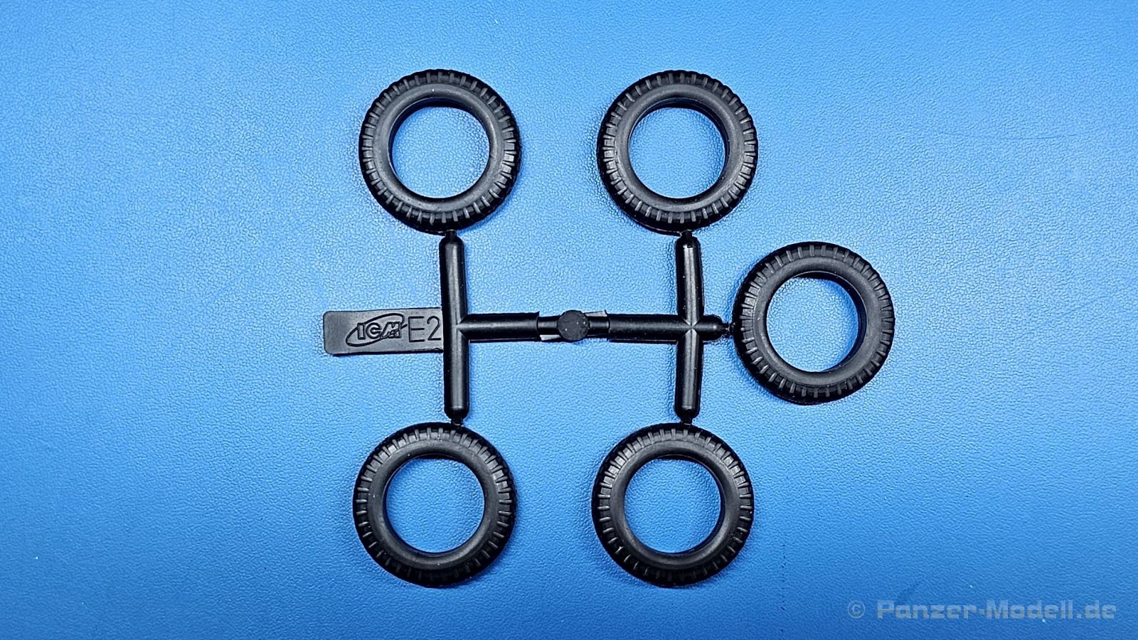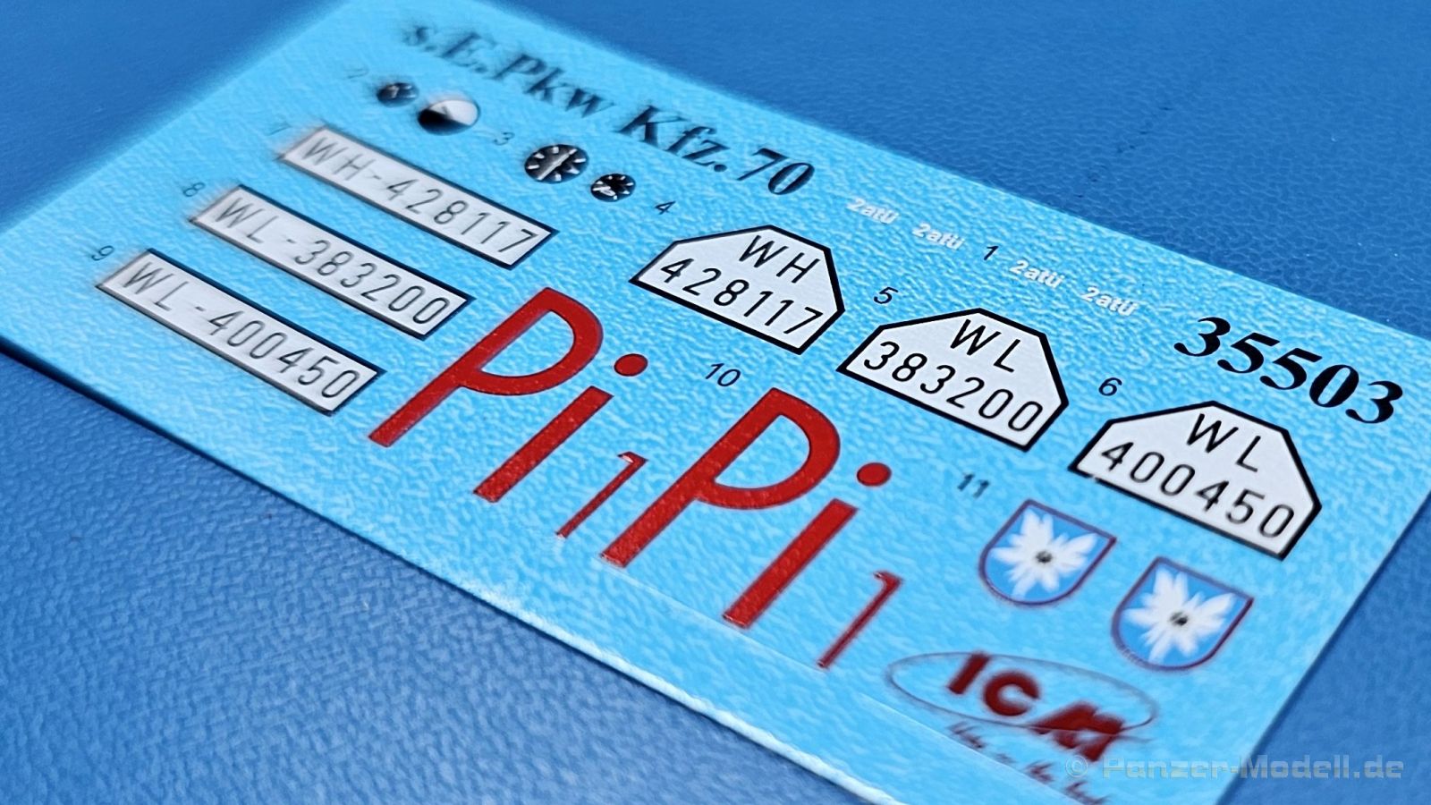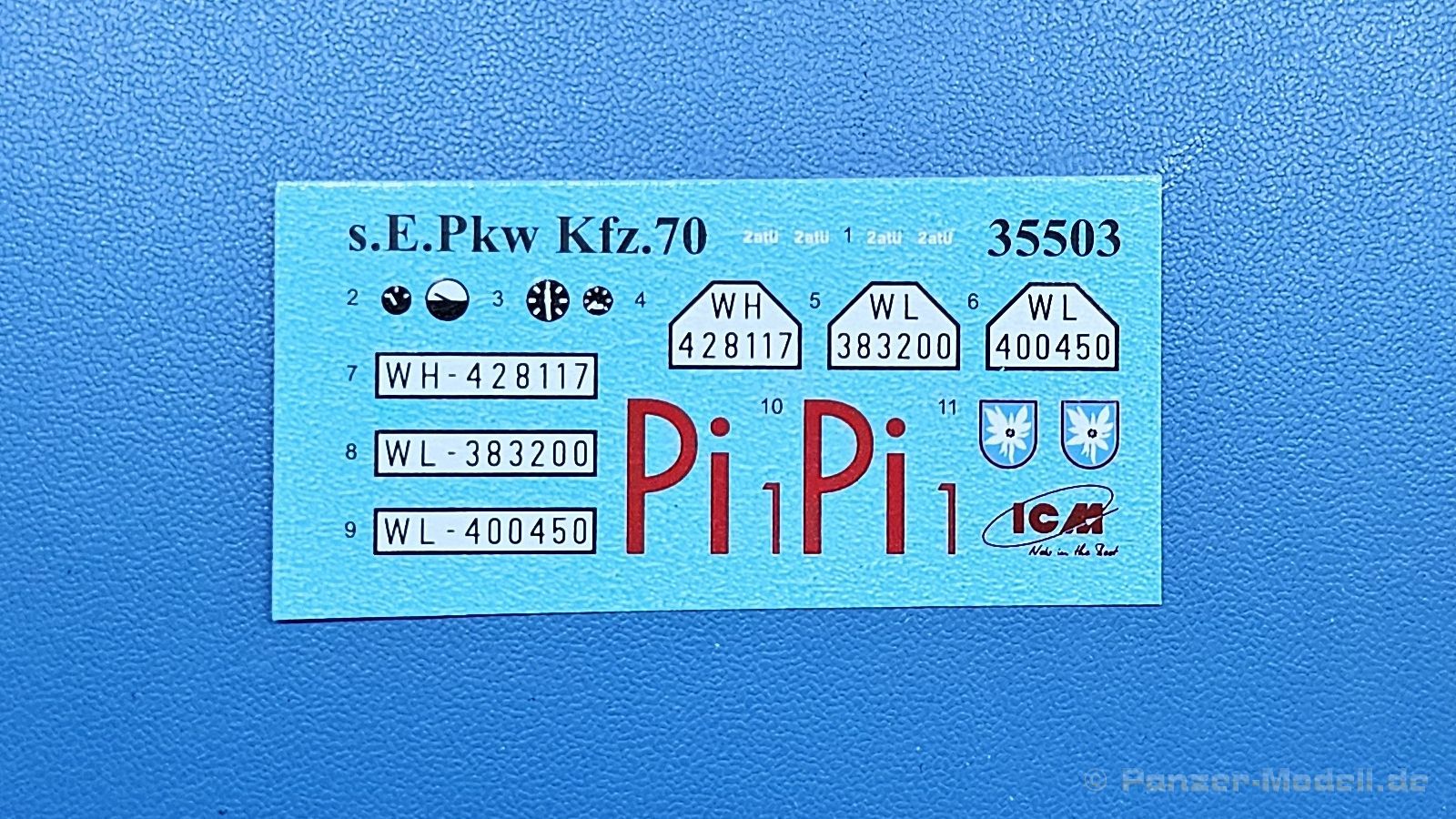 Das Original: Der schwere Einheits-Pkw Kfz.70 war eine der Varianten des Armeefahrzeugs Horch 108 Typ 40. Es wurde ursprünglich von der deutschen Ford-Niederlassung als multifunktionaler militärischer Geländewagen produziert. Der Bausatz: Das Kfz. 70 mit MG 34 ist Nr. 6 in der Reihe der Bausätze/Fahrzeug-Sets des schweren Einheits-Pkws von ICM. Der Karton mit Klappdeckel und darüber gestülptem Farbdeckel ist 310 x 230 x 40 mm groß und recht stabil. Es befinden sich 7 graue Spritzlinge, 1 Klarsicht- und ein Vinylspritzling darin. Dazu kommen die Bauanleitung und der Naßschiebebilderbogen. Die Teile aus hellgrauem Plastik sind sauber ausgespritzt, hier und da mit feinem Grat, aber ohne Versatz. Angüsse sind so gesetzt, dass Details nicht beeinträchtigt werden. Auswerferspuren sind zwar vorhanden, sollten aber auch ohne Nacharbeit nicht stören. Leider weisen die Vinylreifen eine Formtrennnaht auf, die sich aufgrund des elastischen Materials nur mühsam entfernen lässt. Es gibt einige sehr filigrane Teile, die beim Abtrennen vom Spritzling zwar entsprechende Vorsicht verlangen werden, am Modell aber sehr gut aussehen werden. ICM spendiert dem Horch einen Leiterrahmen aus einem Stück, der nur noch durch zusätzliche Querträger, Verstärkungen und Außenträger für den Aufbau ergänzt wird. Lochungen in den Trägern sind sauber ausgeführt. Statt Starrachsen gibt es Einzelradaufhängungen mit je zwei Schraubenfedern, letztere leider zweigeteilt, so dass es eine Klebenaht geben wird, die aber durch die Form der Federn schwierig zu bearbeiten ist. Die Antriebswellen für Vorder- und Hinterachse bestehen aus je einem Stück mit gut gestalteten Gelenkköpfen. Bei der Vorderachse kommt zusätzlich die zweite Hälfte des Differentialgetriebes mit angegossenem Lenkgestänge dazu. Die Bremsleitungen links und rechts zu den großen Bremstrommeln sind äußerst fein. Hier findet man feinen Grat, der wiederum Vorsicht beim Abschleifen erfordert eben wegen der Feinheit der Teile. Sie sitzen an jeweils sechs Angüssen. Der Motor besteht aus den wichtigsten Teilen wie Motorblock, Zylinderköpfen, Vergaser, zwei Luftfiltern, Abgaskrümmer, Anlasser, Lichtmaschine, Zündspule, Wasserpumpe, Kühler und Zuleitungen, Lüfterrad und Keilriemenscheiben, die über die Keilriemen bereits verbunden sind. Ein dreiteiliger Auspuff führt entlang des Rahmens mit hinten querliegendem Endrohr, das ggfs, aber noch aufgebohrt werden müsste. Die Vinylreifen weisen zwar Grat entlang der Formtrennnaht auf und haben keine Herstelleraufdrucke, zeigen aber ein gutes Profil. Der Aufbau ist ansprechend gestaltet. Der Boden zeigt Antirutschnoppen, hat Schulterstützenlager der Gewehre gleich angegossen und Ausbuchtungen für Ersatzräder. Es gibt ein Ersatzrad. Man kann sich die Seite aussuchen, wohin man es packt. Kupplungs-, Brems- und Gaspedal sind ebenso vorhanden wie die Schalt- und Handbremshebel. Die Armaturentafel zeigt deutlich die Anzeigen. Dafür gibt es sogar Decals. Die Gestelle für die Sitze und die Gewehrhalterung sind maßstäblich gerecht, aber deswegen auch dünn ausgefallen. Sitzpolster und Rückenlehnen sind recht glatt, aber dennoch mit leichten Wölbungen versehen, die wieder ein glaubwürdiges Aussehen verleihen. Die Riegel der Gewehrhalterungen sind an die Gewehre angegossen. Möchte man die Gewehr nicht anbringen, sollte man die Riegel abtrennen und in die Halterungen einbauen. Fahrgast- und Kofferraumtüren sind separat vorhanden, so dass man sie auch offen anbauen kann. Den Kofferraum sollte man in diesem Fall vollpacken, da der Boden keine Innendetails hat. Öffnungsgriffe außen und Handgriffe innen sind separat anzubringen. Die heruntergefaltete Plane besteht aus vier Teilen, Gestellstangen und Faltenwurf gut gelungen. Ungefähr mittig der Bodenplatte bohrt man ein Loch für die MG-Halterung. Die Halterung besteht aus zwei Hälften, die das MG 34 theoretisch beweglich zwischen sich aufnehmen kann. Das MG gefällt mir. Verschlussdeckel, Zweibein, Trommelmagazin und Hülsenfangsack sind separat anzubringen, der Lauf zeigt die Kühllöcher, aber keine Mündungsöffnung. Die Motorhaube hat viele Belüftungsschlitze, die aber nicht durchbrochen sind. Das mittige Klavierscharnier ist sehr schön, aber leider ist die Haube nicht zweiteilig ausgeführt, so dass man sie nicht offenstehen lassen kann, um den tollen Motor zu zeigen. Der breite Kühlergrill hat durchbrochene Lamellen, die hier und da etwas Grat zeigen, der mit einem scharfen Skalpell zu entfernen sein sollte. Die Scheinwerfer sind hohl mit geriffelten Klarsichtgläsern. Es gibt keine Tarnabdeckungen dafür. Axt, Schaufel, Drahtschneider, Spitzhacke, Hupe, Noteklicht und je eine Begrenzungsstange kommen auf die vorderen Kotflügel. Am Rahmen der Windschutzscheiben sind die Scheibenwischer bereits angegossen. Die Scheiben sind kristallklar. Die Verriegelungshebel der Windschutzscheibe sind winzig, aber separat anzubringen. Dies gilt auch für die Winkerhebel, die rechts noch einen Suchscheinwerfer mit Klarsichtscheibe und links einen Rückspiegel erhalten. Die Decals sind leicht glänzend, deutlich und scharf gedruckt. Enthalten sind die gleichen Markierungen wie beim Horch mit Zwillingssockellafette, aber es sind nur zwei davon für diesen Bausatz vorgesehen. Es gibt Armaturen- und Reifendruckanzeigen. Die Kennzeichen WL 383200 und WL 400450 sind für nicht näher zugeordnete Fahrzeuge der Luftwaffe, der Einsatzzeitraum, -ort und Lackierung sind nur vermutet. Die Bauanleitung im A4 Format hat 24 Seiten und ist in schwarz-weiß mit farbigen Akzenten gehalten. Eine kurze Beschreibung des Fahrzeuges auf der ersten Seite und weitere Erklärungen sind in Ukrainisch und in Englisch gehalten. Den Symbolerklärungen und einer Farbliste für ICM Farben folgen 2 Seiten mit der Teileübersicht. Der Bau des Fahrzeugs wird in 79 sinnvoll aufgeteilten, leicht verständlichen Schritten mit ausreichend großen Zeichnungen erklärt. Einzelne Baugrup