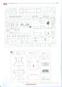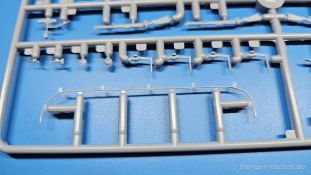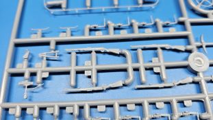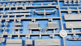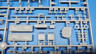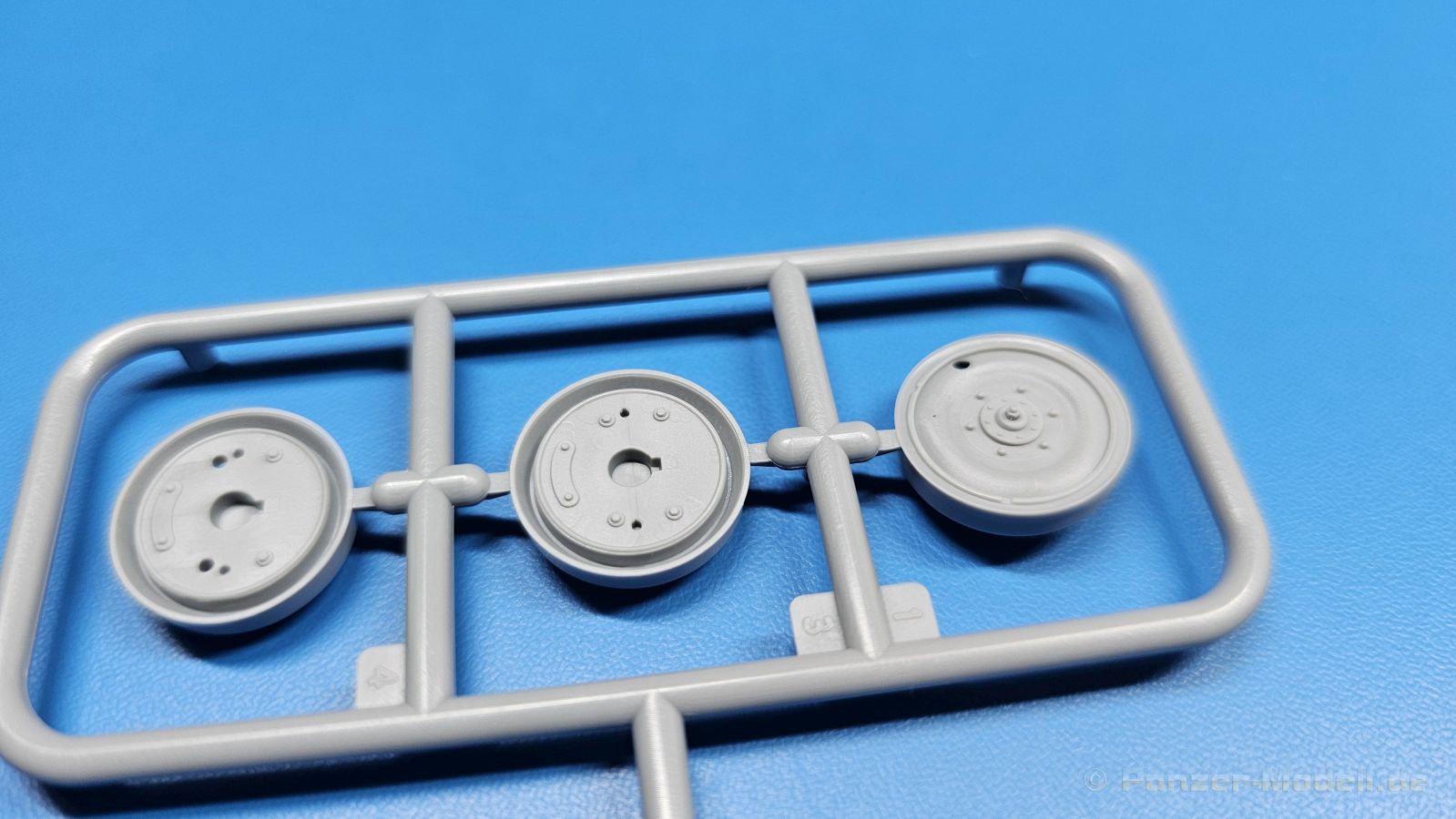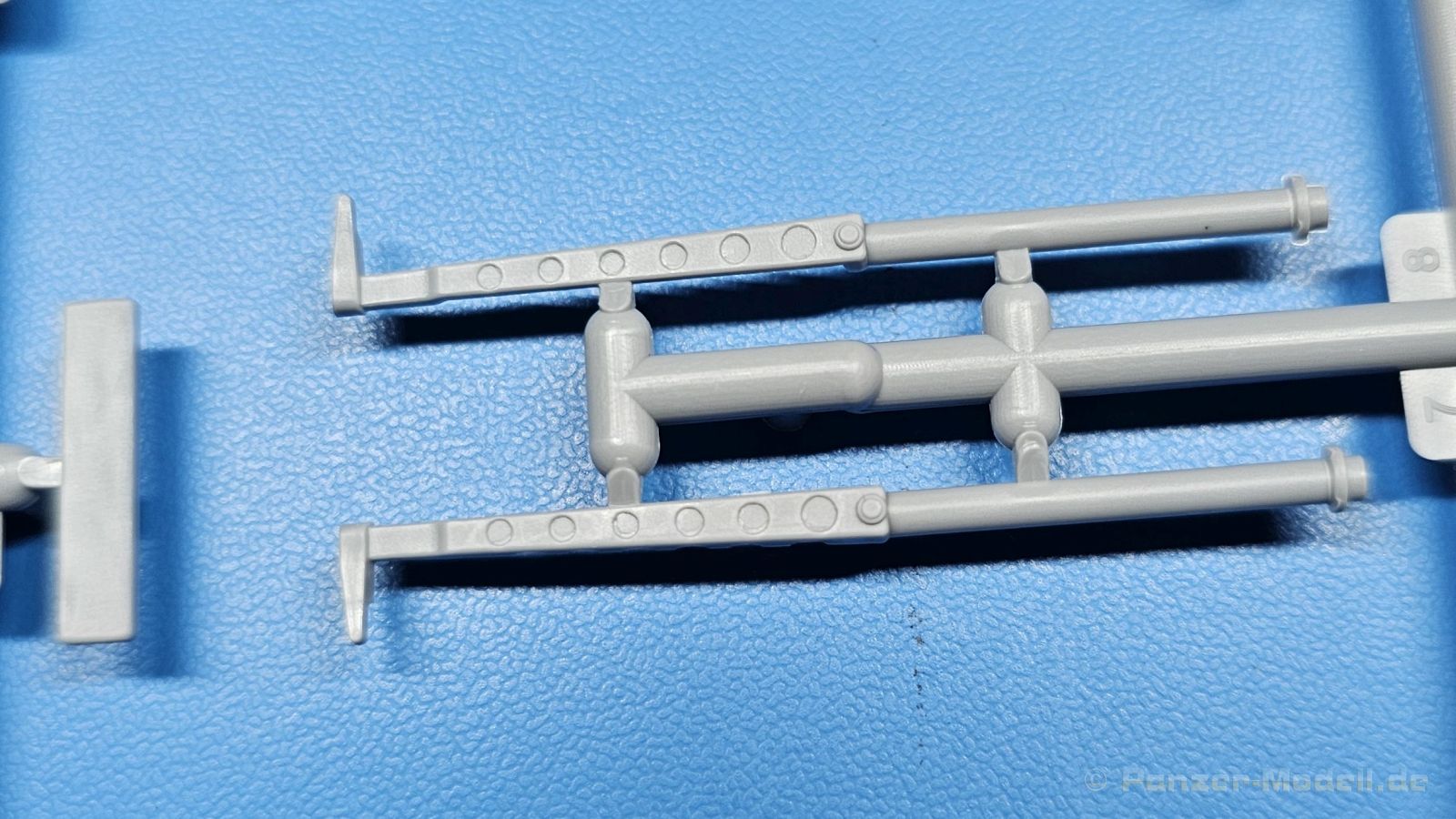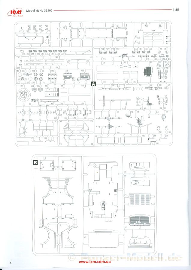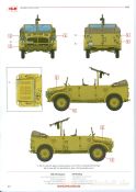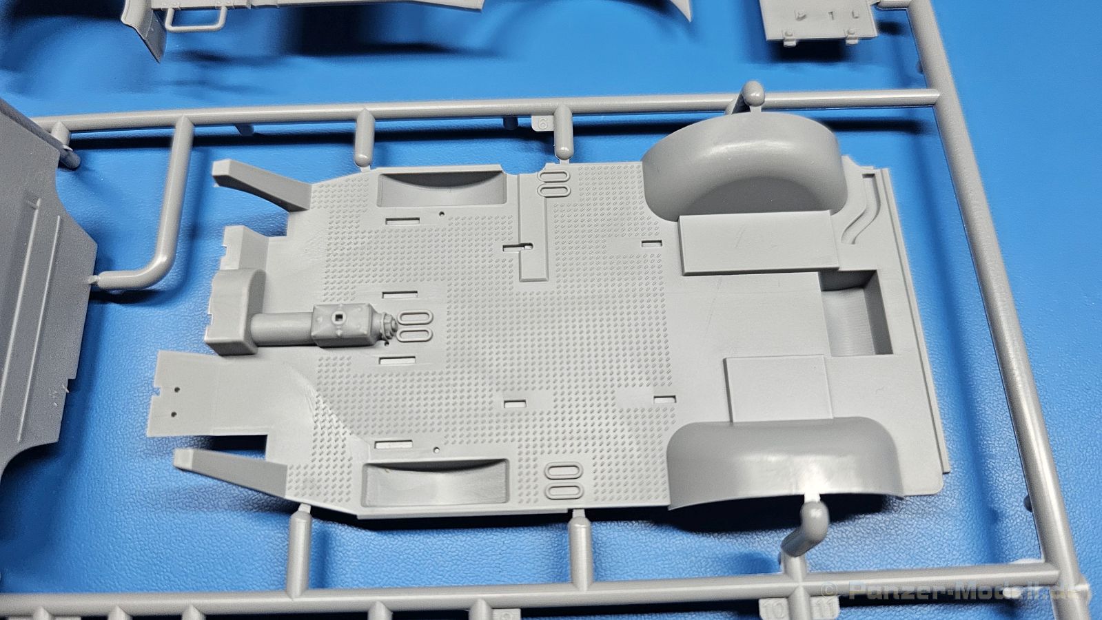Das Original: Der schwere Einheits-Pkw Kfz.70 war eine der Varianten des Armeefahrzeugs Horch 108 Typ 40. Es wurde ursprünglich von der deutschen Ford-Niederlassung als multifunktionaler militärischer Geländewagen produziert. Der Bausatz: Das Kfz. 70 mit MG 34 ist Nr. 6 in der Reihe der Bausätze/Fahrzeug-Sets des schweren Einheits-Pkws von ICM. Der Karton mit Klappdeckel und darüber gestülptem Farbdeckel ist 310 x 230 x 40 mm groß und recht stabil. Es befinden sich 7 graue Spritzlinge, 1 Klarsicht- und ein Vinylspritzling darin. Dazu kommen die Bauanleitung und der Naßschiebebilderbogen. Die Teile aus hellgrauem Plastik sind sauber ausgespritzt, hier und da mit feinem Grat, aber ohne Versatz. Angüsse sind so gesetzt, dass Details nicht beeinträchtigt werden. Auswerferspuren sind zwar vorhanden, sollten aber auch ohne Nacharbeit nicht stören. Leider weisen die Vinylreifen eine Formtrennnaht auf, die sich aufgrund des elastischen Materials nur mühsam entfernen lässt. Es gibt einige sehr filigrane Teile, die beim Abtrennen vom Spritzling zwar entsprechende Vorsicht verlangen werden, am Modell aber sehr gut aussehen werden. ICM spendiert dem Horch einen Leiterrahmen aus einem Stück, der nur noch durch zusätzliche Querträger, Verstärkungen und Außenträger für den Aufbau ergänzt wird. Lochungen in den Trägern sind sauber ausgeführt. Statt Starrachsen gibt es Einzelradaufhängungen mit je zwei Schraubenfedern, letztere leider zweigeteilt, so dass es eine Klebenaht geben wird, die aber durch die Form der Federn schwierig zu bearbeiten ist. Die Antriebswellen für Vorder- und Hinterachse bestehen aus je einem Stück mit gut gestalteten Gelenkköpfen. Bei der Vorderachse kommt zusätzlich die zweite Hälfte des Differentialgetriebes mit angegossenem Lenkgestänge dazu. Die Bremsleitungen links und rechts zu den großen Bremstrommeln sind äußerst fein. Hier findet man feinen Grat, der wiederum Vorsicht beim Abschleifen erfordert eben wegen der Feinheit der Teile. Sie sitzen an jeweils sechs Angüssen. Der Motor besteht aus den wichtigsten Teilen wie Motorblock, Zylinderköpfen, Vergaser, zwei Luftfiltern, Abgaskrümmer, Anlasser, Lichtmaschine, Zündspule, Wasserpumpe, Kühler und Zuleitungen, Lüfterrad und Keilriemenscheiben, die über die Keilriemen bereits verbunden sind. Ein dreiteiliger Auspuff führt entlang des Rahmens mit hinten querliegendem Endrohr, das ggfs, aber noch aufgebohrt werden müsste. Die Vinylreifen weisen zwar Grat entlang der Formtrennnaht auf und haben keine Herstelleraufdrucke, zeigen aber ein gutes Profil. Der Aufbau ist ansprechend gestaltet. Der Boden zeigt Antirutschnoppen, hat Schulterstützenlager der Gewehre gleich angegossen und Ausbuchtungen für Ersatzräder. Es gibt ein Ersatzrad. Man kann sich die Seite aussuchen, wohin man es packt. Kupplungs-, Brems- und Gaspedal sind ebenso vorhanden wie die Schalt- und Handbremshebel. Die Armaturentafel zeigt deutlich die Anzeigen. Dafür gibt es sogar Decals. Die Gestelle für die Sitze und die Gewehrhalterung sind maßstäblich gerecht, aber deswegen auch dünn ausgefallen. Sitzpolster und Rückenlehnen sind recht glatt, aber dennoch mit leichten Wölbungen versehen, die wieder ein glaubwürdiges Aussehen verleihen. Die Riegel der Gewehrhalterungen sind an die Gewehre angegossen. Möchte man die Gewehr nicht anbringen, sollte man die Riegel abtrennen und in die Halterungen einbauen. Fahrgast- und Kofferraumtüren sind separat vorhanden, so dass man sie auch offen anbauen kann. Den Kofferraum sollte man in diesem Fall vollpacken, da der Boden keine Innendetails hat. Öffnungsgriffe außen und Handgriffe innen sind separat anzubringen. Die heruntergefaltete Plane besteht aus vier Teilen, Gestellstangen und Faltenwurf gut gelungen. Ungefähr mittig der Bodenplatte bohrt man ein Loch für die MG-Halterung. Die Halterung besteht aus zwei Hälften, die das MG 34 theoretisch beweglich zwischen sich aufnehmen kann. Das MG gefällt mir. Verschlussdeckel, Zweibein, Trommelmagazin und Hülsenfangsack sind separat anzubringen, der Lauf zeigt die Kühllöcher, aber keine Mündungsöffnung. Die Motorhaube hat viele Belüftungsschlitze, die aber nicht durchbrochen sind. Das mittige Klavierscharnier ist sehr schön, aber leider ist die Haube nicht zweiteilig ausgeführt, so dass man sie nicht offenstehen lassen kann, um den tollen Motor zu zeigen. Der breite Kühlergrill hat durchbrochene Lamellen, die hier und da etwas Grat zeigen, der mit einem scharfen Skalpell zu entfernen sein sollte. Die Scheinwerfer sind hohl mit geriffelten Klarsichtgläsern. Es gibt keine Tarnabdeckungen dafür. Axt, Schaufel, Drahtschneider, Spitzhacke, Hupe, Noteklicht und je eine Begrenzungsstange kommen auf die vorderen Kotflügel. Am Rahmen der Windschutzscheiben sind die Scheibenwischer bereits angegossen. Die Scheiben sind kristallklar. Die Verriegelungshebel der Windschutzscheibe sind winzig, aber separat anzubringen. Dies gilt auch für die Winkerhebel, die rechts noch einen Suchscheinwerfer mit Klarsichtscheibe und links einen Rückspiegel erhalten. Die Decals sind leicht glänzend, deutlich und scharf gedruckt. Enthalten sind die gleichen Markierungen wie beim Horch mit Zwillingssockellafette, aber es sind nur zwei davon für diesen Bausatz vorgesehen. Es gibt Armaturen- und Reifendruckanzeigen. Die Kennzeichen WL 383200 und WL 400450 sind für nicht näher zugeordnete Fahrzeuge der Luftwaffe, der Einsatzzeitraum, -ort und Lackierung sind nur vermutet. Die Bauanleitung im A4 Format hat 24 Seiten und ist in schwarz-weiß mit farbigen Akzenten gehalten. Eine kurze Beschreibung des Fahrzeuges auf der ersten Seite und weitere Erklärungen sind in Ukrainisch und in Englisch gehalten. Den Symbolerklärungen und einer Farbliste für ICM Farben folgen 2 Seiten mit der Teileübersicht. Der Bau des Fahrzeugs wird in 79 sinnvoll aufgeteilten, leicht verständlichen Schritten mit ausreichend großen Zeichnungen erklärt. Einzelne Baugrup