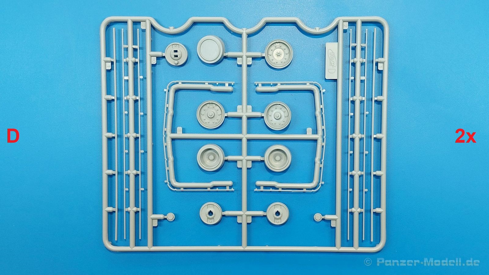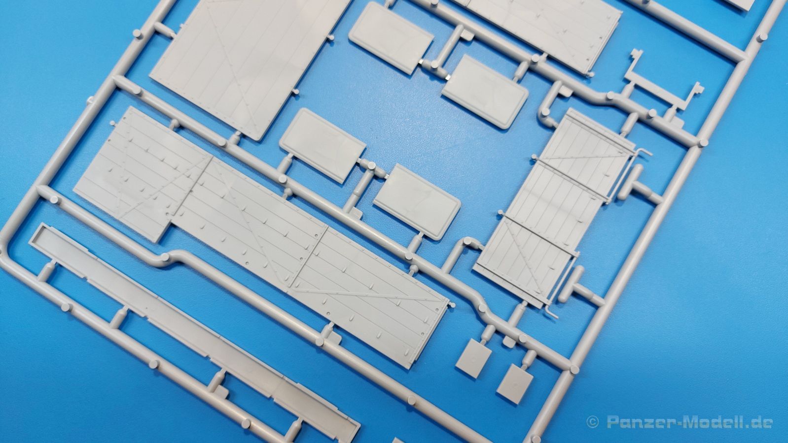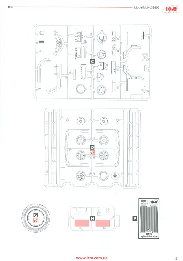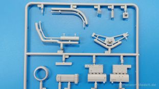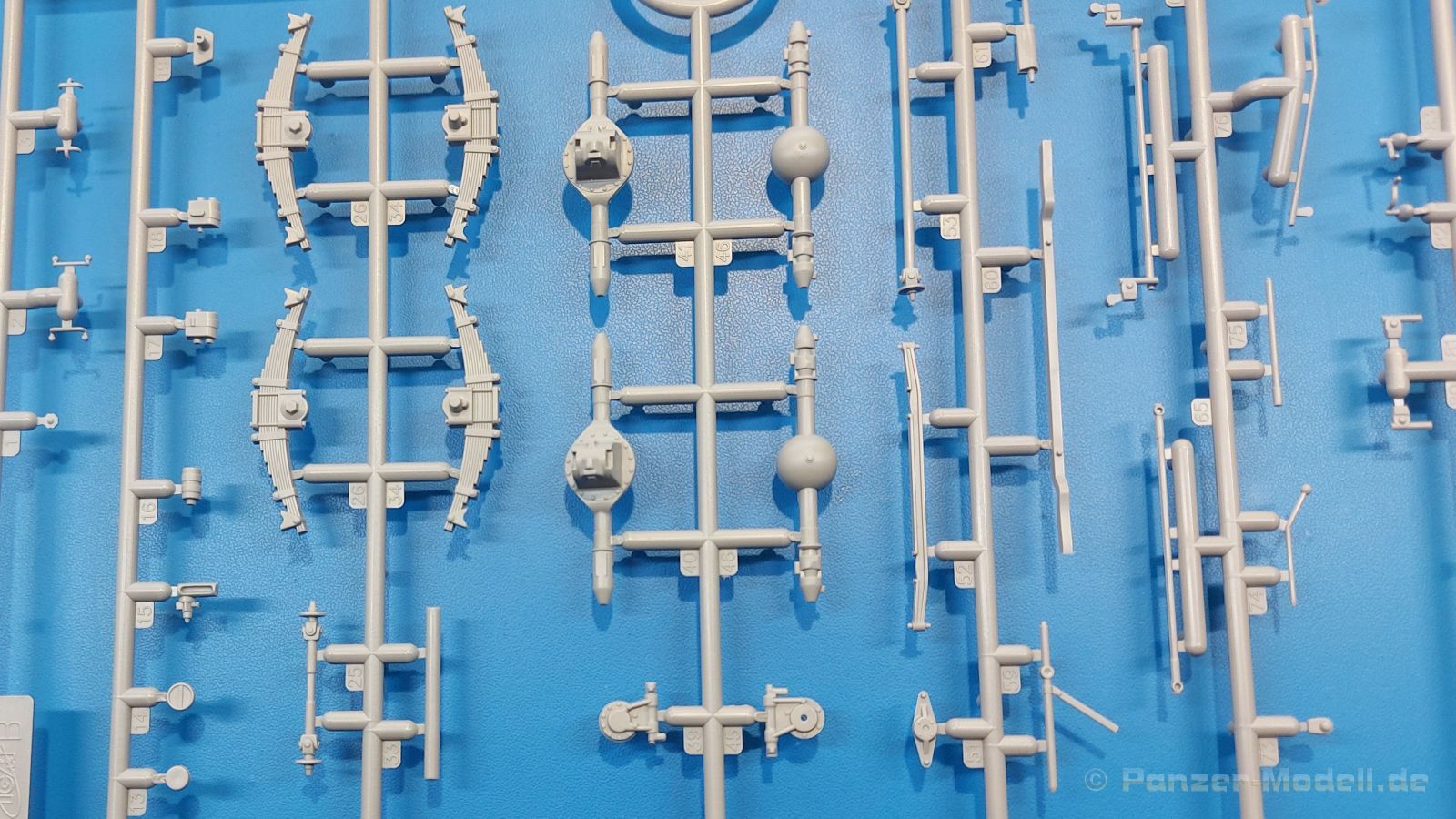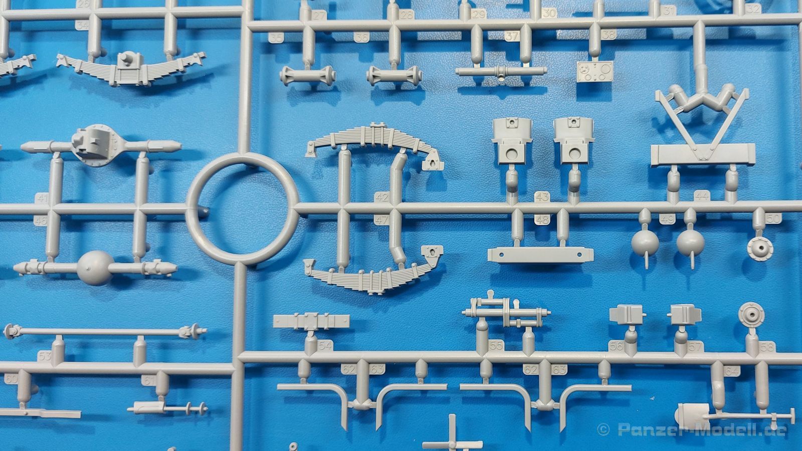 Das Original: Der Leyland Retriever war ein 3-achsiger britischer Lkw, der in der Zeit von 1938 bis 1942 in verschiedenen Varianten produziert wurde. Er konnte bis zu 3 Tonnen Nutzlast transportieren. Die beiden Hinterachsen waren angetrieben. Der Motor war ein 4-Zylinder Benziner mit 73 PS. Die erste Version hatte ein offenes Fahrerhaus (ohne feste Türen, keine Windschutzscheibe, Planenverdeck). Es folgten weitere Versionen mit Windschutzscheiben und Blechtüren und Varianten der Ladefläche. In den Jahren 1942 bis 1945 wurde er in Nordafrika und Nordwest-Europa eingesetzt. Bernard Montgomery nutzte einen Leyland Retriever, der heute noch im Imperial War Museum Duxford erhalten ist. Einige Exemplare wurden an die irische und die Rote Armee geliefert. Die Produktion wurde zwar gegen Ende des Krieges eingestellt, aber der Retriever wurde weiterhin genutzt. Der letzte Retriever wurde 1979 von der irischen Armee aus dem aktiven Dienst entlassen. Der Bausatz: Wer bisher einen Leyland Retriever in 1:35 bauen wollte, musste auf, oft recht teure Resinmodelle zurückgreifen. ICM präsentiert uns nun sein Spritzgussmodell, dessen Original in Varianten über 6500-mal gebaut wurde. Dieses Modell stellt den Retriever mit offenem Fahrerhaus (Planenverdeck, keine Türen, bzw. nur Stoffplane, keine Windschutzscheibe) dar, aber auch das Folgemodell mit teilgeschlossenem Fahrerhaus steht schon in den Startlöchern. Der 310 x 235 x 60 mm große Karton mit Klappdeckel und Überkarton enthält 7 Spritzlinge in hellgrauem Plastik, 1 Klarsichtspritzling, 7 Gummireifen, 1 kleine PE-Platine, Decals und die Bauanleitung. Die Teile sind sauber ausgespritzt, ohne Sinkstellen oder Versatz. Ich konnte eigentlich keinen Grat entdecken, aber so einige Auswerferabdrücke. Diese sitzen bis auf wenige Ausnahmen an Stellen, die nach dem Zusammenbau gar nicht oder nur schwer zu entdecken sind. Die Angüsse sind akzeptabel. Nur beim Abtrennen der feinen Spriegel und Längslatten wird man Vorsicht walten lassen müssen. Klarsichtteile sind kristallklar ohne Schlieren oder Kratzer. Der Rahmen des Fahrzeuges besteht aus U-förmigen Längs- und so einigen Querträgern. An den Längsträgern sind bereits die Aufnahmen für die Blattfederpakete der Hinterachsen, vordere Verstärkungsträger und die inneren Hälften der vorderen Blattfederpakete angegossen, am rechten Träger zusätzlich die Halterung des Auspuffrohres, am linken das Auflageblech der Tank-/Ersatzradhalterung. Außen sieht man sehr schön die Verschraubungen der Querträger. Die Blattfederpakete sind gut getroffen. Sie sind sowohl vorn als auch hinten in Längshälften aufgeteilt. Die Anhängekupplung (Haken und Riegel) wird an einer kleinen Blattfeder befestigt, die am Ende in Aussparungen der Längsträger eingeschoben wird. Auf beiden Seiten werden große Trittstufen seitlich am Rahmen mit je zwei L-förmigen Bügeln befestigt. Über diese Stufen konnte man das Ersatzrad, bzw. den Tank besser erreichen. Der Antrieb ist ein Modell für sich. Der Benzinmotor wartet mit allen wichtigen Teilen auf wie Motorblock, Ölwanne, Ventildeckel, Lufteinlass mit Vergaser, Auspuffkrümmer, Auspuffrohr mit Schalldämpfer und Endrohr, Lichtmaschine, Anlasser, Kühlwasserpumpe und -leitungen. Kühlerpropeller, Kupplungsdom, Schaltgetriebe. Vom Schaltgetriebe geht eine längere Kardanwelle zur ersten Hinterachse, eine kürzere zur zweiten. Die Kardangelenke sind schön dargestellt. Auch die Hinterachsen mit den Verschraubungen der Differentialdeckel können sich sehen lassen. Vier Längslenker sichern die Hinterachsen. Für die Vorderachse hat sich ICM diesmal etwas sehr Gutes einfallen lassen. Im Gegensatz zu früheren Bausätzen hat man die Wahl zwischen Geradeausstellung der Räder oder nach belieben eingeschlagen. Dazu gibt es in Geradeausstellung zusammengegossene Lenkhebel oder alle Gestänge einzeln, damit man den Lenkeinschlag darstellen kann. Die Lösung gefällt mir! Bei den Rädern hat man jeweils äußere Felge und Bremstrommel, die den Gummireifen einklemmen. Die Reifen aus Gummi sind vom Aussehen wie die echten, mit sehr schönem, grobstolligem Profil, aber leider ohne Herstelleraufdruck oder Reifengrößen. Das Ersatzrad bekommt natürlich eine Felge mit Schraubenlöchern, in die die Ersatzradhalterung eingreift. Der große Tank findet seinen Platz auf dem gleichen Untergestell wie die Ersatzradhalterung. Er ist in 2 Hälften geteilt, bekommt an den Enden längliche Seitenwände und an die Vorderseite 2 Halterungen, mit denen er auf dem Rahmen befestigt wird. Durch die Zweiteilung sind sowohl Kraftstoffeinfüll- als auch Kraftstoffauslassstutzen ebenfalls geteilt. Ob dies so gut ist, muss sich beim Zusammenbau zeigen. Das Fahrerhaus setzt sich aus mehreren Elementen zusammen. Front, 2 Bodenplatten, Motorabdeckung, Rückwand, rudimentäre Seitenwände und Dachplane. Die Front wird mit den eingerollten Türplanen versehen, auf die Fahrerseite kommen Sicherungskasten(?) und Taschenlampe(?), darüber die Armaturentafel, für die auch 3 Decals für die Instrumente beiliegen. Eine Innenverkleidung ist für die Mitte vorsehen, woran dann die Motorabdeckung anschließen wird. Die Motorabdeckung ist dreigeteilt ein Mittelsteg und die jeweiligen Abdeckungen links und rechts mit den Seitenwänden. Mit dem Mittelsteg wäre es reizvoll gewesen, die oberen Klappen offen darzustellen, um den Motor zu sehen. Dies geht leider nur, wenn man die Seitenwände von den Deckeln trennen würde. Fahrer und Beifahrer hatten ein „hartes“ Leben, grad bei Fahrten auf unebenen Straßen oder im Gelände, denn sie sitzen auf Staukisten ohne Sitzpolsterung. Diese Kisten werden auf den Bodenplatten angebracht und sind auch gut im Modell wiedergegeben. Die Bodenplatte des Fahrers erhält zudem die Pedale (Kupplung, Bremse, Gas), Schalt- und Handbremshebel, Lenkstange und Lenkrad. Am Lenkrad gut zu sehen die Noppen für besseren Griff. An der Rückwand werden die Rückenlehnen angebracht, die abe