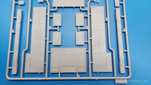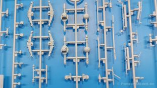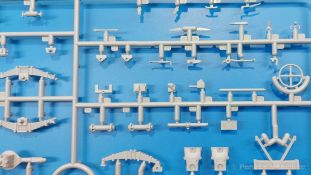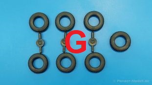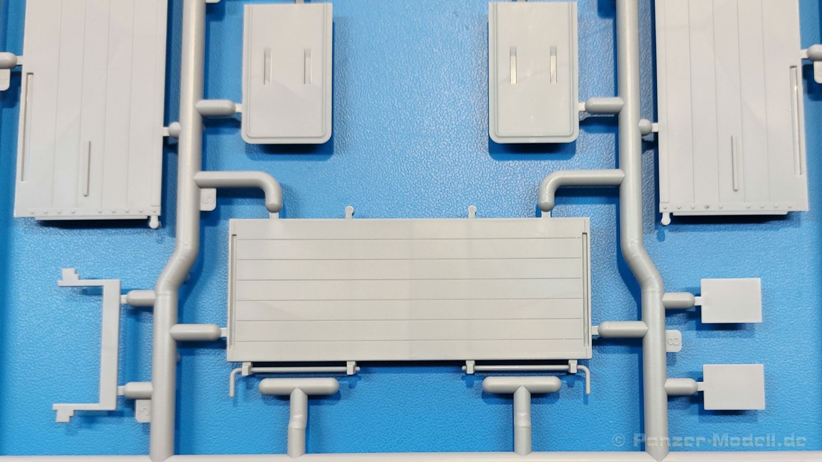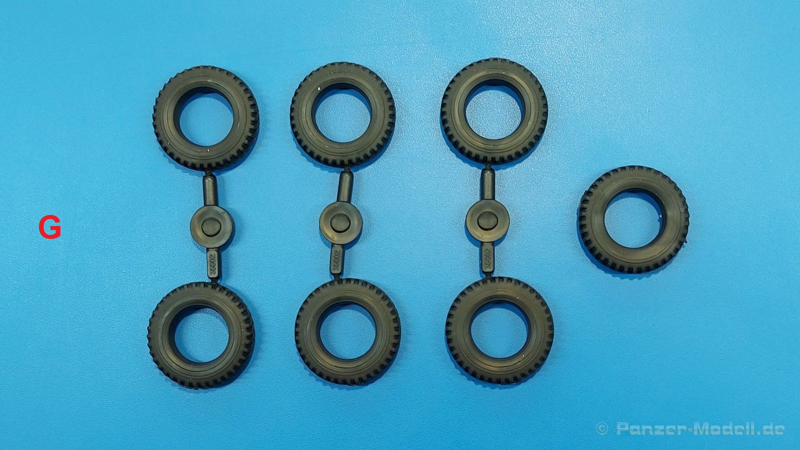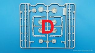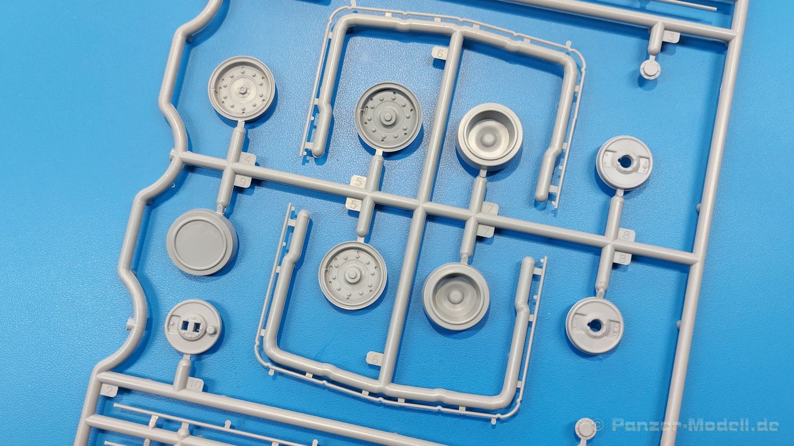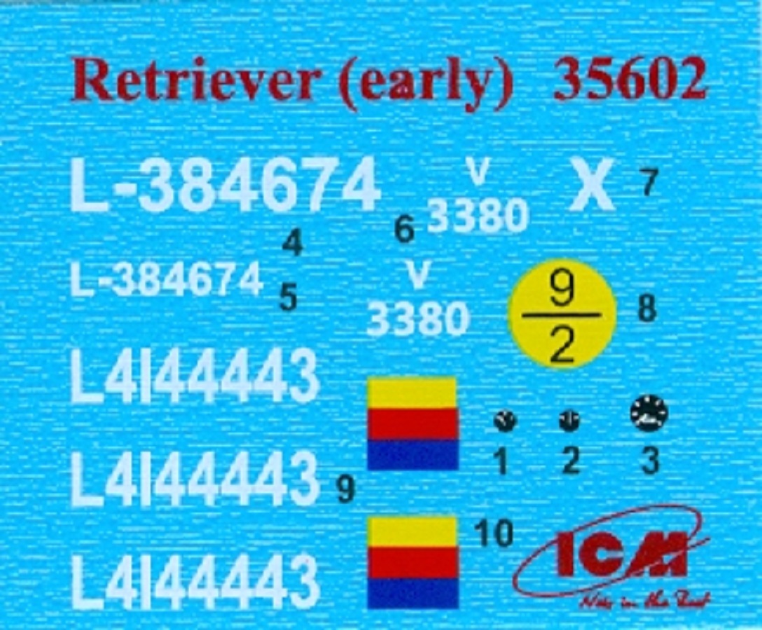 Das Original: Der Leyland Retriever war ein 3-achsiger britischer Lkw, der in der Zeit von 1938 bis 1942 in verschiedenen Varianten produziert wurde. Er konnte bis zu 3 Tonnen Nutzlast transportieren. Die beiden Hinterachsen waren angetrieben. Der Motor war ein 4-Zylinder Benziner mit 73 PS. Die erste Version hatte ein offenes Fahrerhaus (ohne feste Türen, keine Windschutzscheibe, Planenverdeck). Es folgten weitere Versionen mit Windschutzscheiben und Blechtüren und Varianten der Ladefläche. In den Jahren 1942 bis 1945 wurde er in Nordafrika und Nordwest-Europa eingesetzt. Bernard Montgomery nutzte einen Leyland Retriever, der heute noch im Imperial War Museum Duxford erhalten ist. Einige Exemplare wurden an die irische und die Rote Armee geliefert. Die Produktion wurde zwar gegen Ende des Krieges eingestellt, aber der Retriever wurde weiterhin genutzt. Der letzte Retriever wurde 1979 von der irischen Armee aus dem aktiven Dienst entlassen. Der Bausatz: Wer bisher einen Leyland Retriever in 1:35 bauen wollte, musste auf, oft recht teure Resinmodelle zurückgreifen. ICM präsentiert uns nun sein Spritzgussmodell, dessen Original in Varianten über 6500-mal gebaut wurde. Dieses Modell stellt den Retriever mit offenem Fahrerhaus (Planenverdeck, keine Türen, bzw. nur Stoffplane, keine Windschutzscheibe) dar, aber auch das Folgemodell mit teilgeschlossenem Fahrerhaus steht schon in den Startlöchern. Der 310 x 235 x 60 mm große Karton mit Klappdeckel und Überkarton enthält 7 Spritzlinge in hellgrauem Plastik, 1 Klarsichtspritzling, 7 Gummireifen, 1 kleine PE-Platine, Decals und die Bauanleitung. Die Teile sind sauber ausgespritzt, ohne Sinkstellen oder Versatz. Ich konnte eigentlich keinen Grat entdecken, aber so einige Auswerferabdrücke. Diese sitzen bis auf wenige Ausnahmen an Stellen, die nach dem Zusammenbau gar nicht oder nur schwer zu entdecken sind. Die Angüsse sind akzeptabel. Nur beim Abtrennen der feinen Spriegel und Längslatten wird man Vorsicht walten lassen müssen. Klarsichtteile sind kristallklar ohne Schlieren oder Kratzer. Der Rahmen des Fahrzeuges besteht aus U-förmigen Längs- und so einigen Querträgern. An den Längsträgern sind bereits die Aufnahmen für die Blattfederpakete der Hinterachsen, vordere Verstärkungsträger und die inneren Hälften der vorderen Blattfederpakete angegossen, am rechten Träger zusätzlich die Halterung des Auspuffrohres, am linken das Auflageblech der Tank-/Ersatzradhalterung. Außen sieht man sehr schön die Verschraubungen der Querträger. Die Blattfederpakete sind gut getroffen. Sie sind sowohl vorn als auch hinten in Längshälften aufgeteilt. Die Anhängekupplung (Haken und Riegel) wird an einer kleinen Blattfeder befestigt, die am Ende in Aussparungen der Längsträger eingeschoben wird. Auf beiden Seiten werden große Trittstufen seitlich am Rahmen mit je zwei L-förmigen Bügeln befestigt. Über diese Stufen konnte man das Ersatzrad, bzw. den Tank besser erreichen. Der Antrieb ist ein Modell für sich. Der Benzinmotor wartet mit allen wichtigen Teilen auf wie Motorblock, Ölwanne, Ventildeckel, Lufteinlass mit Vergaser, Auspuffkrümmer, Auspuffrohr mit Schalldämpfer und Endrohr, Lichtmaschine, Anlasser, Kühlwasserpumpe und -leitungen. Kühlerpropeller, Kupplungsdom, Schaltgetriebe. Vom Schaltgetriebe geht eine längere Kardanwelle zur ersten Hinterachse, eine kürzere zur zweiten. Die Kardangelenke sind schön dargestellt. Auch die Hinterachsen mit den Verschraubungen der Differentialdeckel können sich sehen lassen. Vier Längslenker sichern die Hinterachsen. Für die Vorderachse hat sich ICM diesmal etwas sehr Gutes einfallen lassen. Im Gegensatz zu früheren Bausätzen hat man die Wahl zwischen Geradeausstellung der Räder oder nach belieben eingeschlagen. Dazu gibt es in Geradeausstellung zusammengegossene Lenkhebel oder alle Gestänge einzeln, damit man den Lenkeinschlag darstellen kann. Die Lösung gefällt mir! Bei den Rädern hat man jeweils äußere Felge und Bremstrommel, die den Gummireifen einklemmen. Die Reifen aus Gummi sind vom Aussehen wie die echten, mit sehr schönem, grobstolligem Profil, aber leider ohne Herstelleraufdruck oder Reifengrößen. Das Ersatzrad bekommt natürlich eine Felge mit Schraubenlöchern, in die die Ersatzradhalterung eingreift. Der große Tank findet seinen Platz auf dem gleichen Untergestell wie die Ersatzradhalterung. Er ist in 2 Hälften geteilt, bekommt an den Enden längliche Seitenwände und an die Vorderseite 2 Halterungen, mit denen er auf dem Rahmen befestigt wird. Durch die Zweiteilung sind sowohl Kraftstoffeinfüll- als auch Kraftstoffauslassstutzen ebenfalls geteilt. Ob dies so gut ist, muss sich beim Zusammenbau zeigen. Das Fahrerhaus setzt sich aus mehreren Elementen zusammen. Front, 2 Bodenplatten, Motorabdeckung, Rückwand, rudimentäre Seitenwände und Dachplane. Die Front wird mit den eingerollten Türplanen versehen, auf die Fahrerseite kommen Sicherungskasten(?) und Taschenlampe(?), darüber die Armaturentafel, für die auch 3 Decals für die Instrumente beiliegen. Eine Innenverkleidung ist für die Mitte vorsehen, woran dann die Motorabdeckung anschließen wird. Die Motorabdeckung ist dreigeteilt ein Mittelsteg und die jeweiligen Abdeckungen links und rechts mit den Seitenwänden. Mit dem Mittelsteg wäre es reizvoll gewesen, die oberen Klappen offen darzustellen, um den Motor zu sehen. Dies geht leider nur, wenn man die Seitenwände von den Deckeln trennen würde. Fahrer und Beifahrer hatten ein „hartes“ Leben, grad bei Fahrten auf unebenen Straßen oder im Gelände, denn sie sitzen auf Staukisten ohne Sitzpolsterung. Diese Kisten werden auf den Bodenplatten angebracht und sind auch gut im Modell wiedergegeben. Die Bodenplatte des Fahrers erhält zudem die Pedale (Kupplung, Bremse, Gas), Schalt- und Handbremshebel, Lenkstange und Lenkrad. Am Lenkrad gut zu sehen die Noppen für besseren Griff. An der Rückwand werden die Rückenlehnen angebracht, die abe