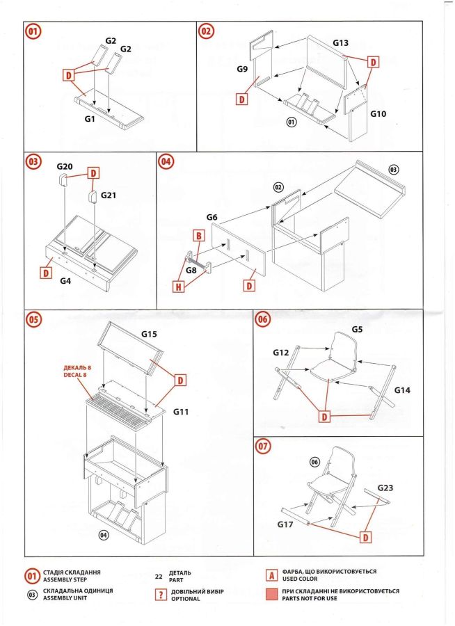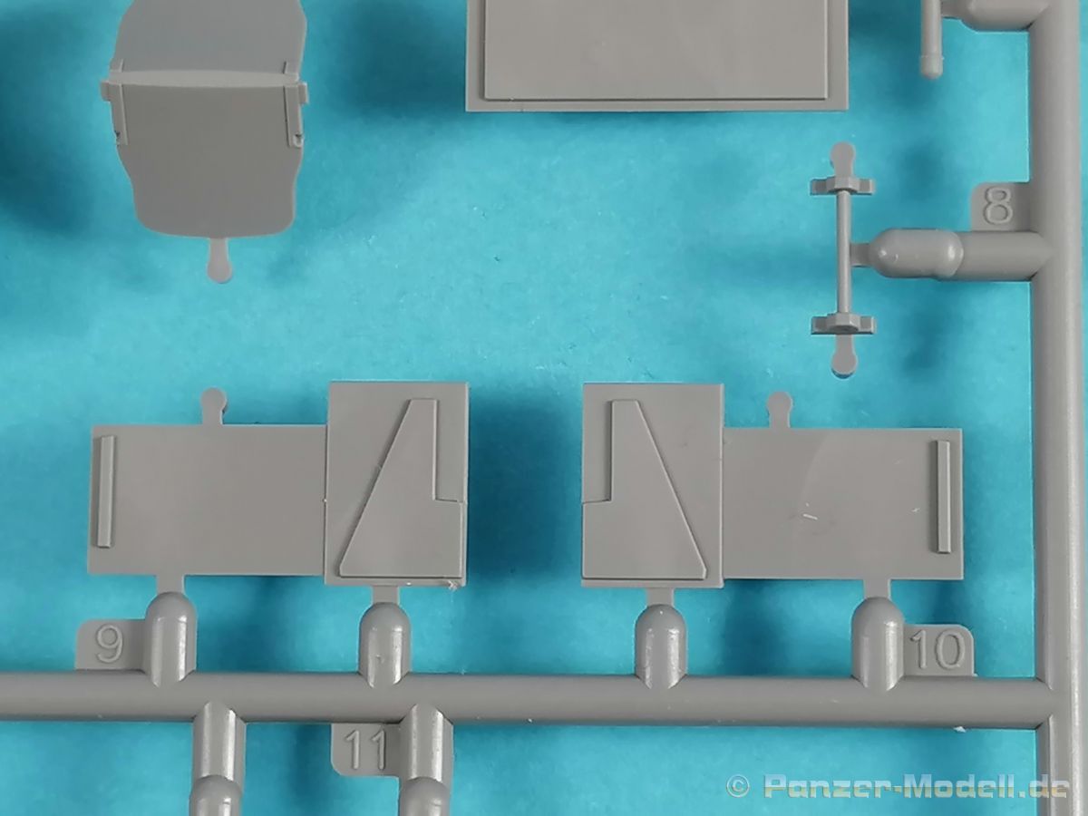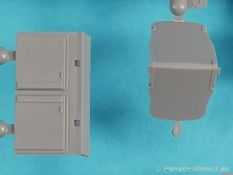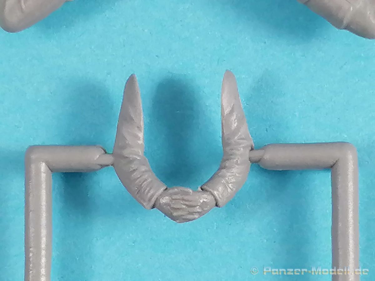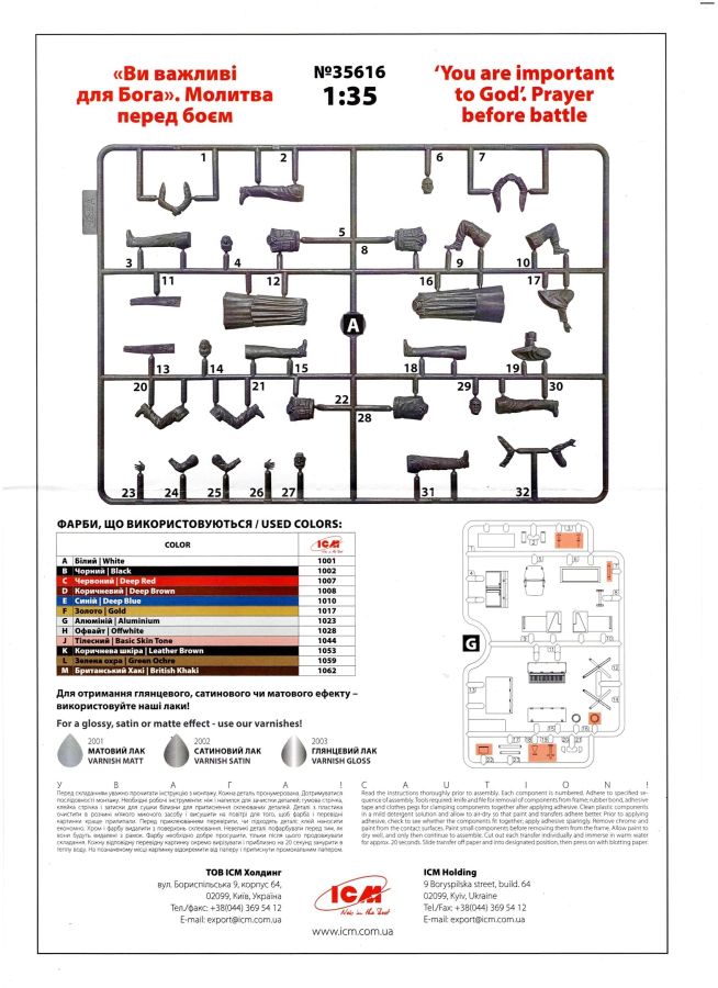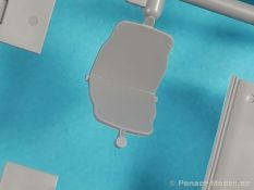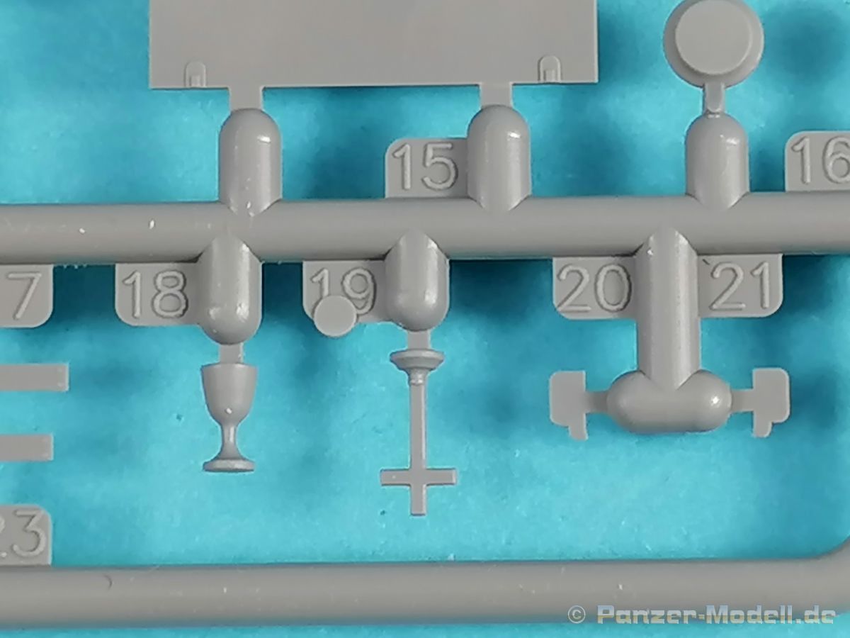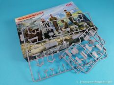 Eine etwas ungewöhnliche Figurengruppe hat ICM in diesem Fall realisiert. Geistlicher Beistand war bei den verschiedenen Armeen oft vertreten. Was befindet sich also in der für ICM typischen Kartonbox mit Stülpdeckel? Vorhanden sind lediglich zwei Rahmen aus hellgrauem Plastikmaterial dowie Decals und eine vier Seiten umfassende Bau- und Bemalungsanleitung. Der größere Rahmen beinhaltet die Bauteile für die insgesamt fünf Figuren. Ein Pfarrer, ein Organist, ein Ministrant (?) und zwei Soldaten, einer knieend und einer stehend. Nach Art und Schnitt der Uniformen lassen sich die Kameraden bei der britischen Armee verorten. Der Guß der Figuren ist ganz ausgezeichnet. Besonders bei den Details gefällt der Faltenwurf und auch die Ausformung der Hände bei denen u.a. die Finger sehr gut wiedergegeben sind. Auch die Köpfe können mit unterschiedlichen Gesichtzügen überzeugen. Anatomisch wirken die Figuren auch realistisch. Die Nacharbeit dürfte sich im üblichen Rahmen halten und keine Überraschungen bringen. Der kleinere Rahmen (schon bekannt aus der fahrbaren Kapelle) enthält die Bauteile der Orgel und eines Stuhls. Sehr sauber umgesetzt. Die Bauanleitung besteht lediglich aus vier Seiten. Während auf der ersten Seite neben den hauseigenen Farben und einigen Verarbeitungshinweise die Spritzlinge dargestellt sind, ist auf der zweiten Seite der Bau der Orgel und des Stuhls dokumentiert. Seite drei und vier sind dem Zusammenbau und der Bemalung der Figuren vorbehalten. Ein schönes Set, das alleine als Vignette schon gefällt, aber in Verbindung mit dem Kit Nr. 35586 ein durchaus etwas aus dem Rahmen fallendes Diorama sein könnte.