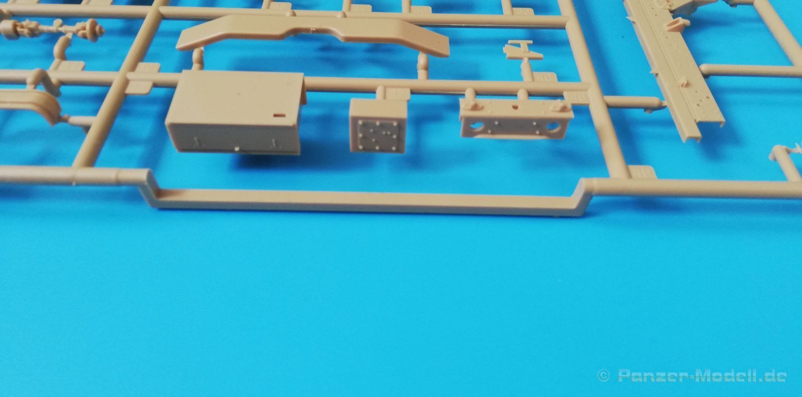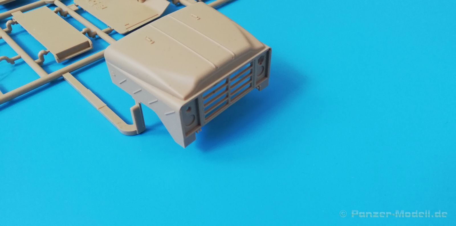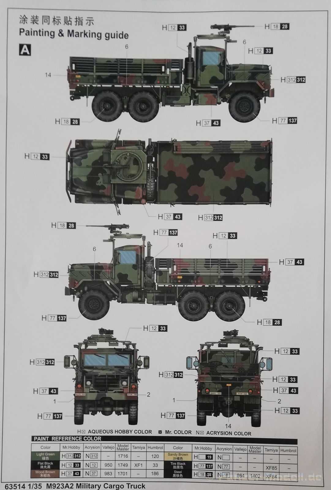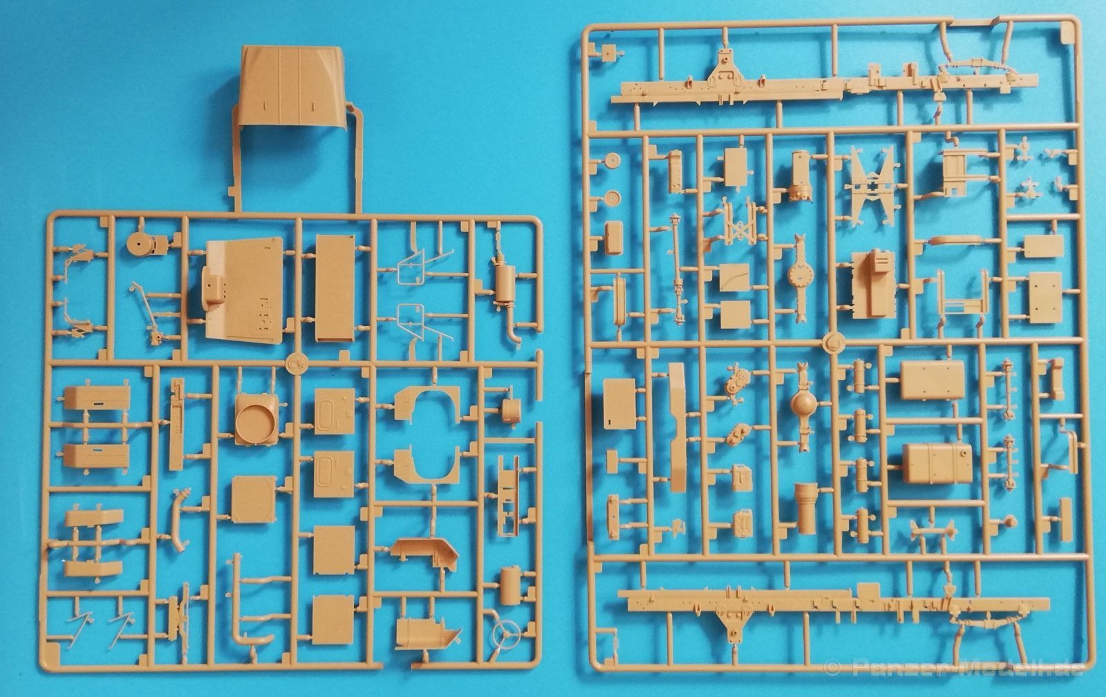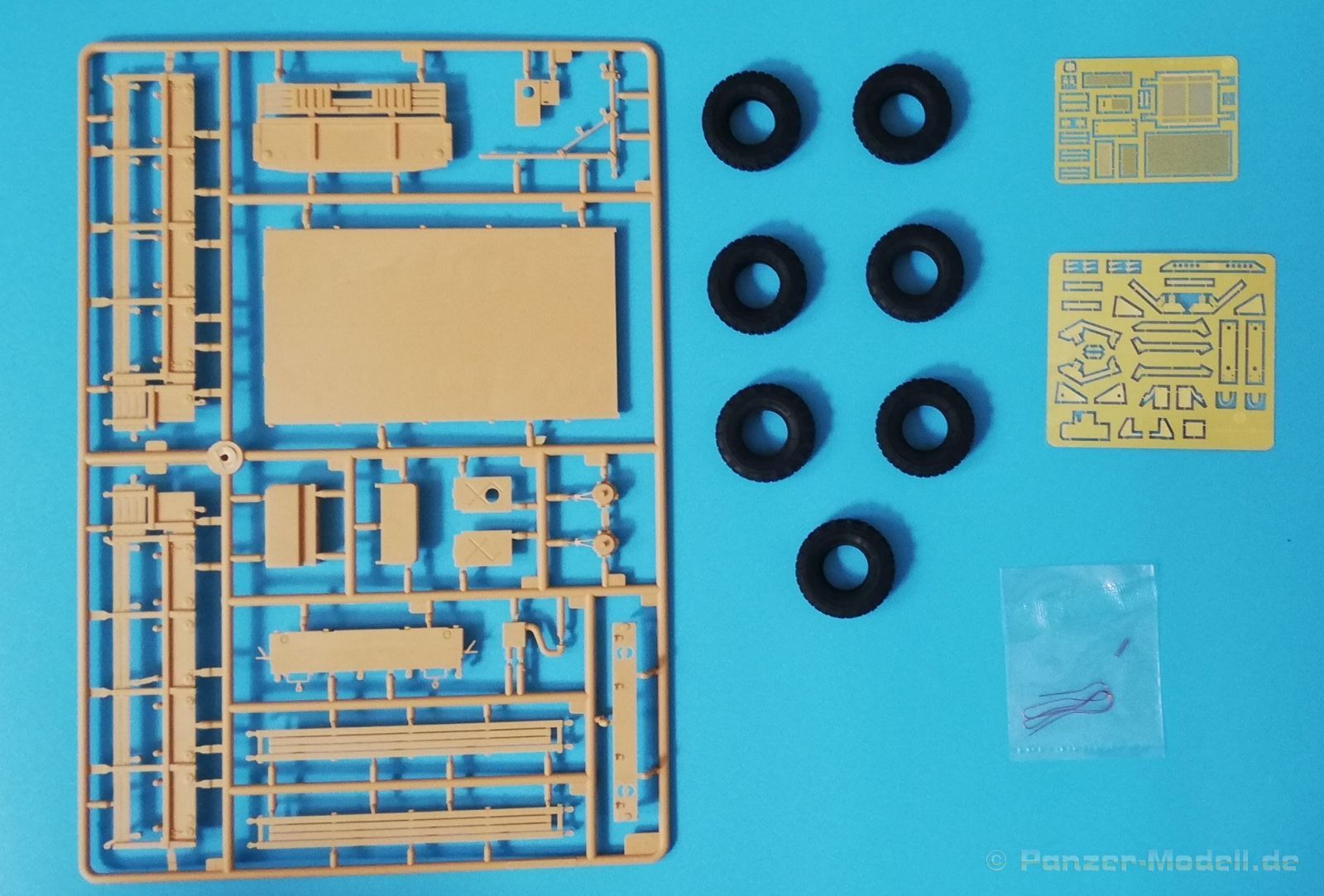 Die M939 Serie von LKW wurde Ende der 1970er Jahre als Ersatz für die Lkw-Serien M39 und M809 entwickelt und befindet sich seitdem im Einsatz bei der U.S. Army und dem U.S. Marine Corps. Wie auch bei den Vorgängerserien wurde bei den M939 eine ganze Familie von Lastkraftwagen entwickelt, unter anderem Muldenkipper, Sattelzugmaschinen, Kofferfahrzeuge, Abschleppwagen und Spezialkarosserien. Insgesamt wurden 44.590 Stück produziert Auch in Deutschland waren und sind diese Standard LKW ein gewohnter Anblick bei den hier stationierten U.S. Einheiten. Der Hersteller I Love Kit bringt nun laut des Kartons die Version M923A2 auf den Markt. Hieraus ergeben sich zwei Fragen: Wer ist I Love Kit und ist es ein M923A2? Der Hersteller war bis vor einiger Zeit als Merit bekannt, und ist eine der Marken aus dem Hause Trumpeter/ Hobby Boss. Hier ist also einiges an Erfahrung in Sachen Formenbau vorhanden, und der Hersteller ist kein Neuling auf diesem Gebiet. Nun zum Modell. Gemäß den Angaben soll es sich um einen M923A2 LKW handeln. Diese wurden ab 1987 neu für das U.S. Militär produziert und zeichneten sich durch einige, teilweise auch äußerlich erkennbare, Merkmale aus. Hier wären die Reifendruckregelanlage, der angeschrägte Tank und die zusätzlichen Zurrösen an der Unterseite der Frontstoßstange zu nennen. Alle diese Merkmale hat das Modell nicht, so stellt es doch den Vorgänger M923A1 dar. Dieser hatte bereits sie größeren Reifen 14:00 R20 mit der Einzelbereifung auf den Hinterachsen im Gegensatz zum M923 mit den kleineren Riefen 11:00 R20 und der Doppelbereifung auf den Hinterachsen. Der Bausatzinhalt umfasst siegen Sandfarbene und einen klaren Spritzling, eine Fahrerkabine welche separat beiliegt, zwei PE Platinen, einen Draht, eine Feder einen Decalbogen, sieben Reifen aus Vinyl, Masken zum Abkleben der Scheiben und eine Bauanleitung. Alle Bauteile machen einen guten Eindruck. Es sind viele Details und Hinterschneidungen vorhanden, wobei einige Details etwas schärfen hätten ausfallen können. Fischhäute oder Auswerfermarken an später sichtbaren Stellen sind auch bei genauem Hinsehen nicht zu entdecken. Die vorhandenen Fotoätzteile sind beim Bau zu verwenden, optionale Plastikteile sind nicht vorgesehen. Der Bau des LKW beginnt typischerweise mit dem Rahmen. Hier werden bereits viele schöne Details sichtbar, von den sehr schönen Getriebebauteilen bis zu den sehr gut ausgeführten Blattfedern. Die Ersatzradhalterung mit dem Hilfskran für die großen Reifen ist bei diesem Bausatz sehr gut dargestellt und wird mit einigen Fotoätzteilen verfeinert. Die sieben beiliegenden Reifen aus Vinyl machen einen guten Eindruck, es ist lediglich eine sehr feine Naht auf der Lauffläche vorhanden. Diese kann man mit einem scharfen Skalpell jedoch recht einfach entfernen. Erfreulicherweise sind die Herstellerangaben auf den Reifenflanken vorhanden. Auch die Pritsche ist wieder mit tollen Details ausgestattet. So ist zum Beispiel Draht beigelegt, aus dem die Verzurrösen an der Pritsche gebogen werden müssen. Zu diesem Zweck ist an einem der Spritzlinge eine Biegehilfe vorhanden. Auch wird einiges an Fotoätzteilen an der Pritsche benötigt. Optional können auf der Pritsche Sitzbänke ausgeklappt oder hochgeklappt angebracht werden. Leider fehlt eine Darstellung der Spriegel oder einer Plane. Hier muss der Modellbauer selber tätig werden, oder auf Produkte aus dem Aftermarket zurückgreifen (Mit etwas Anpassen sollte die Plane vom M54A2 von AFV-Club passen, falls benötigt). Die Bauanleitung im typischen Trumpeter/ Hobby Boss Stil ist etwas kleiner als DIN A4, und führt in fünfundzwanzig leicht verständlichen Baustufen zum Ziel. Als Bemalungsvorschläge sind zwei Fahrzeuge vorhanden.