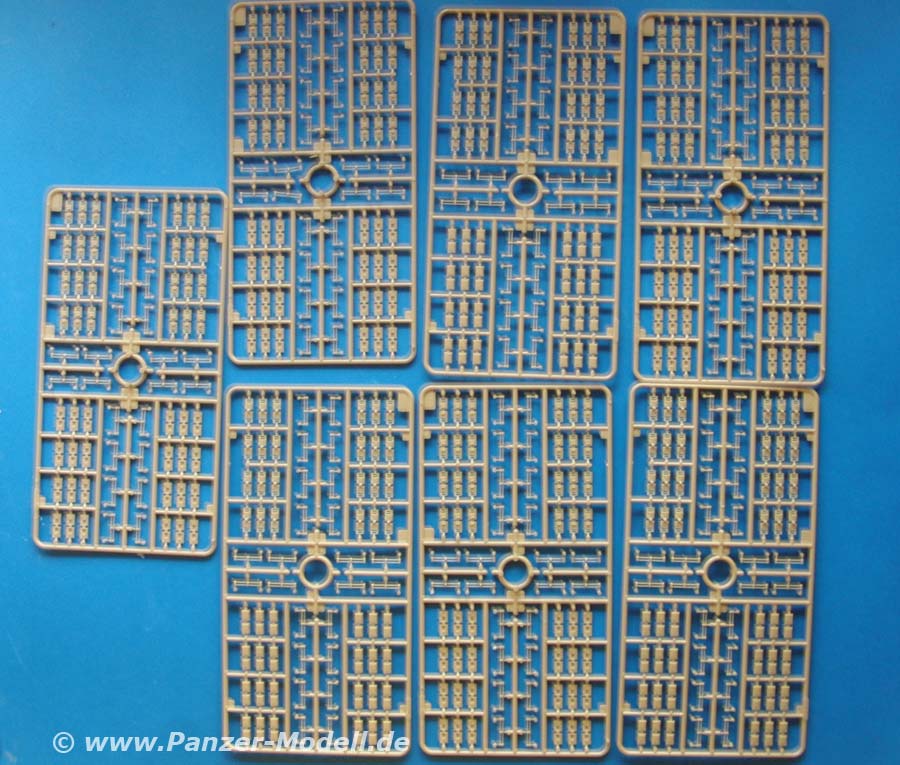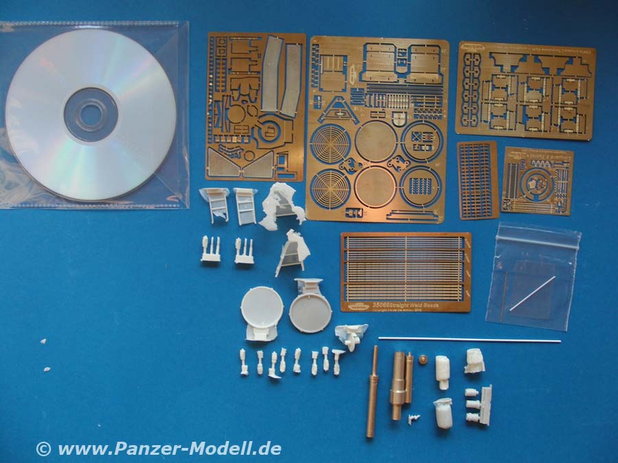 Das Set umfasst 6 PE Platinen mit 430 Teilen, 18 Resinteile, Plastikmaterial, Klarsichtmaterial und 9 Spritzlinge der Spritzguss Leopard 2 Kette von Bronco und eine CD auf der die Bauanleitung als PDF ist.