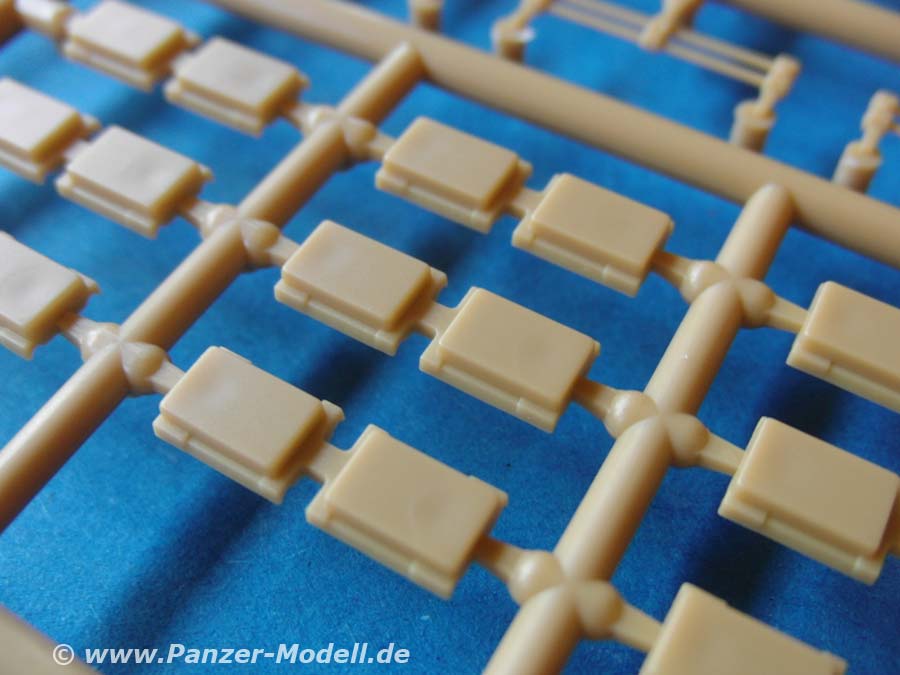 Die PE Teile umfassen neue Teile und ersetzen bestehende Plastikteile - enthalten sind PE Teile für die Stoßdämpferabdeckungen, Stützrollenhalter, Schweißnähte, Leitkreuz, Schmutzfänger, Lüfterringe, Werkzeughalterungen, Scharniere, Verriegelungen, Motorlüftergitter, Sechskantschraubenköpfe, ein komplett neues PERI, Lafettenringe, Kettchen für Nebelbecher und gelochtes Gittermaterial für die Staukörbe.