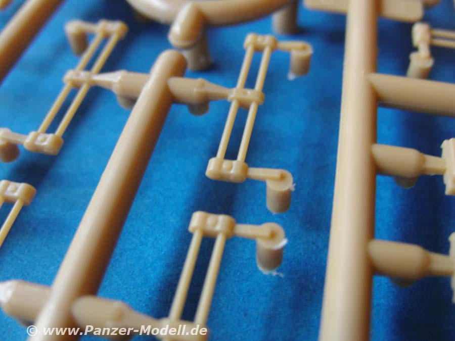 Die Resinteile sind fein und fehlerfrei gegossen - die Stangengestelle für die Staukörbe weisen relativ viel Fischhaut auf, die aber recht schnell versäubert werden kann. Diese Halterungen sind für mich mit eines der sinnvollsten Highlights des Bausatzes, denn die Bauart im Revell Modell ist nicht durchbrochen und lässt sich nicht einfach durch PE Teile ersetzen.