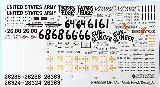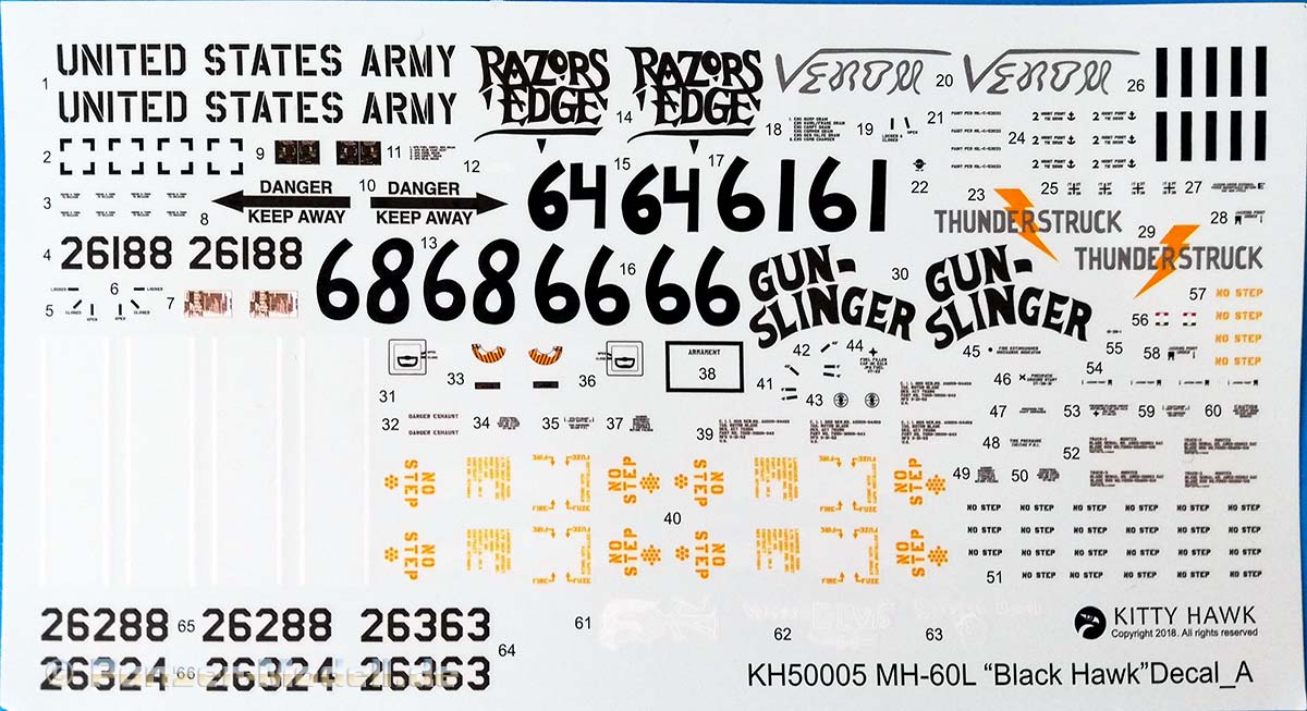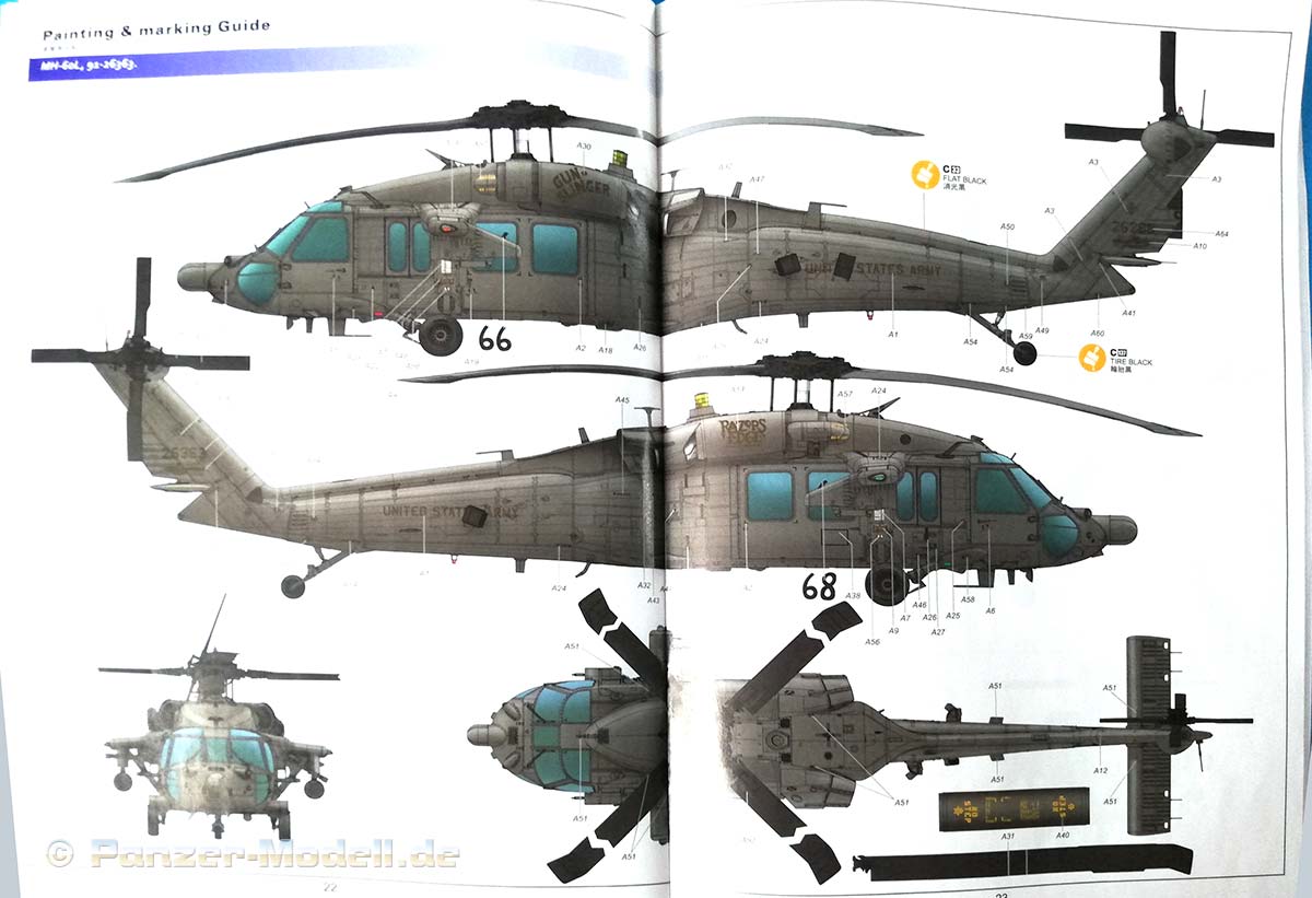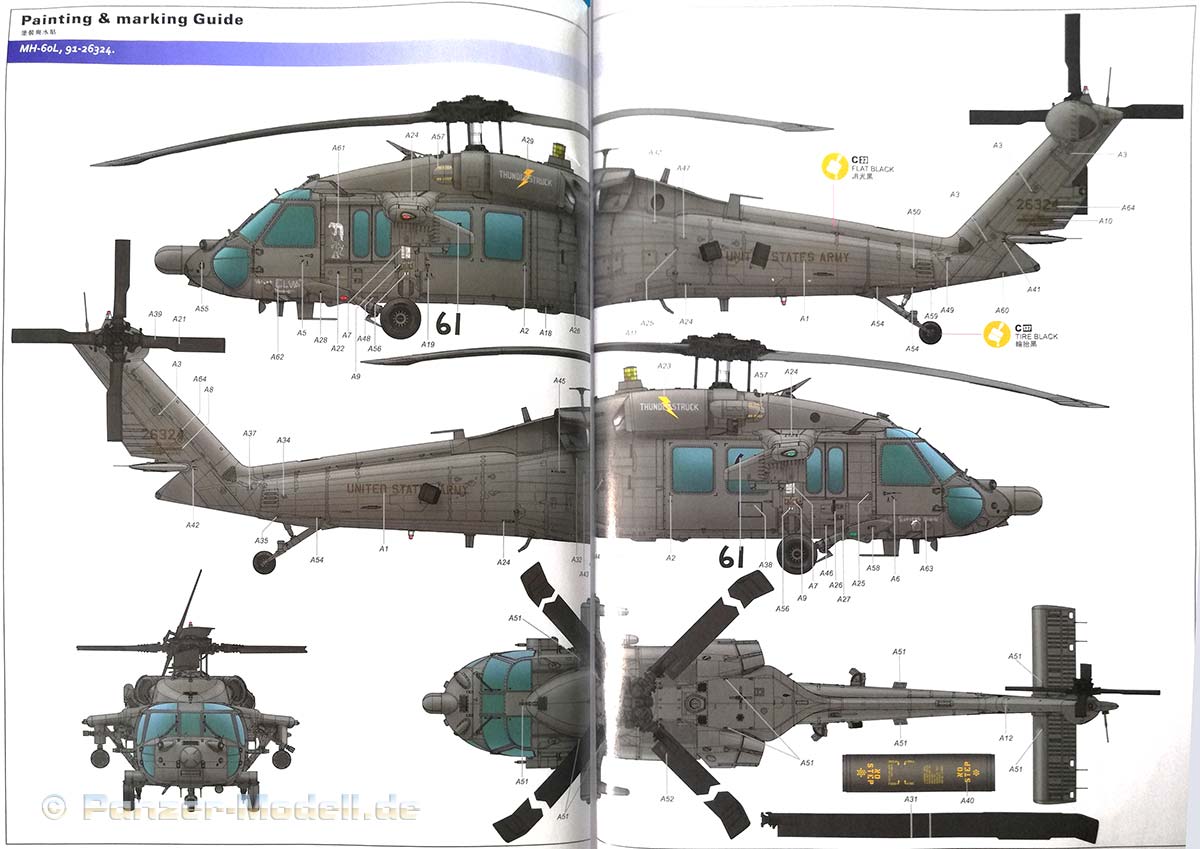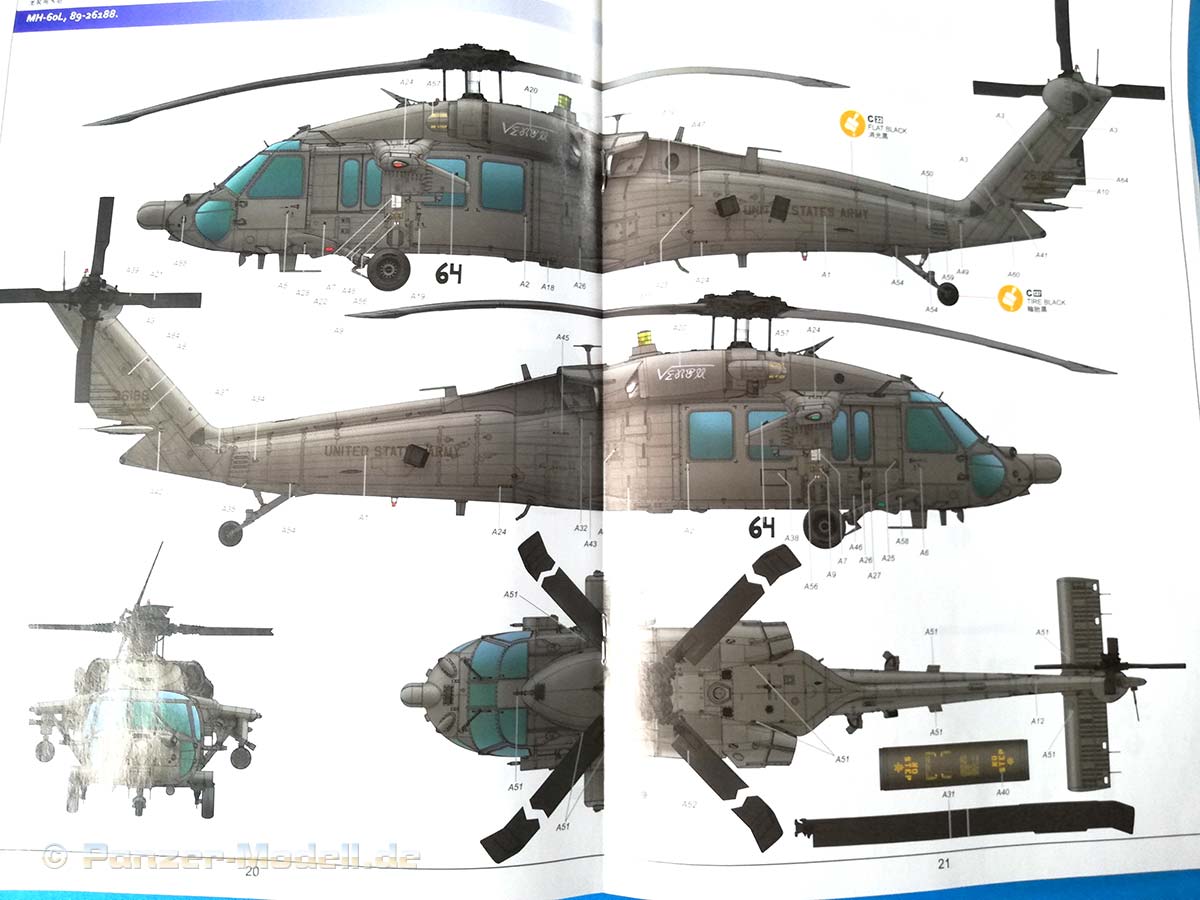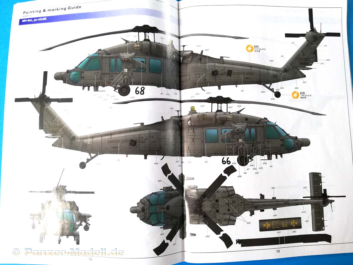 Der Sikorsky UH-60 Black Hawk ist ein zweimotoriger mittelgroßer Mehrzweckhubschrauber mit vier Blättern, der von Sikorsky Aircraft hergestellt wird. Die Variante MH-60L wurde für das Hubschrauberregiment des US Army Special Operations Command (160th SOAR) entwickelt. Diese basiert auf der UH-60L mit T700-701C-Motoren. Entwickelt in den späten 1980er Jahren als Interimsversion bis der MH-60K einsatzbereit war, wurde diese Version mit FLIR, Farbwetterkarte, Hilfskraftstoffsystem und Laserentfernungsmesser ausgestattet. Insgesamt wurden 37 MH-60L gebaut, und bis 2003 hatten 10 eine Betankungssonde erhalten. Der MH-60L wird hierbei als reines „Gunship“ eingesetzt , und nicht zum Truppentransport. Berühmtheit erhielt diese Version am Anfang der 90er Jahre durch den Einsatz über Somalia in der Schlacht um Mogadishu hier wurden zwei der bis dahin geheimen MH-60L abgeschossen und mussten während der danach ausbrechenden Straßenkämpfe gesprengt werden. Dieses Ereignis wird im Film „Black Hawk Down“ von Ridley Scott aus dem Jahr 2001 beeindruckend dargestellt. Nach dem Academy Modell des UH-60A/L von 2001 und seiner Versionen kommt jetzt ein moderner Bausatz des amerikanischen Standardhubschraubers, zunächst in der Version der Special Forces. An acht sauber gespritzten grauen Spritzlingen und einem klaren Spritzling (dieser ist separat verpackt vorbildlich) finden sich feine und teilweise sehr filigrane Bauteile. Die Rumpfhälften und zwei Abdeckungen liegen als separate Teile bei. Auswerfermarken an später sichtbaren Stellen und Fischhaut sucht man hier vergebens, allerdings sind doch einige etwas größere Gusslunker an den Rumpfhälften zu entfernen dies sollte aber dank der Platzierung an einer geraden Kante kein Problem darstellen. Sechs der Spritzlinge sind für die Hubschrauber an sich und zwei Spritzlinge beinhalten die Bewaffnung (19 Schuß Hydra 70 Raketenbehälter, Hellfire & Stinger Raketen M230 30mm Chaingun, GAU-19 & M134 Waffenbehälter, M134D Miniguns und .50 Cal Maschinengewehre), und Teile der Triebwerke. Der Bausatz enthält eine komplette Darstellung des T700-701C Triebwerkes, welches auch offen präsentiert werden kann. Top für Diorama Fans die eine Wartungsszene erstellen wollen. Die Gravuren und erhabenen Nietenreihen des Modells sind fein und sauber ausgeführt und überzeugen auf ganzer Linie. Das ganze Modell wirkt hierdurch sehr filigran, trotz seiner beachtlichen Größe. Auswerfermarken an später sichtbaren Stellen und Fischhaut sucht man hier vergebens. Es liegen zwei Ätzteilplatinen zur Verfeinerung bei. Unter anderem auch alle Sitzgurte für die Sitze. Die Bauanleitung führt in ca. 30 Schritten zum fertigen Modell. Ein Diagramm für die möglichen Bewaffnungsoptionen ist ebenfalls vorhanden. In der Mitte der Bauanleitung finden sich vier Bemalungsanleitungen diese müssen allerdings herausgetrennt werden, da ansonsten die einzelnen darstellbaren Hubschrauber nicht korrekt abgebildet sind, was zur Verwirrung führen könnte. Es lassen sich vier Maschinen aus dem Einsatz des 160th SOAR in Somalia im Oktober 1993 darstellen. Auch liegt ein kleiner Decalbogen zur Darstellung des Instrumentenbrettes bei. Bei den Markierungsmöglichkeiten liegt allerdings auch die Krux des Bausatzes. Wenn man streng nach der Bauanleitung geht, soll man alle Sitze in den Frachtraum einbauen (was hier FALSCH ist), und es wird nicht auf die mögliche Bewaffnung des „Gunships“ eingegangen. Dies geschieht leider erst auf den letzten Seiten. Auch mit einem schönen Diagramm der möglichen Bewaffnungsoptionen, nur wird auch hier nicht auf die Bewaffnung der darstellbaren Maschinen eingegangen. Alle der in den Decaloptionen enthaltenen Maschinen hatten zum Beispiel keine Stummelflügel, sondern Cover an diesen Stellen, welche von Kitty Hawk zwar beigelegt wurden, in der Bauanleitung aber keine Erwähnung finden. In Somalia wurden diese Maschinen normalerweise nur mit M134D Miniguns bestückt geflogen. Auch scheinen bei den damaligen Maschinen nicht alle Anbauteile vorhanden gewesen zu sein. Hier hilft nur ein intensives Quellenstudium (Siehe „Operation Gothic Serpent“) und ein genauer Plan, wie man beim Bau vorgeht. Es sollten auch genug Teile für die Grabbelkiste überbleiben, zum Beispiel könnte man mit den Sitzen das Academy Modell pimpen Mein Fazit: Ein klasse Modell dieses wichtigen Hubschraubers im richtigen Militärmaßstab. Leider muss man einiges an Recherche investieren, wenn man die Decals korrekt einsetzten will, wem das aber egal ist, wird mit einem beeindruckenden Modell direkt aus dem Kasten belohnt. Absolute Kaufempfehlung. Danke für das Muster an: