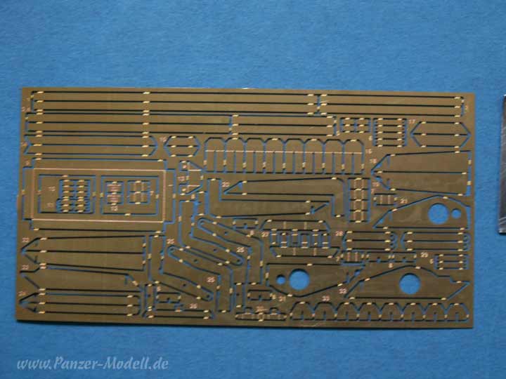 Desweiteren liegen Zwei verschiedene Kanonenrohre mit unterschiedlichen Mündungsbremsen bei, wie auch die Extra Spannrolle, Werkzeug und Staukisten und vor allen die exzellenten PE Teile, die vor allem für die Nietenbleche auf den Kettenblechen, aber auch für Schutzbügel und Abdeckungen und zusammen mit 0,5mm Draht den sehr gut aussehenden Turmstaukorb bilden!