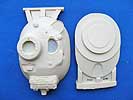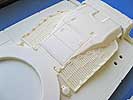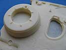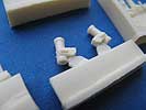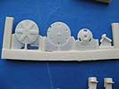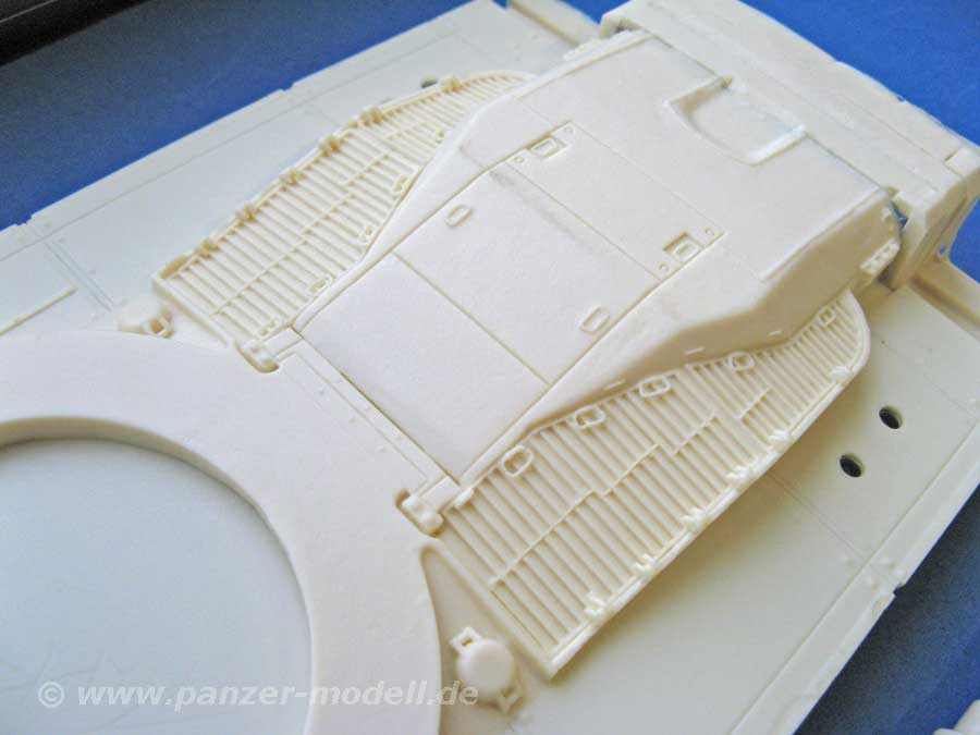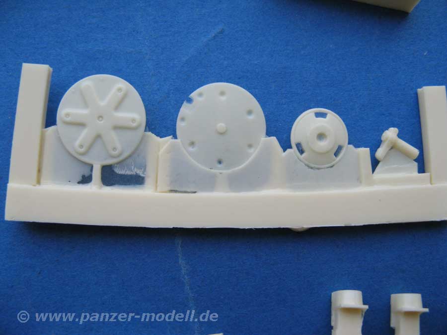 Im Karton finden sich neben einer komplett neuen Oberwanne mit hochgezogenem Motordeck und dem komplett neuen Turm mit sämtlichen Anbauteilen. Viele der Teile sind bereits aus den A1 und A2 Umbausätzen bekannt und in gleich guter Qualität vorhanden. Die Oberwanne weist gelegentlich ein wenig Schrumpfung oder minimalsten Verzug auf, der sich aber entweder nicht auswirkt oder unter heissem Wasser schnell behoben ist. Die kettenbleche erscheinen allerding seine Idee zu schmal.