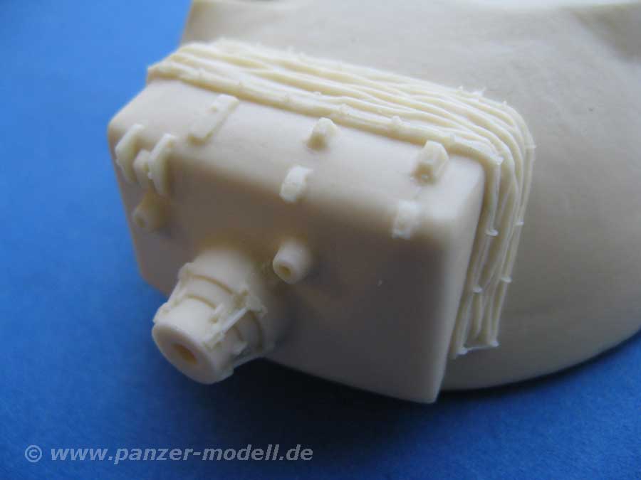 Die übrigen Resinteile liegen in gewohnt guter Qualität mit feinen Details vor, welche durch ein umfangreiches PE Set verfeinert, bzw. ergänzt werden. Hier sind insbesondere die Stege auf den Kettenblechen, welche mit Resinnieten verfeinert werden, sowie Schutzabdeckungen vertreten. Für Handgriffe und den Staukorb am Turmheck liegen Messingdrähte bei und für die Abschleppseile entsprechendes Seilmaterial mit Resinkauschen.