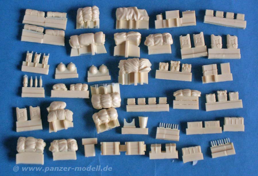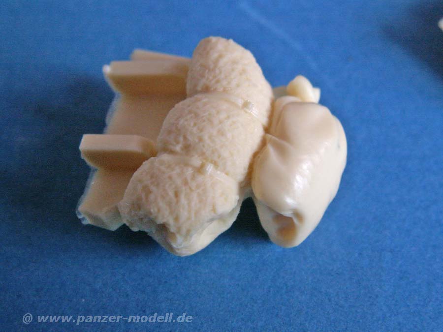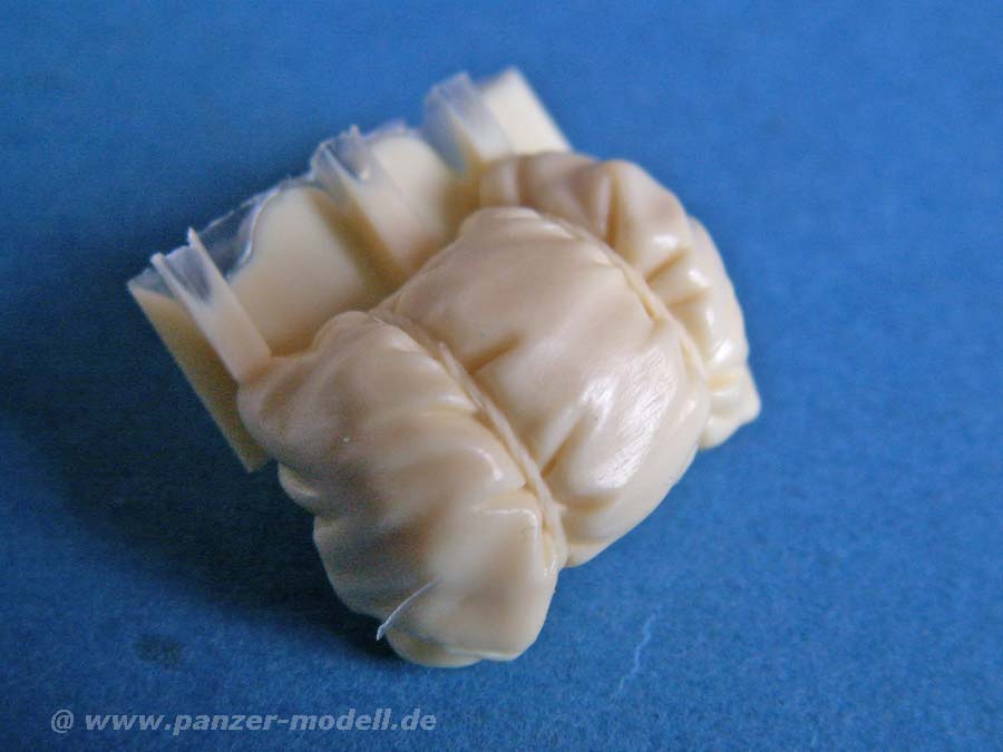 Die Gussqualität ist sehr gut, ohne Lufteinschlüsse oder Verzug, die Details sind gut dargestellt, gerade die Einschnürungen und der Faltenwurf an den Packsäcken. Die Angüsse sind in der Regel an den Flächen, die später sowieso auf der Modellseite sind und daher die Versäuberung nicht schwierig ist.