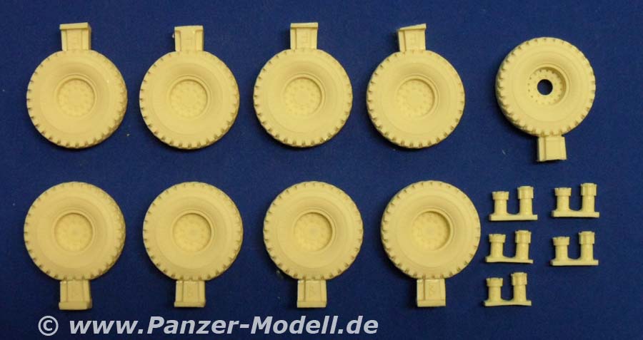 Als wirklich sinnvolle Ergänzung zum Italeri Oshkosh liefert Legend nun ein Set mit neuen Rädern. Vier Vorder-, vier Hinter- und ein Ersatzrad plus Felgennaben bilden den überschaubaren Inhalt des Sets. Die Urmodelle und der Guss sind erstklassig und weisen weder Verzug noch Luftblasen auf. Die Angüsse sind gleichzeitig die Laufflächen. Die Montage erklärt sich von selbst, weshalb auch kein Bauplan beiliegt. Fazit: Egal wie mans dreht und wendet, so bilden die Räder des Italeri Bausatzes die Schwachstelle. Auch sind sie nicht wirklich aktuell. Legend Bausätze bekommen Sie z.B. bei: