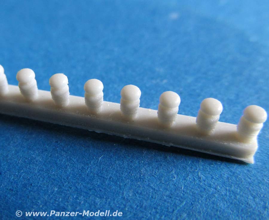 Der Guss der Resinteile ist gut und die Details fein dargestellt. Die Stopfen weisen schön die äussere Rundung und am flachen Ende die Riffelung auf. Jeder Stopfen sitzt mit dem flachen Ende auf einem kleinen Anguss der daher leicht abzutrennen ist.
