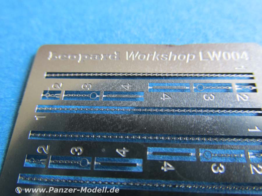 Die PE Teile sind sehr sauber und fein geätzt und stellen die unterschiedliche langen Kettchen dar, an denen die Stopfen im Normalfall sitzen. Dies sind pro Fahrzeug jeweils 4 Stopfen und den entsprechenden Kettchen für Blende und Bugwanne.