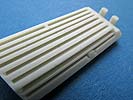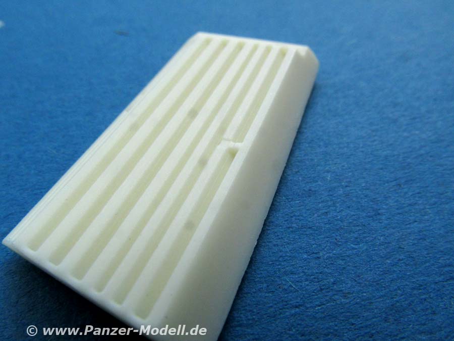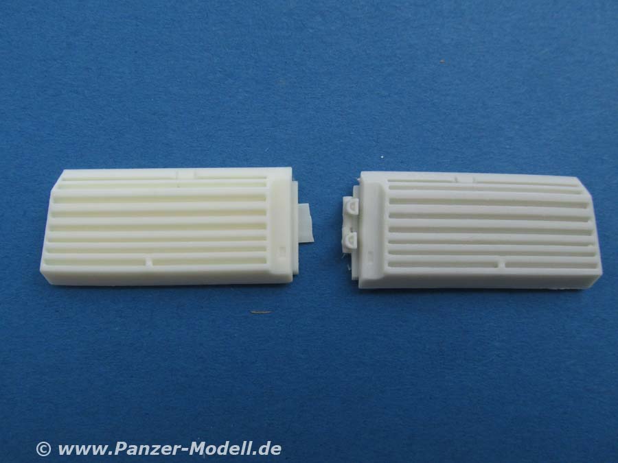Diese Teile stellen die Auspuffgitter der Leoparden in Strangpressprofilbauweise dar und ersetzen die teilweise mäßig bis schlecht detaillierten und mit zuwenig Tiefe versehenen Bausatzteile der gängigen Hersteller. Ausserdem stellen diese resinteile endlich die tatsächlichen Maßverhältnisse der Stränge dar, denn an allen Spritzgussmodellen sind diese einheitelich und mit gleichem Abstand, was am Original aber nicht der Fall ist, plus der kleinen Verbindung oben und den beiden untersten Lamellen.