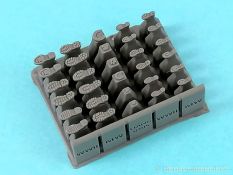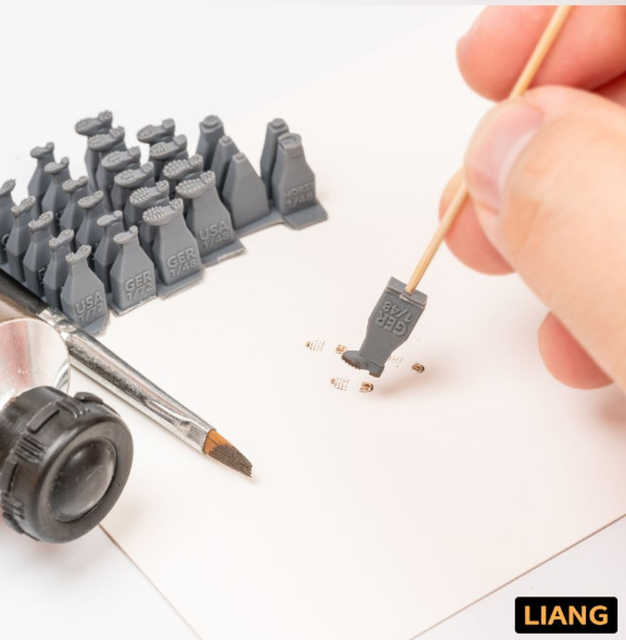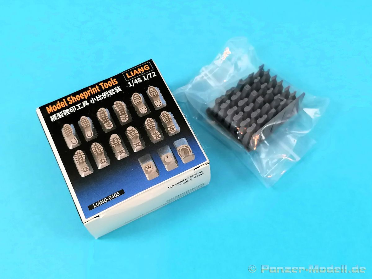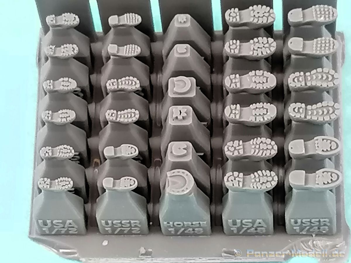 Nachdem die größeren Maßstäbe schon mit Schablonen für Schuhabdrücke versorgt sind folgt unter der o.g. Nummer ein weiteres Set für die kleineren Maßstäbe. In der kleinen Kartonbox befinden sich insgesamt 12 Paar Stiefel. Abgedeckt werden die USA, Deutschland und Rußland. Die Identifizierung der Stiefel ist einfach. An jedem Schaft des Stempels ist die entsprechende Nation und der Maßstab angegeben. Als Gimmick kommen noch Abdrücke für Pferde, Schweine und Katzen dazu… Auch in diesem Fall ist der Druck extrem fein und fehlerlos. Ein kleiner Hingucker allemal…