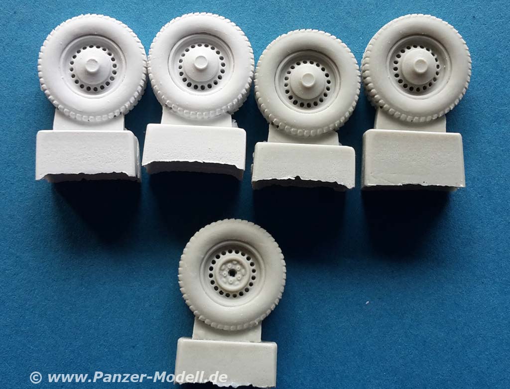 Das vorliegende Set enthält 5 Resinteile zur Darstellung der Reifen plus Ersatzreifen des VW T3 im Maßstab 1:35.