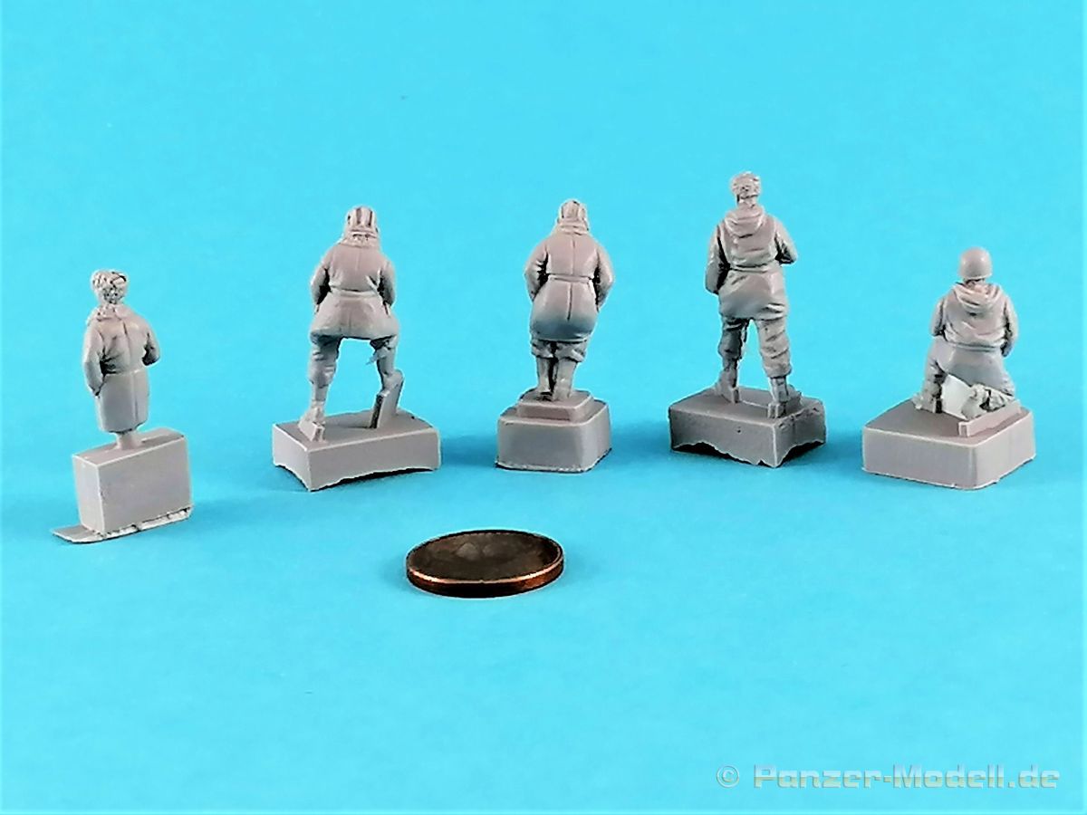 Erneut werden die 1:72er Modellbaufreunde mit einem sehr schönen Set Figurenset von Macone bedacht.. In der Blisterverpackung befinden sich insgesamt vier komplette Figuren sowie zwei Halbfiguren. Dazu kommen noch zwei Waffen mit angegossenen Händen. Drei der Kamaraden stehen in relativ universellen, legeren Haltungen da, während eine Weitere in knieender Position dargestellt ist. Die Halbfiguren sind von der Pose für die Bestückung eines Panzers ausgelegt. Der Guß der Resinfiguren kann für diese Größe durchaus überzeugen. Der stellenweies vorhandene Grat sollte sich auf jeden Fall schnell beseitigen lassen. Auch die Gesichter sind sehr gut definiert dargestellt. Mützen, Stahlhelme, Panzerschutzhauben, alles passt. Auch der Kopfhörer des Pz-Kommandanten wurde nicht vergessen. Details, die teilweise erst mit einer Lupe zum Vorschein kommen. Schön gemacht z.B. auch die Hände bei denen man die einzelnen Finger klar erkennen kann. Ausrüstungsgegenstände gibt es hier nicht, dafür können aber Hosen und Jacken u.a. mit dem Faltenwurf überzeugen. Auf zwei Stegen werden noch ein Gewehr und eine MP mitgeliefert an denen die Hände angegossen sind. Jedenfalls hat Macone einen feinen Job gemacht und ein Set herausgebracht das durchaus seine Anhänger finden wird. Im übrigen sehen die Figuren auch in diesem Fall real besser aus als auf den Fotos…