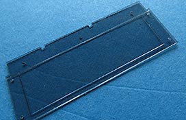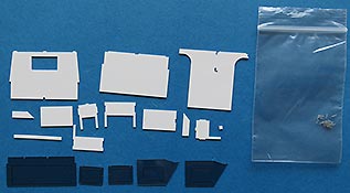 In der Packung finden sich 13 gelaserte Plastikteile, 5 transparente Plastikplatten mit schwarzer Tönung und 17 winzige Schrauben aus Resin.
