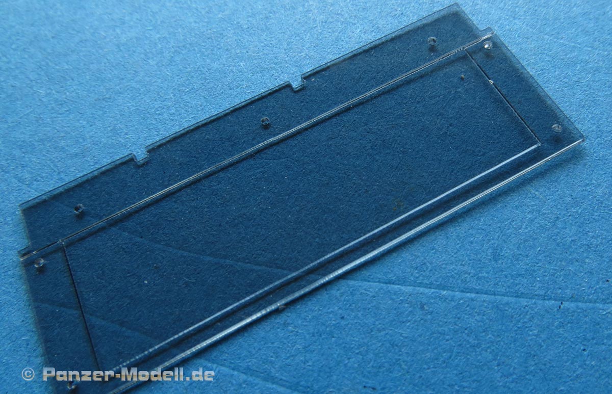 Besonders gefällig sind die beigelegten Darstellungen für die gepanzerten Scheiben. Diese bestehen aus dunkel gefärbten, transparenten Plastikteilen, die hervorragend die dicken Panzerglasscheiben simuliert. Besonders hervorragend ist, dass hier die Panzerelemente mit den implementierten Scheiben als Komplettbauteil mit eingravierten Details gemacht sind - das macht den Bau viel einfacher und sauberer.