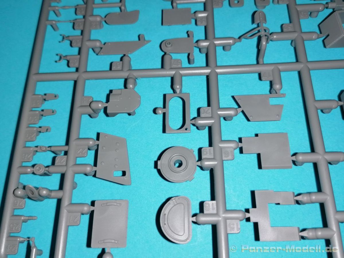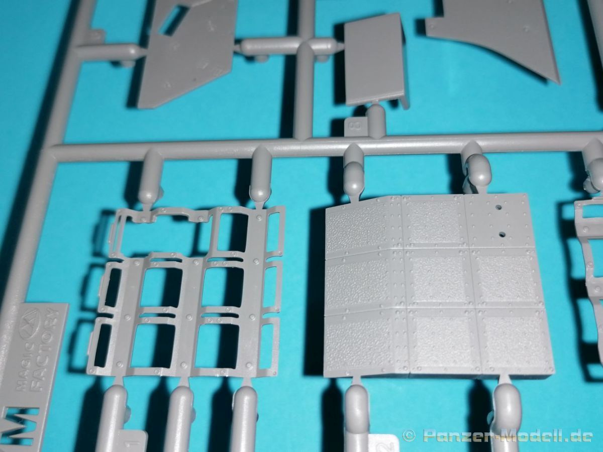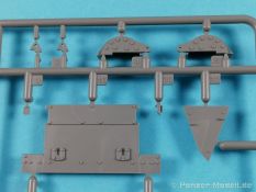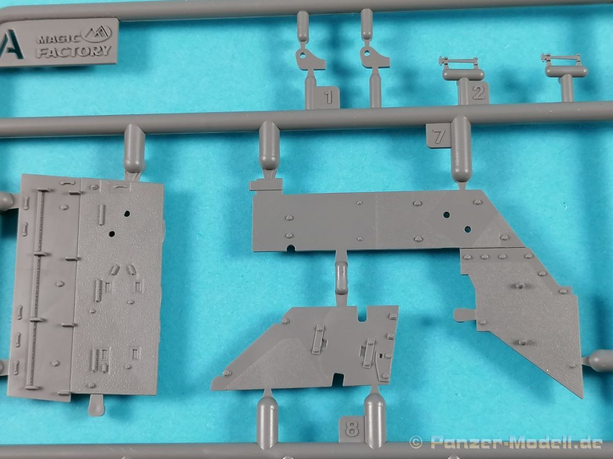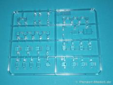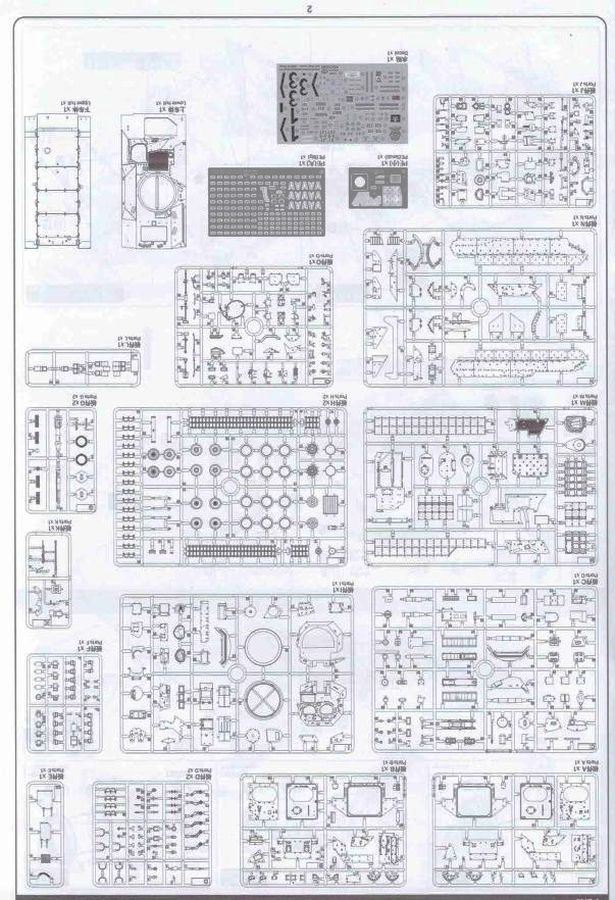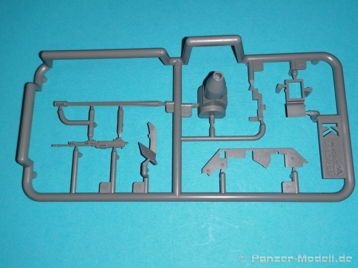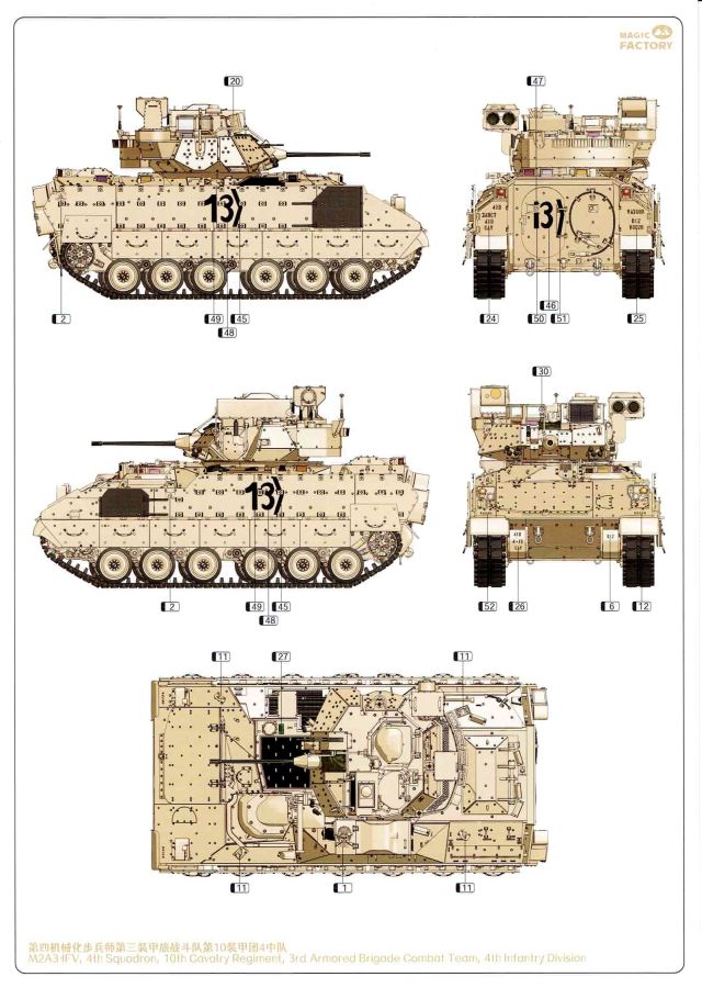 Auch Magic Factory hat sich mittlerweile dem Bradley zugewandt. Gut verpackt kommen die Bauteile in einem Top-Opener mit den Maßen 35x24x11,5 cm auf unsere Basteltische. 17 Rahmen in einem angenehmen Hellgrau, ein Spritzling mit Klarteilen, eine Panzer- und Oberwanne, dazu zwei PE-Platinen, einige Vinylteile und ein Decalbogen sowie eine kleinere als DIN-A4 Bauanleitung in Heftform. Schon auf den ersten Blick zeigt sich der Guß der Bauteile auf allerhöchstem Niveau. Es macht schon Spaß sich die einzelnen Gußrahmen Stück für Stück näher anzusehen. Auswerfermarken, Fischhaut, Senker, Formenversatz und/oder verzogene Teile sind keine auszumachen. Auswerfer sind samt und sonders in Bereichen die sich nach dem Zusammenbau dem Blick entziehen. Punkten können bei den Bauteilen die durchweg scharfen Details. Das gilt ebenso für die kleinen Teile. Erste Sahne! Eine Probepassung von Unter- und Oberwanne, absolut perfekt und spaltenfrei, deutet auch auf eine sehr gute Passform des Bausatzes hin. Wo nötig wurde die Slide-Mould-Technik angewandt. So sind die Mündungen der kleinsten Rohre der Waffen offen. Die Mündungsbremse der Maschinenkanone ist hervorragend umgesetzt und bedarf keinerlei Nacharbeit. Ebenfalls interessant die Tatsache das der Antirutschbelag feinst wiedergegeben ist. Hier kann eigentlich alles überzeugen. Auch kleinsten Details wie Nieten, Bolzen, Scharnieren, Verschlüssen etc. wurde Beachtung geschenkt. Die Klarteile, die ihren Namen zu Recht verdienen, geben keinen Anlaß zur Kritik. Alles schick! Die PEs, geschützt durch zwei Folien reihen sich in ihrer Feinheit in die hohe Qualität des Kits ein. Vorteil der größeren Platine sind bereits versäuberte Teile die direkt verbaut werden können. Auf der kleineren Platine finden sich diverse Abdeckgitter und als Gimmick noch eine Schablone für die Laufrollen. Was will man mehr. Einen überzeugenden Eindruck hinterlassen die Decals, die absolut im Register sind und auch farblich gefallen. Die noch offenen Vinylteile (Abdeckungen etc.) würde ich nicht verwenden da eine Verklebung schlecht oder gar nicht zu realisieren ist. Das kann aber jeder für sich entscheiden. Und damit geht es auch schon zur Bauanleitung. Diese umfasst 22 Seiten und bringt das Modell in 46 Baustufen zum Abschluß. Für die Bemalungsvorschläge etc. gibt es zusätzlich ein vierseitiges Faltblatt mit weiteren Informationen und Hinweisen. Während auf dem Deckblatt der Panzer im Riß mit seinen drei Varianten abgebildet ist geht es auf der nächste Seite mit einem Text zum Original weiter (chinesisch und englisch). Dazu die üblichen Hinweise zum Werkzeug und die Piktogramme für den Bau. Auf Seite zwei folgt dann wie gewohnt die Übersicht aller Bauteile bevor der Bau auf Seite drei startet. Anmerkung: Vor Baubeginn sollte man sich mit der Anleitung vertraut machen. Diese ist relativ komplex und enthält in den einzelnen Schritten evtl. leicht übersehbare Hinweise. Der geneigte Modellbauer sollte sich zuerst die Version aussuchen die er bauen möchte und anschließend die Hinweise in der Anleitung markieren. Denn nichts ist frustrierender als wenn man vom “rechten Pfad” abgewichen ist und das zu spät merkt. Da die Schrift relativ klein ist könnte eine Lupembrille von Vorteil sein.
