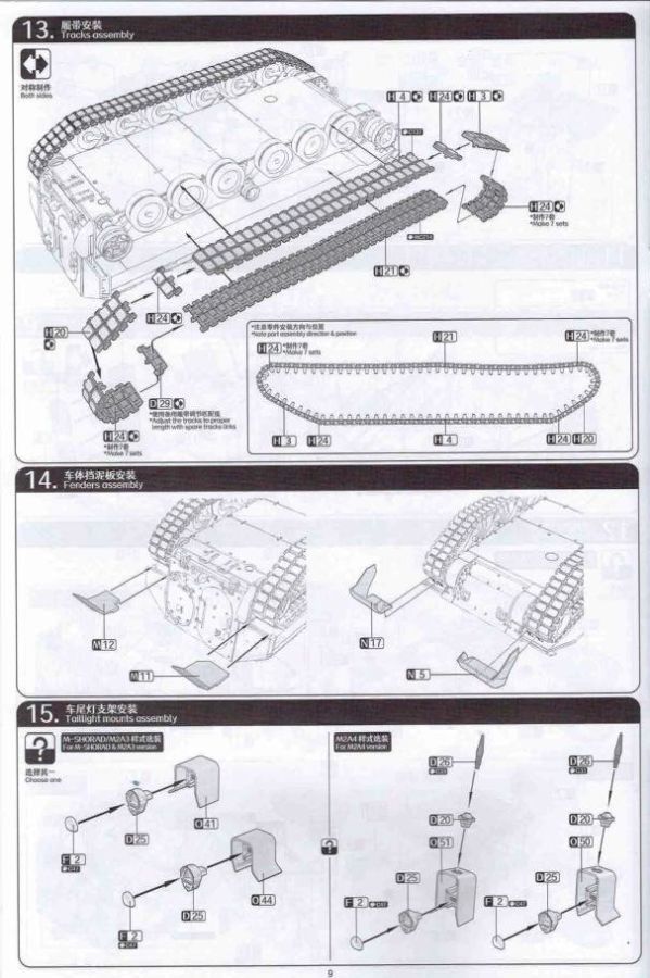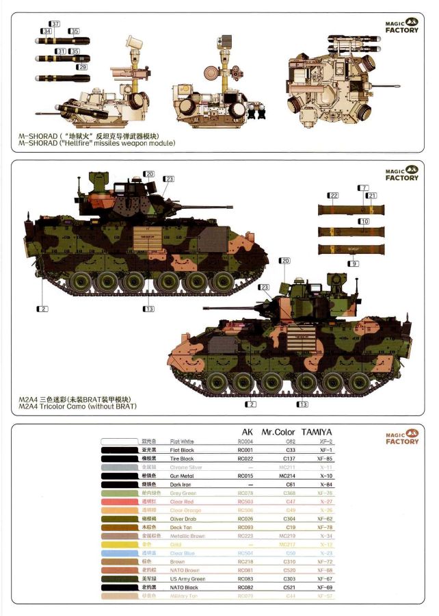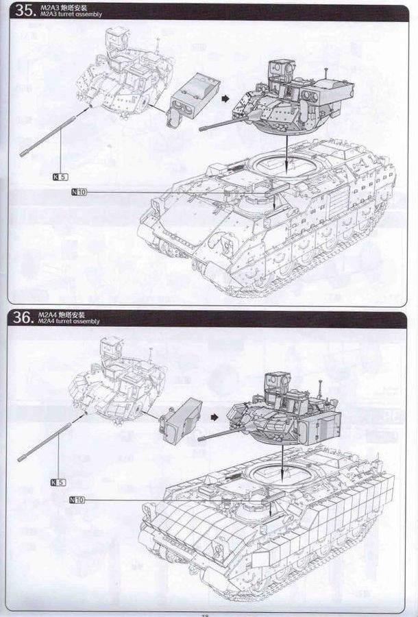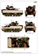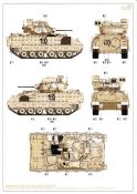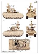 Das Ganze startet klassisch in den ersten beiden Schritten mit dem Panzerunterteil und den Laufrollen die mit extra gespritzen Gummibandagen punkten. Bereits in der ersten Grafik sind Untergruppen enthalten die auf bestimmte Versionen mit den spezifischen Bauteilen hindeuten. Relativ klein sind Hinweise zur Bemalung. Den Farbzahlen ist jeweils als Icon eine Palette vorangestellt. Wenn Löcher zu bohren sind, wie bei der Oberwanne wird jeweils die Bohrerstärke mit angegeben. Sehr löblich. Nachdem in der Oberwanne die Periskope verbaut sind beschäftigt sich die Anleitung in den nächsten Schritten mit dem Anbau der Panzerung, gefolgt von den verschiedensten Aufbauteilen der Oberwanne und dem Heckbereich. Manchmal ist es zielgerechter Kleinteile erst auf die Seite zu legen und diese nach der Kettenmontage sowohl auch der Schürzen zu verbauen. Die Ketten Typ Segmentketten, ebenfalls sehr gut gestaltet dürften sich ob ihrer Größe problemlos verarbeiten lassen. Mit der Montage von noch offenen Bauteilen findet der Bau des Panzerunterteils in Abschnitt 22 seinen Abschluß. Bis Baustufe 33 erstreckt sich das Zusammenfügen des Turms mit seinen Anbauteilen. Alles ebenfalls zeichnerisch gut dargestellt und nachvollziehbar. Den Zusammenbau diverser Waffenstationen und Waffen sowohl deren Optionen bei der Montage zeigen die nächsten Schritte. Blenden wir jetzt noch um zu den Bemalungsvorschlägen. Drei Stück stehen zur Auswahl. 1. M2A4 IFV, 6th Squadron, 8th Cavalry Regiment, 2nd Armored Brigade Combat Team, 3rd Infantry Division 2. M2A3 IFV, 4th Squadron, 10th Cavalry Regiment, 3rd Armored Brigade Combat Team, 4th Infantry Division 3. BAE Systems, AUSA 2017, Washington DC, 2017 (Demonstrator) Dazu kommen noch Hinweise zur Bemalung der “Hellfire” Waffenstation und eine Ansicht des M2A4 ohne BRAT. Die angegebene Legende zu den Farben umfasst drei Hersteller. AK (nicht vollständig), Mr. Color und Tamiya. Fazit: Wir haben einen erstklassigen Kit vor uns liegen der unter dem Strich keine weiteren Zubehörteile benötigt und auch das Preis-/Leistungsverhältnis in Ordnung geht. Jedoch nichts für Anfänger! Ein Portion Erfahrung im Modellbau sollte vorhanden sein!
