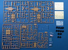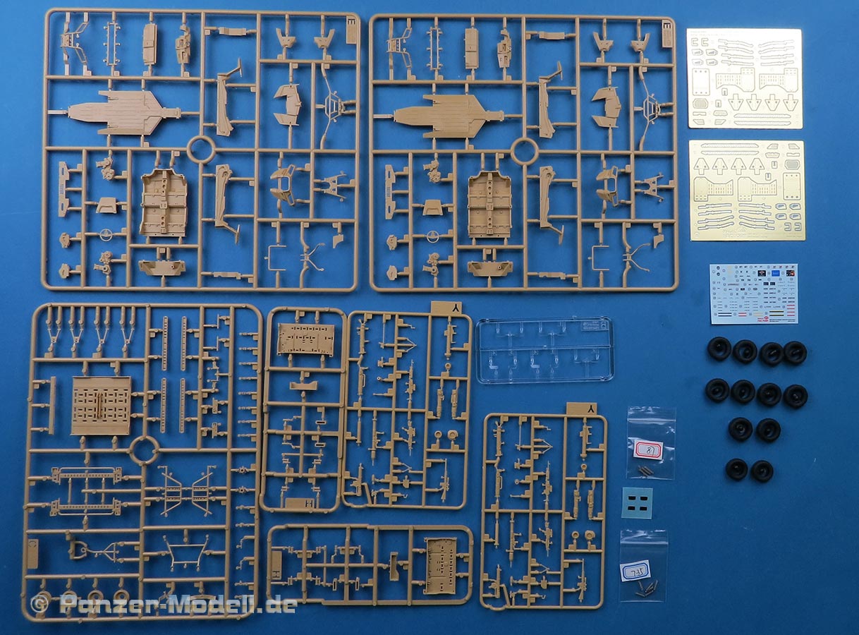 Im Bausatz Karton finden wir 16 beige Spritzlinge, ein klarer Spritzling, zwei PE Platinen, 12 Vinylreifen, 10 Metallfedern, Spielgelsticker und einen Decalbogen.