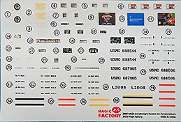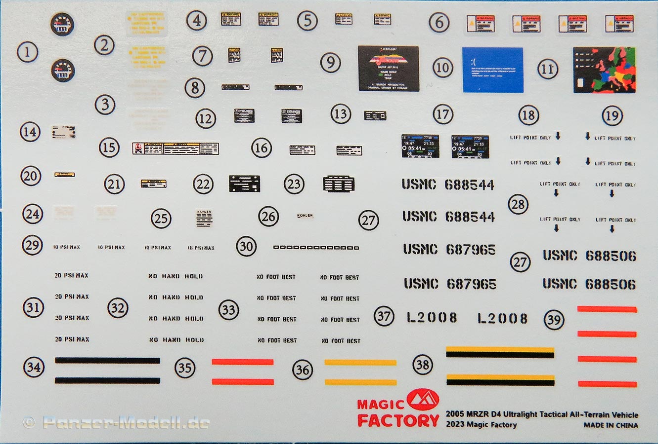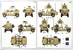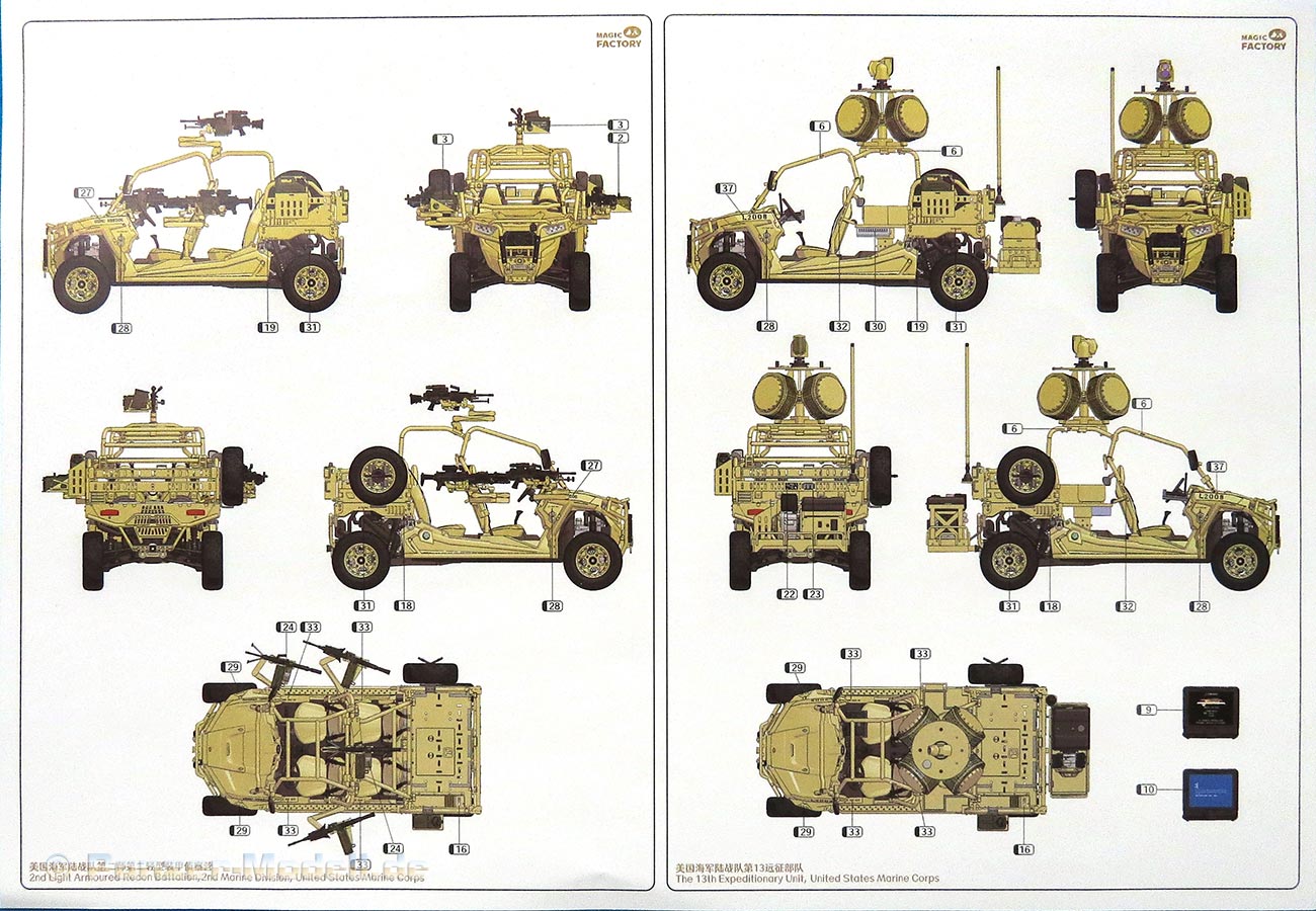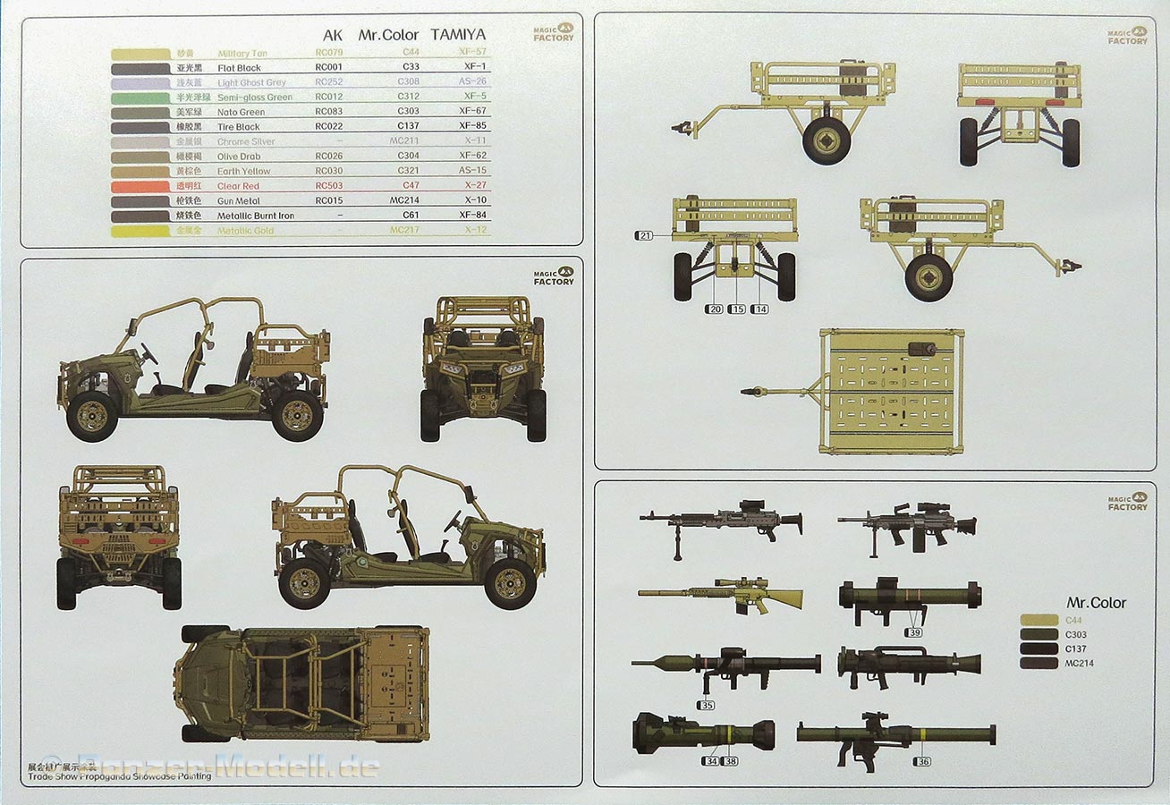 Auf einem separaten, doppelseitig gedruckten DIN A4 Bogen ist die Bemalung und Markierung von drei Versionen, des Anhängers und der Handwaffen gezeigt.