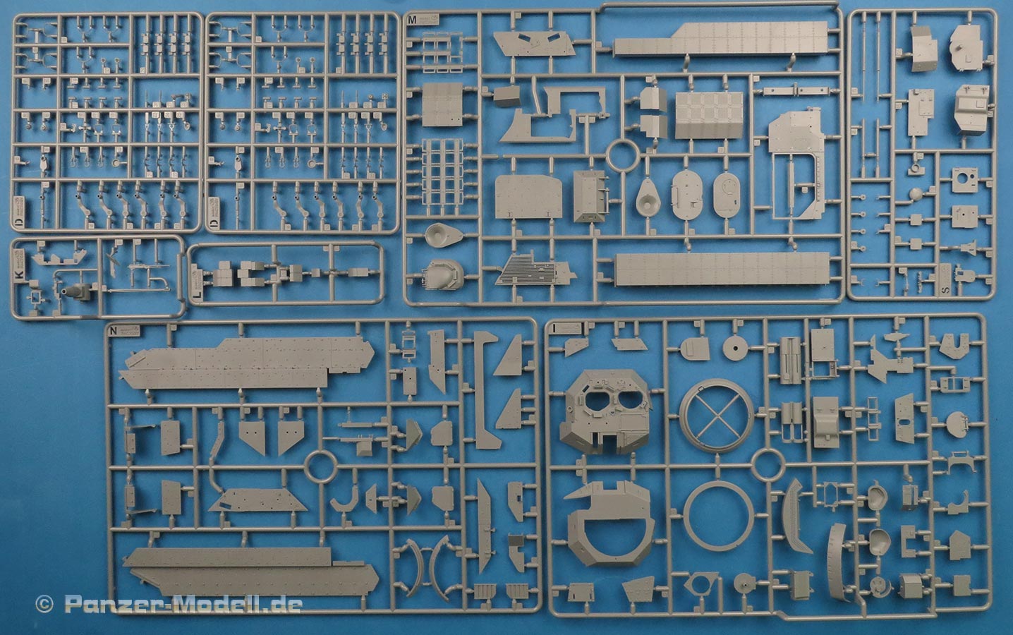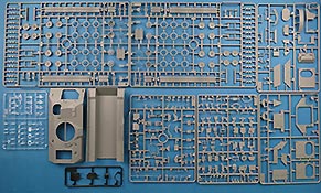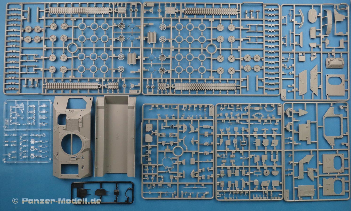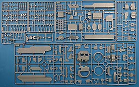 Im vollgepackten Bausatzkarton finden wir 14 graue Spritzlinge, einen transparenten Spritzling, einen schwarzen Weichplastikspritzling, Oberwanne, Unterwanne, 2 PE Platinen, ein Metallrohr mit Mündungsfeuerdämpfer, irisierende Folie, Masken und einen Decalbogen.