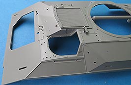 Die Oberwanne ist ebenfalls einteilig, wird aber durch Massen von Anbauteilen vervollständigt. Alle Luken sind offen und durch die einzelnen Luken offen oder geschlossen baubar. Dies gilt auch für die Heckwand mit der großen Heckluke. Da der Bausatz keine Inneneinrichtung beinhaltet, ist die offene Darstellung an dieser Stellen nicht sinnvoll - aber vielleicht gibt es Modellbauer die eine Inneneinrichtung scratch bauen oder eine einzeln verfügbare Inneneinrichtung einbaut.
