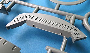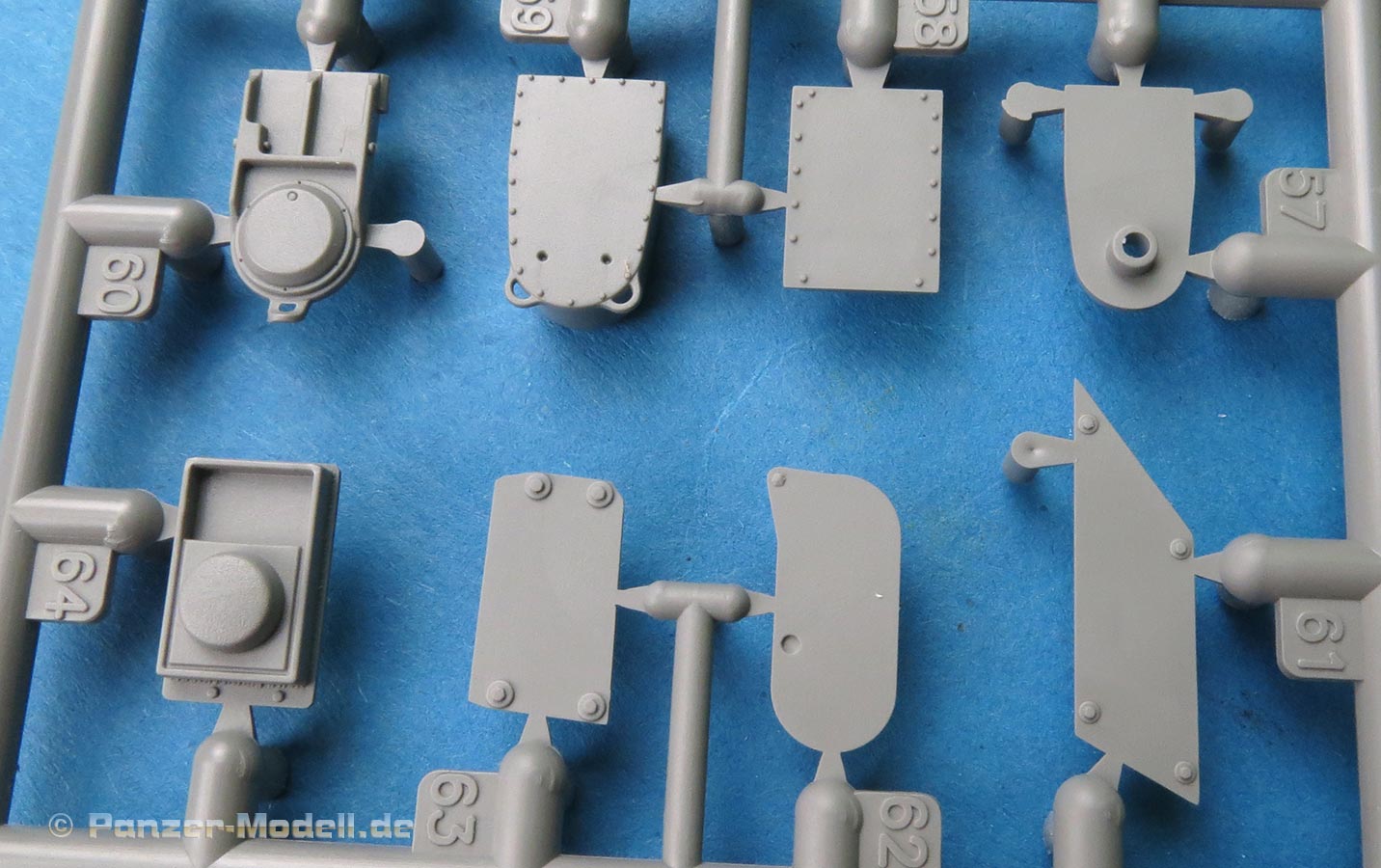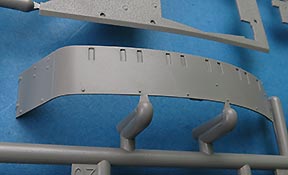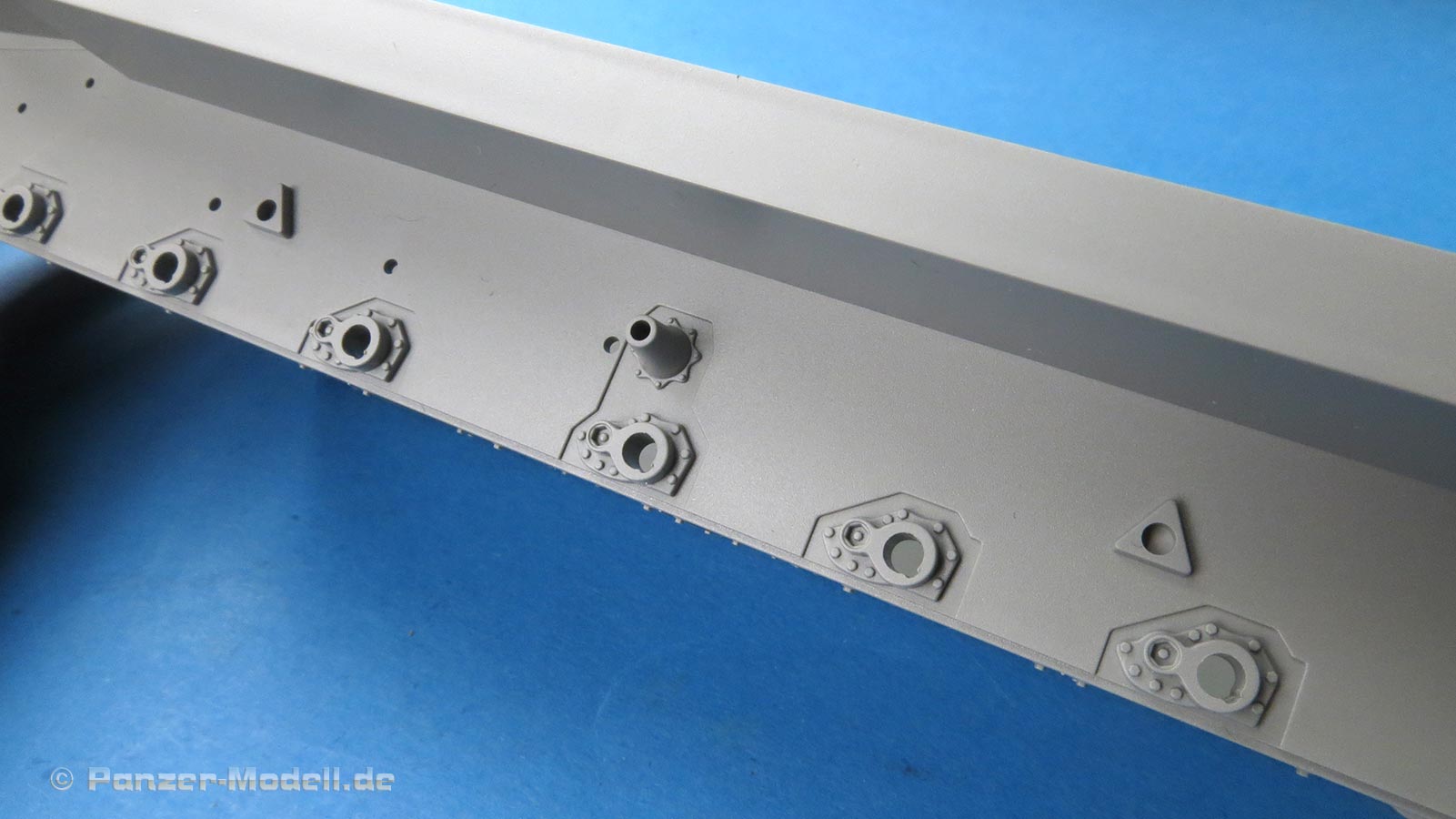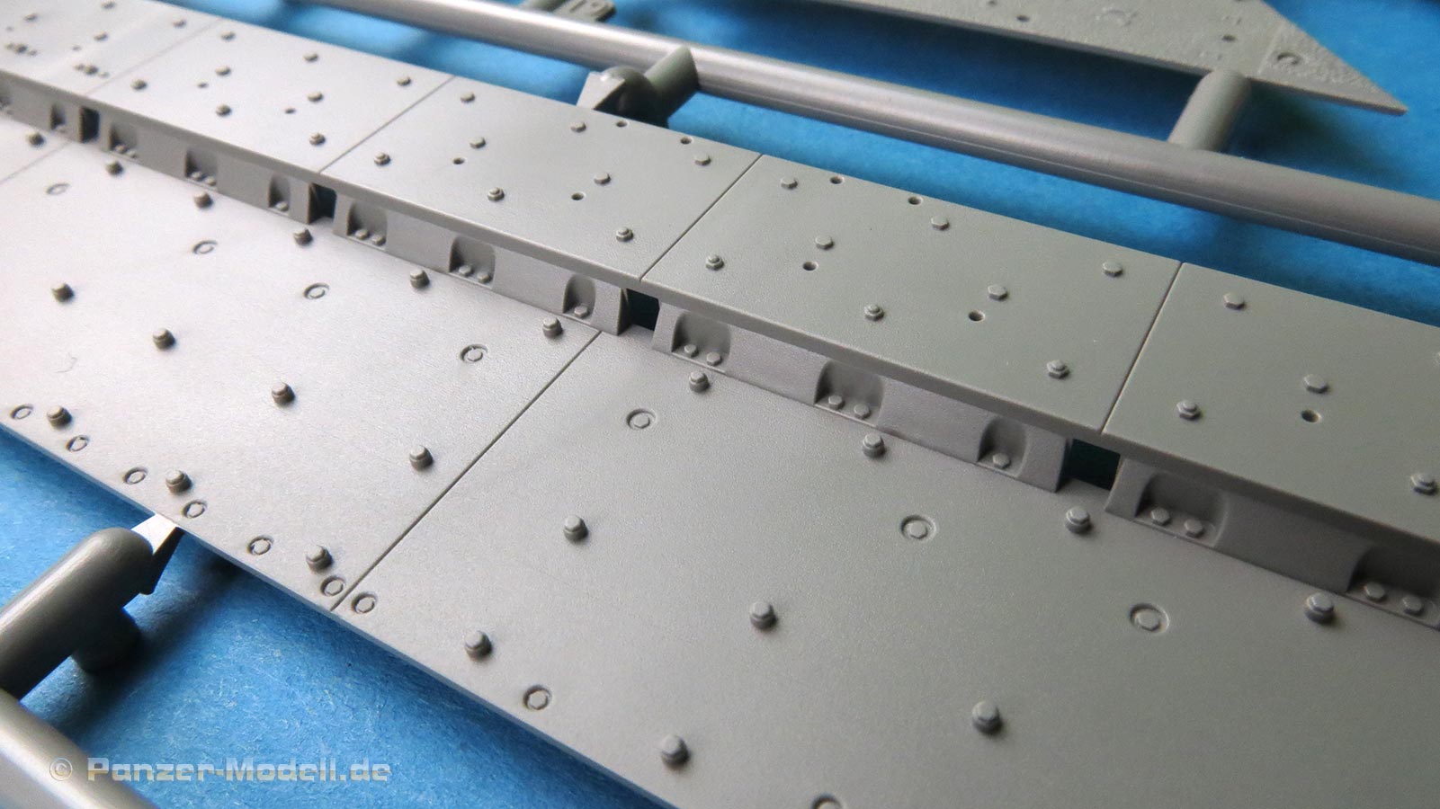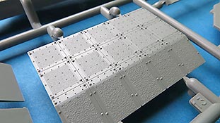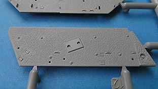 Die Seitenschürzen sind im großen einteilig und verfügen schon über sendationelle Oberflächendetails mit den versenkten und aufgesetzten Schraubenköpfen. Zusätzlich werden diverse Kleinteile an Griffen und PE Teilen, sowie einigen größeren Platten ergänzt.