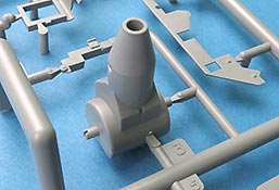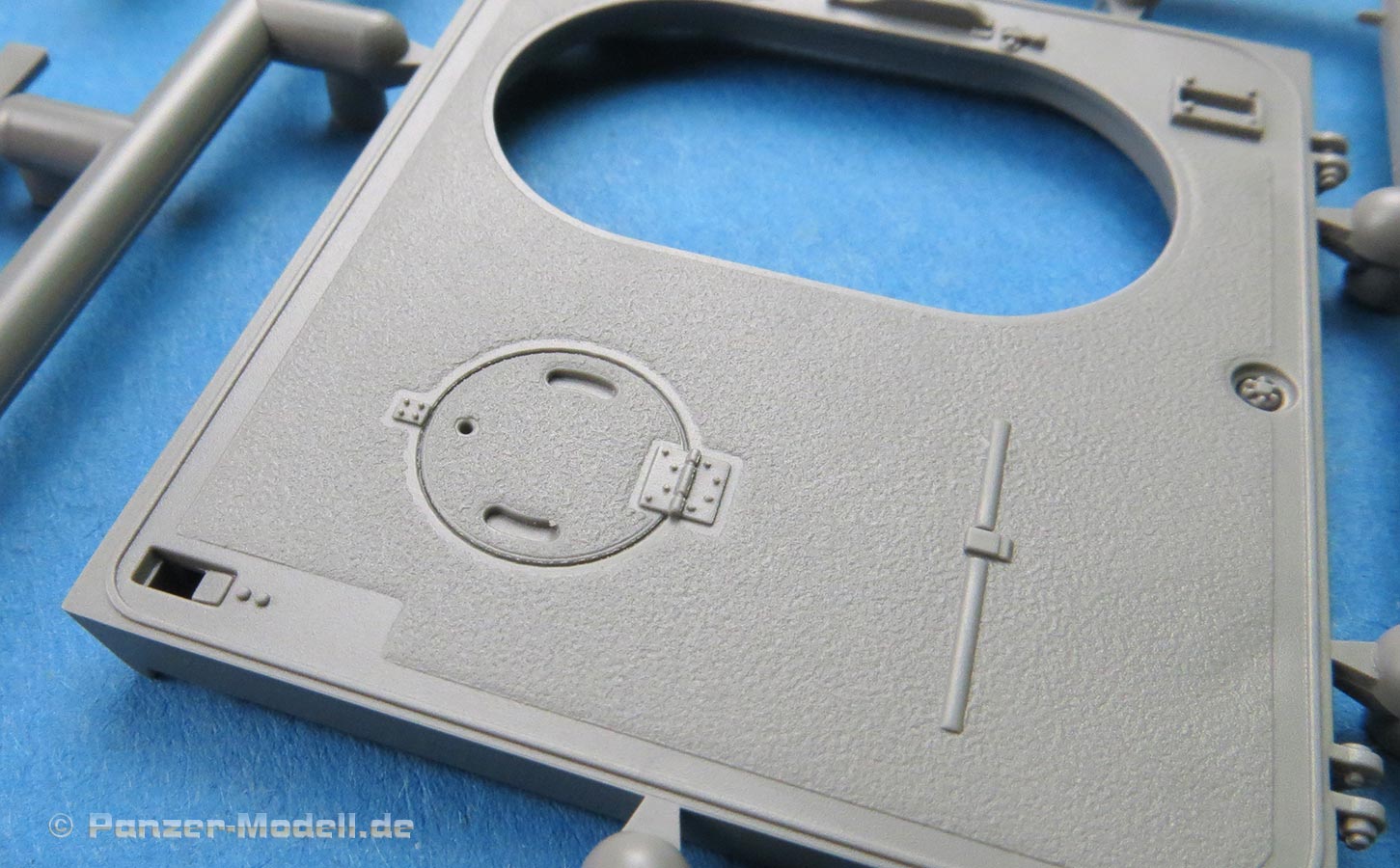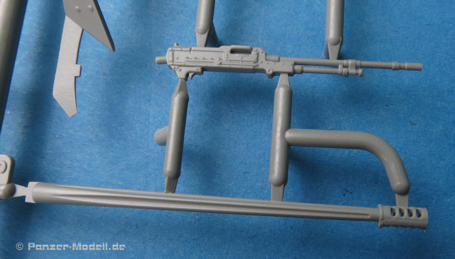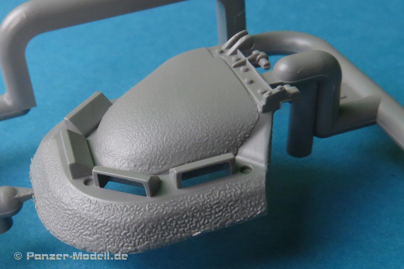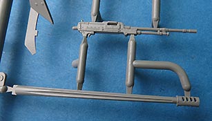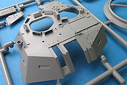 Der Turm ist mehrteilig und nimmt im Unterteil die Kanonenaufnahme beweglich auf. Das koaxiale MG ist einteilig gespritzt mit gute Details und dieses sitzt in einer separaten Halterung mit Gurtzuführer.