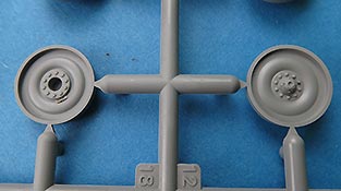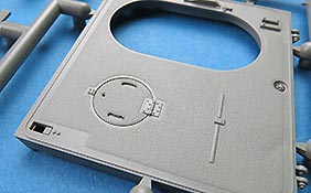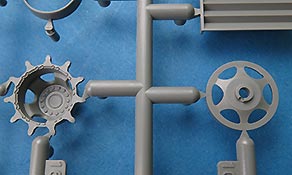 Die Unterwanne ist einteilig und die Schwingarme werden einzeln in die Aufnahmen eingeklebt. Das Laufwerk ist damit also nicht beweglich. Laufrollen und Treibräder setzen sich jeweils aus 4, die Treibräder aus 2 Bauteilen zusammen.