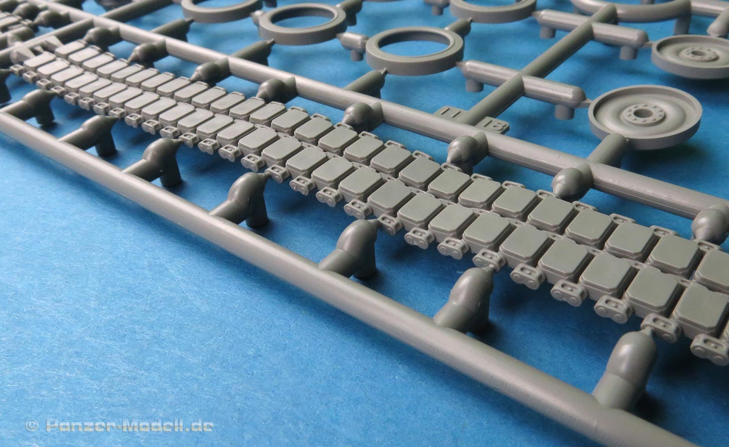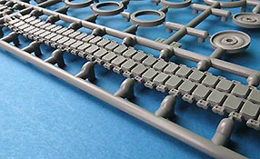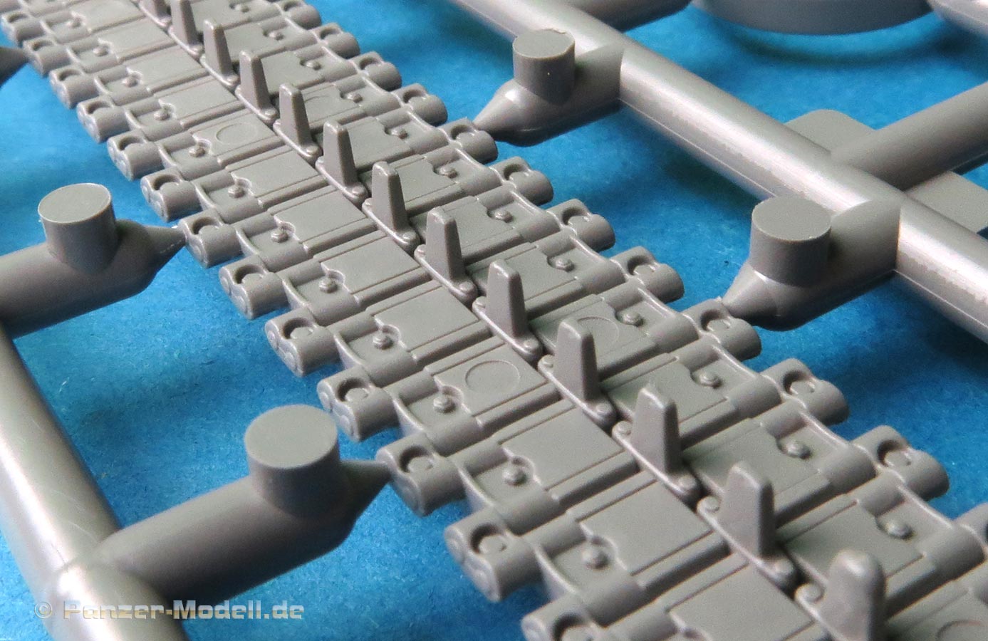 Die Details der Kettenteile sind ganz ausgezeichnet, sowohl die Gestaltung außen mit den Kettenpolstern als auch innen mit Führungszahn und Details in den Laufflächen. Leider finden sich auf den längeren Segmenten auf der Innenseite einige Auswerfermarken - inwieweit diese am Ende dann noch sichtbar sind, ist schwer zu beurteilen.