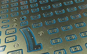Der große Optikkopf auf dem Turmdach setzte sich aus den einzelnen Platten und den großen Klarsichtflächen an der Front zusammen - auch hier kommen wieder die irisierenden Folien zum Einsatz. Die Front wird mit einem PE Schutzgitter versehen.