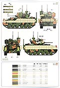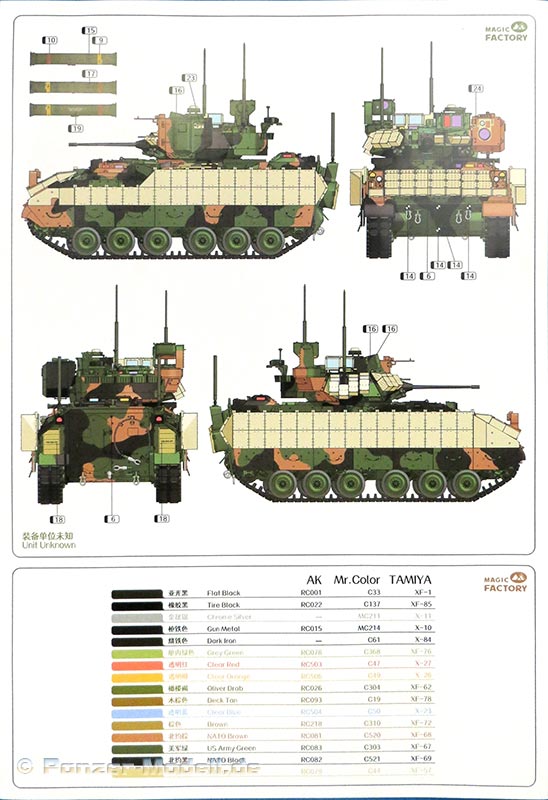 Eine doppelseitig, farbig gedruckte DIN A4 Seite zeigt zwei Bemalungs- und Markierungsvorschläge. Die Farbangaben sind für AK Real Colors, Mr.Color und Tamiya.