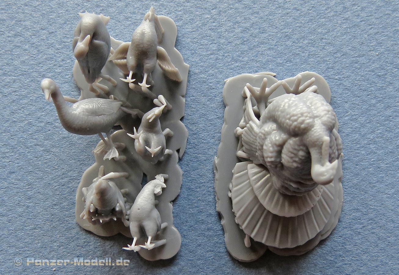 Im vorliegenden Set finden wir 2 Druckplatten mit insgesamt 7 Figuren an Federvieh, wie man sie für dörfliche Dioramen und Bauernhöfe nutzen kann.