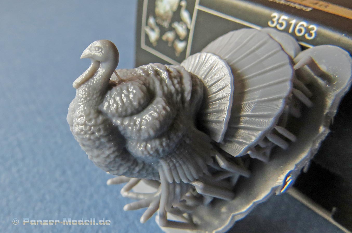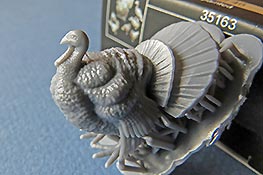 Bitte bedenkt das es sich bei 3d Druck um Resin handelt, also Grundieren nicht vergessen und Sekundenkleber zum fixierenDer größte Brocken ist der Truthahn mit aufgestellten Schwanzfedern. Hier sind die Darstellungen des Federkleids und der Details wirklich sehr überzeugend.